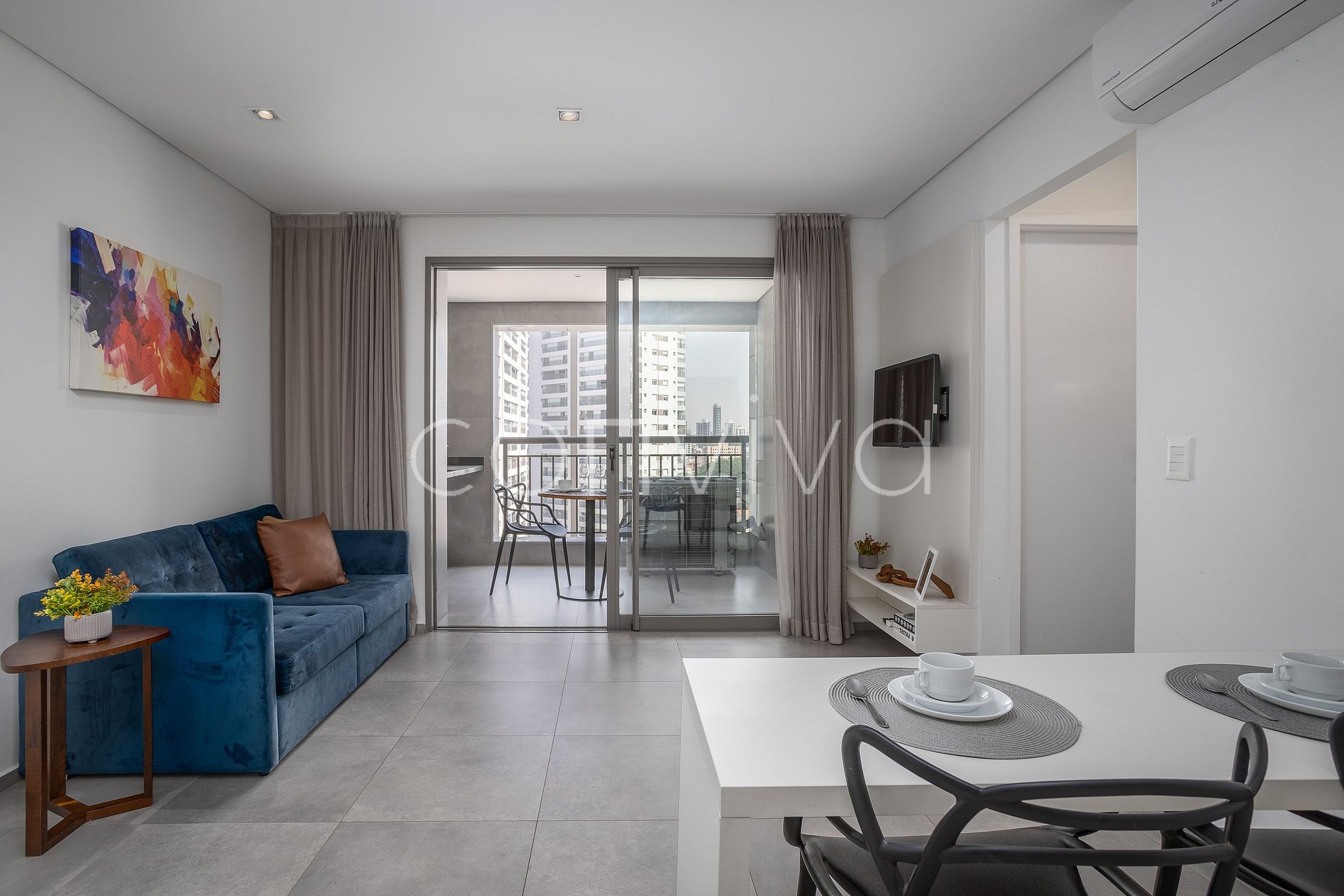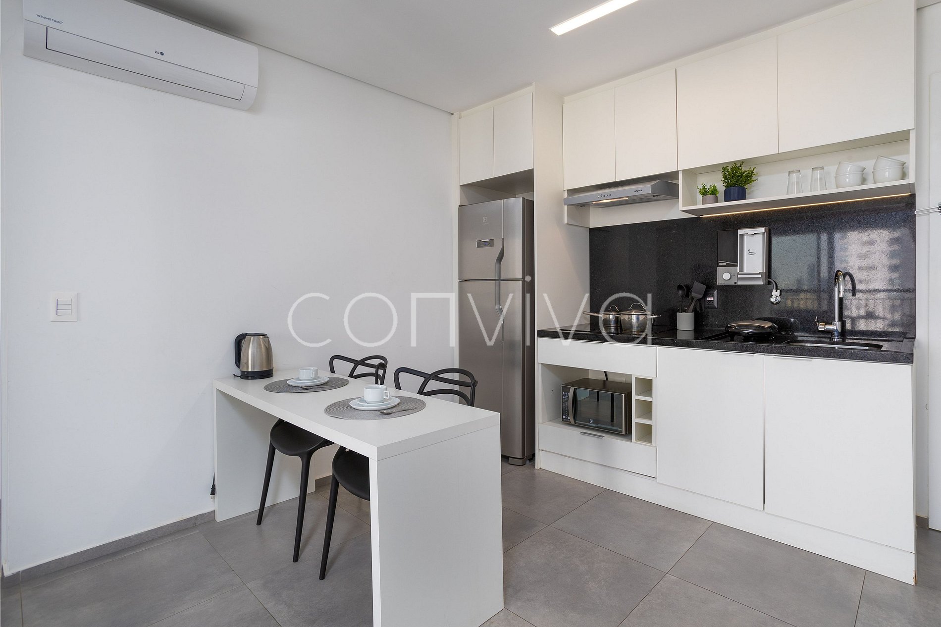 Con 57m², en el 2º piso, el piso dispone de dos habitaciones, una con cama de matrimonio y otra con cama individual y espacio para home office, cocina equipada, baño, sofá y balcón con vistas al barrio.