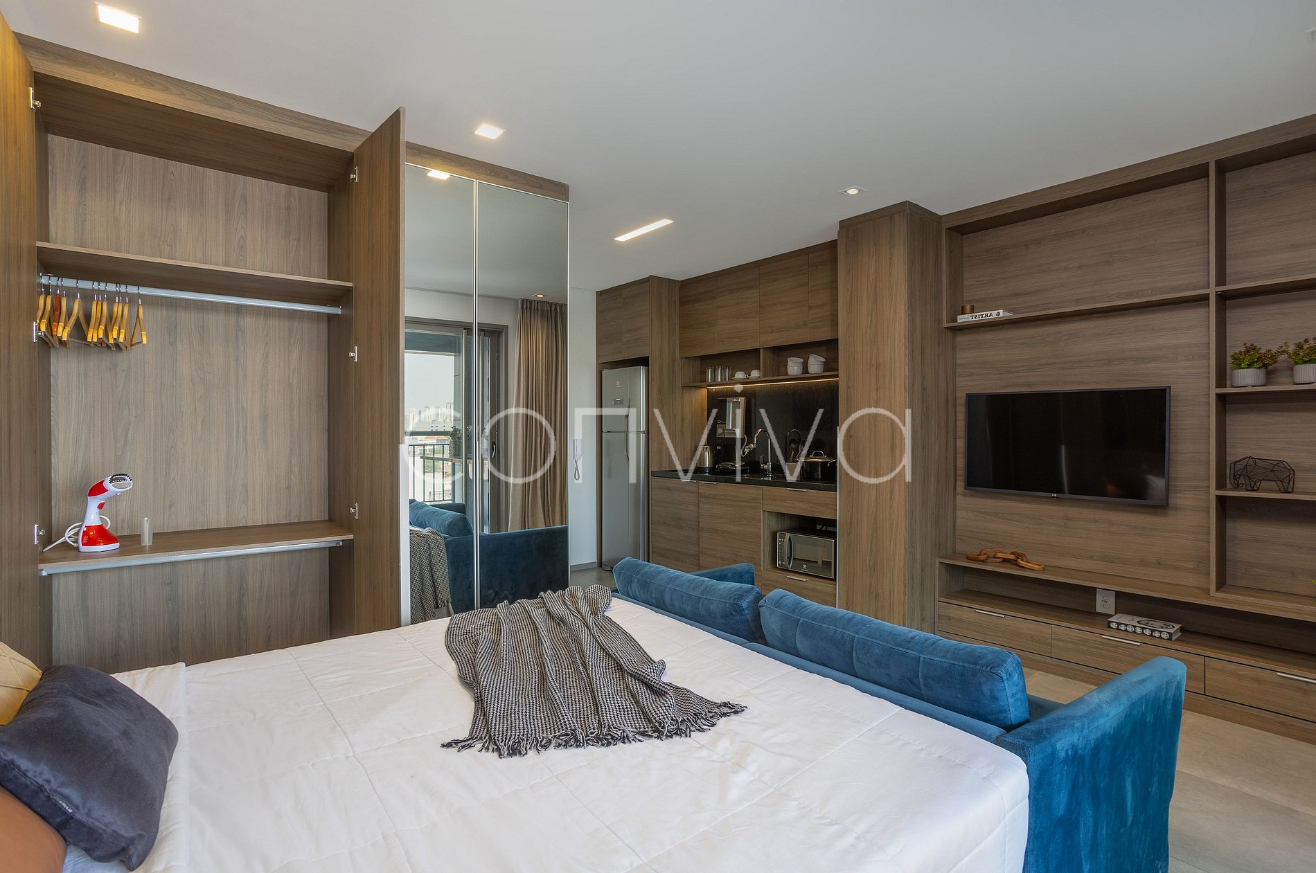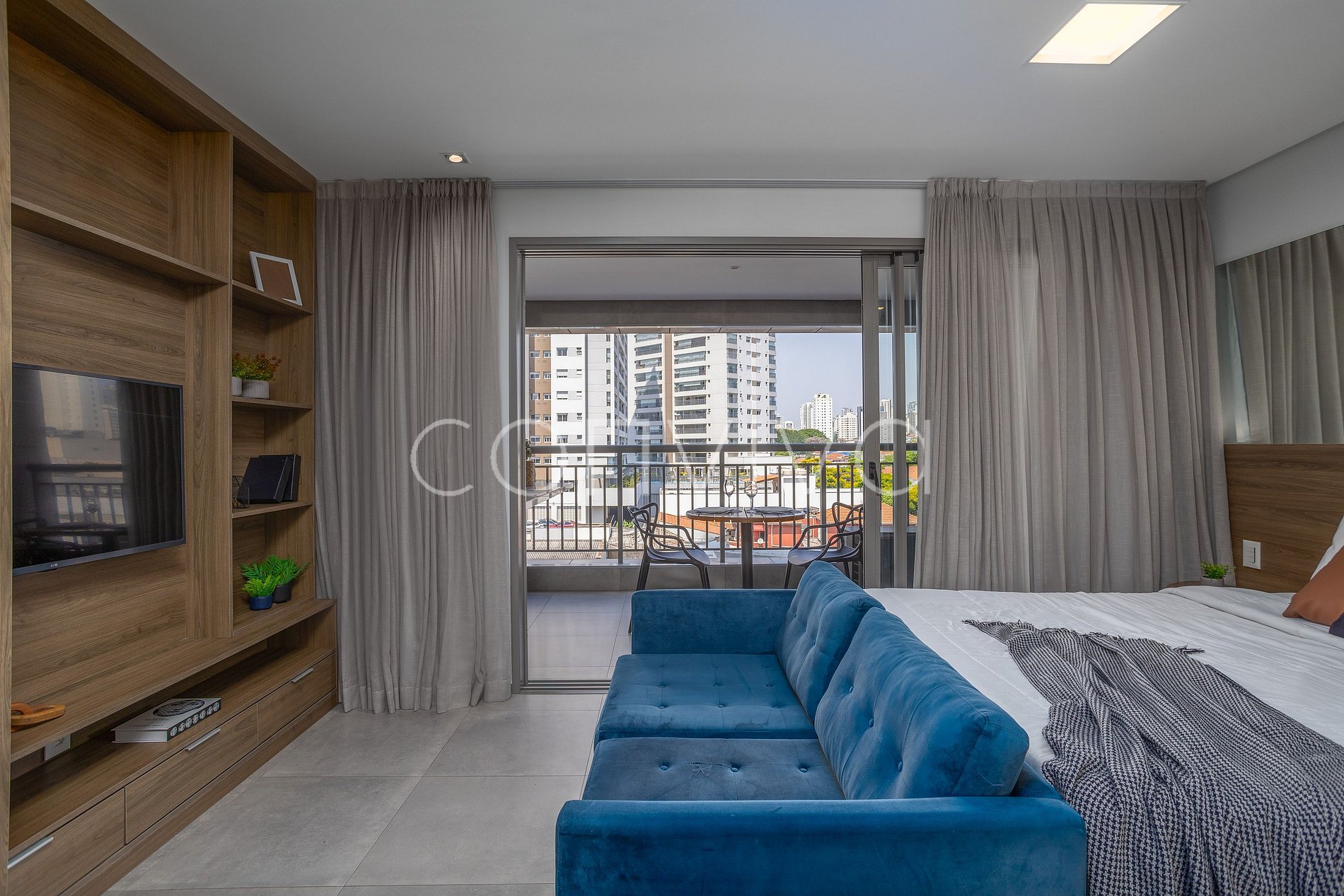 Un espacio de 35m² en el 4º piso con cama de matrimonio, sofá, cuarto de baño, cocina completa y amplio balcón.