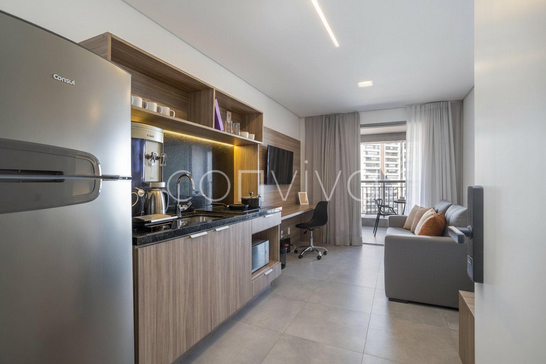 Está en el 11º piso y tiene cama de matrimonio, sofá, baño, cocina completa y balcón.
