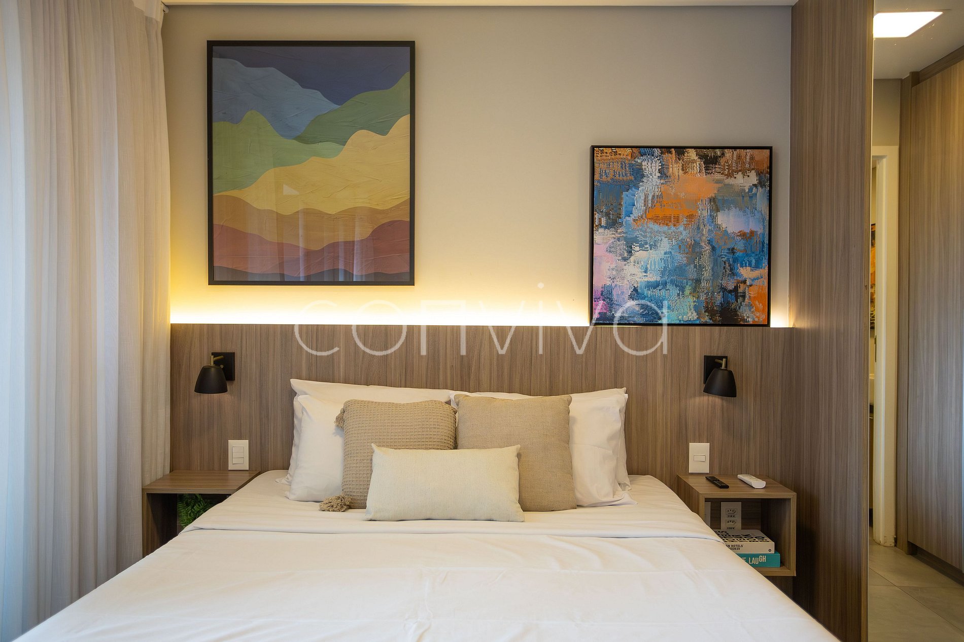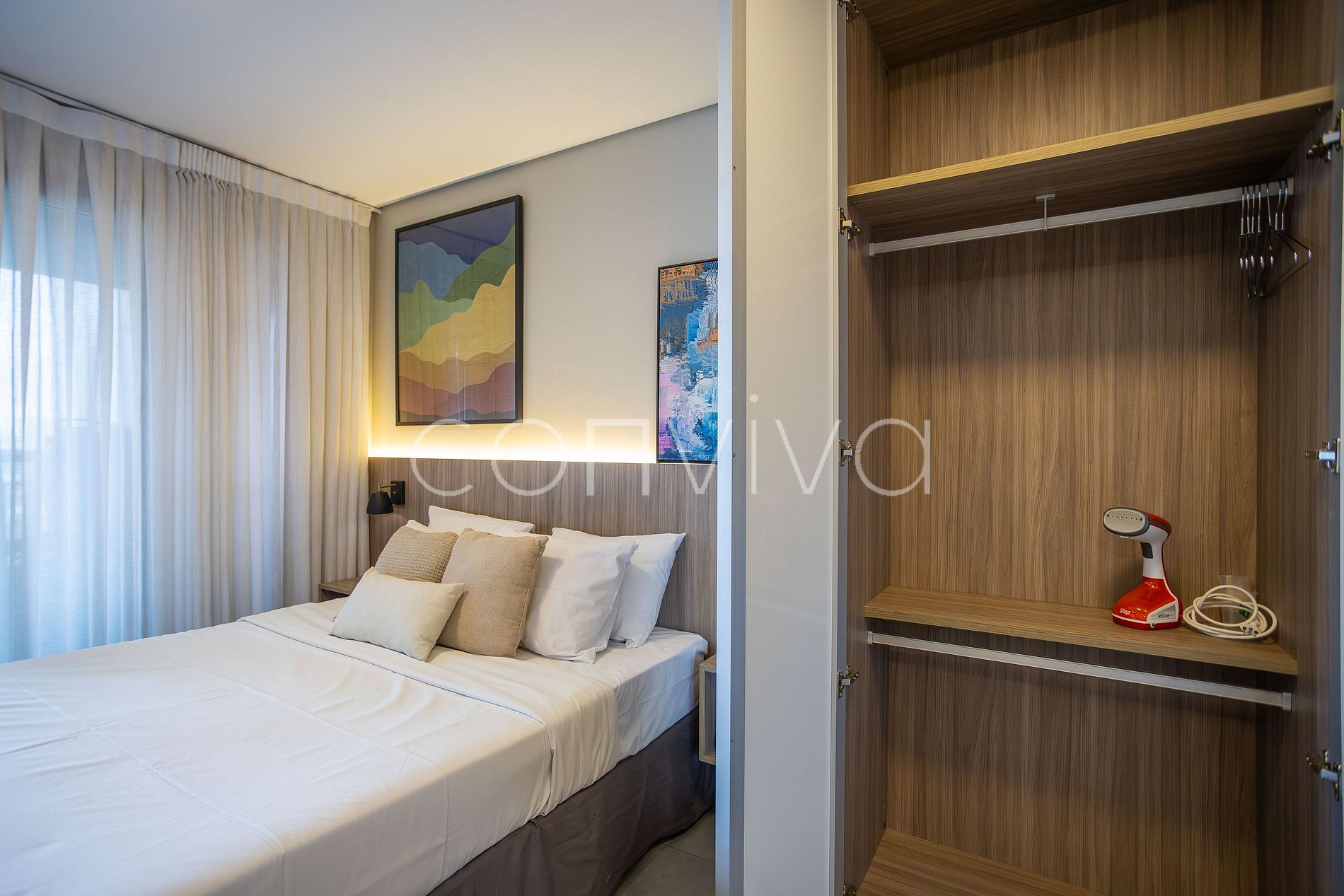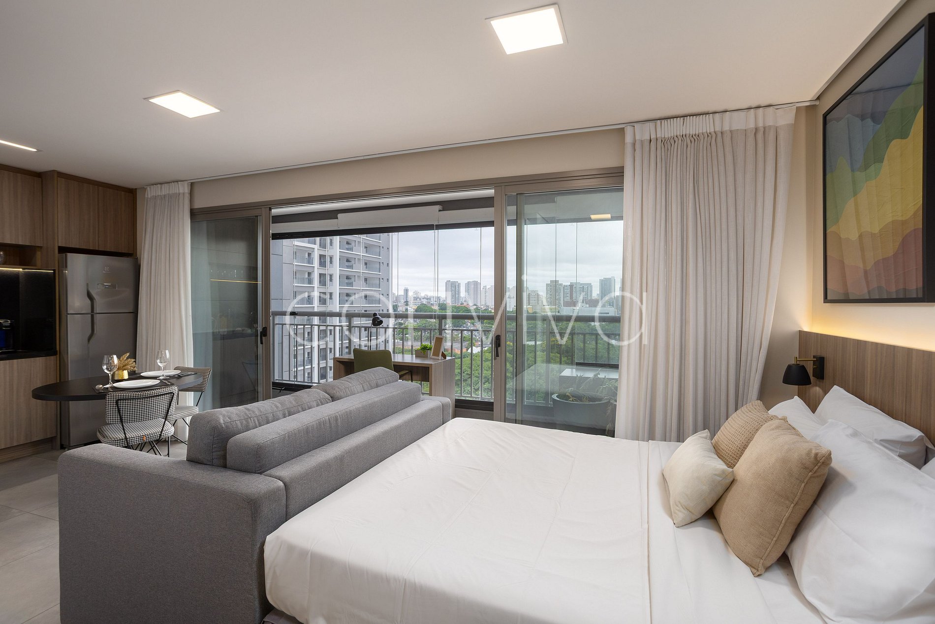 Con 35m², en el 9º piso, el estudio tiene una cama de matrimonio, espacio para home office, cocina completa, baño, sofá y balcón con vistas al barrio.