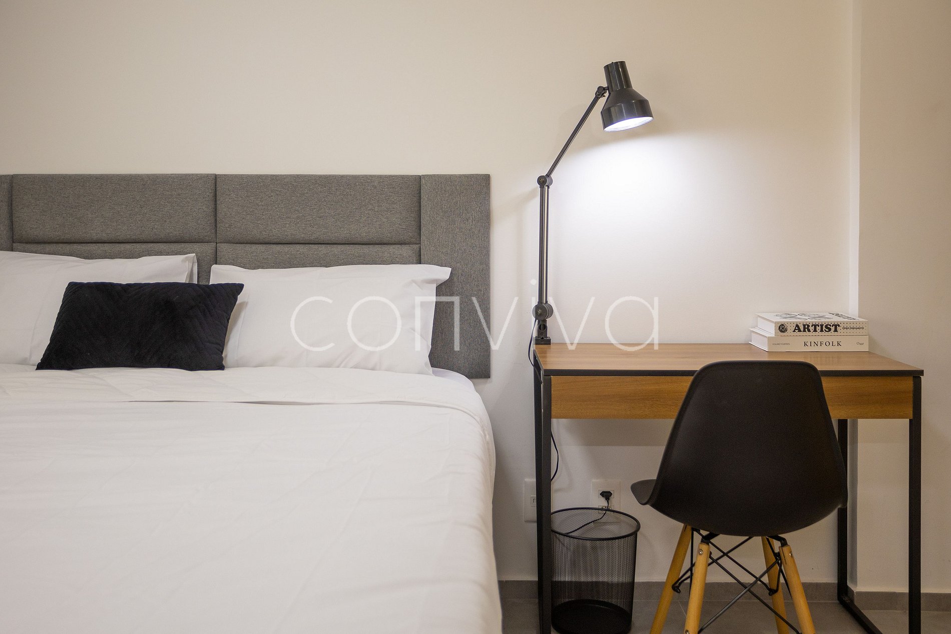 Espaço de 35m², no 4º andar, composto por uma cama de casal, sofá, espaço para home office, banheiro, cozinha completa e varanda.