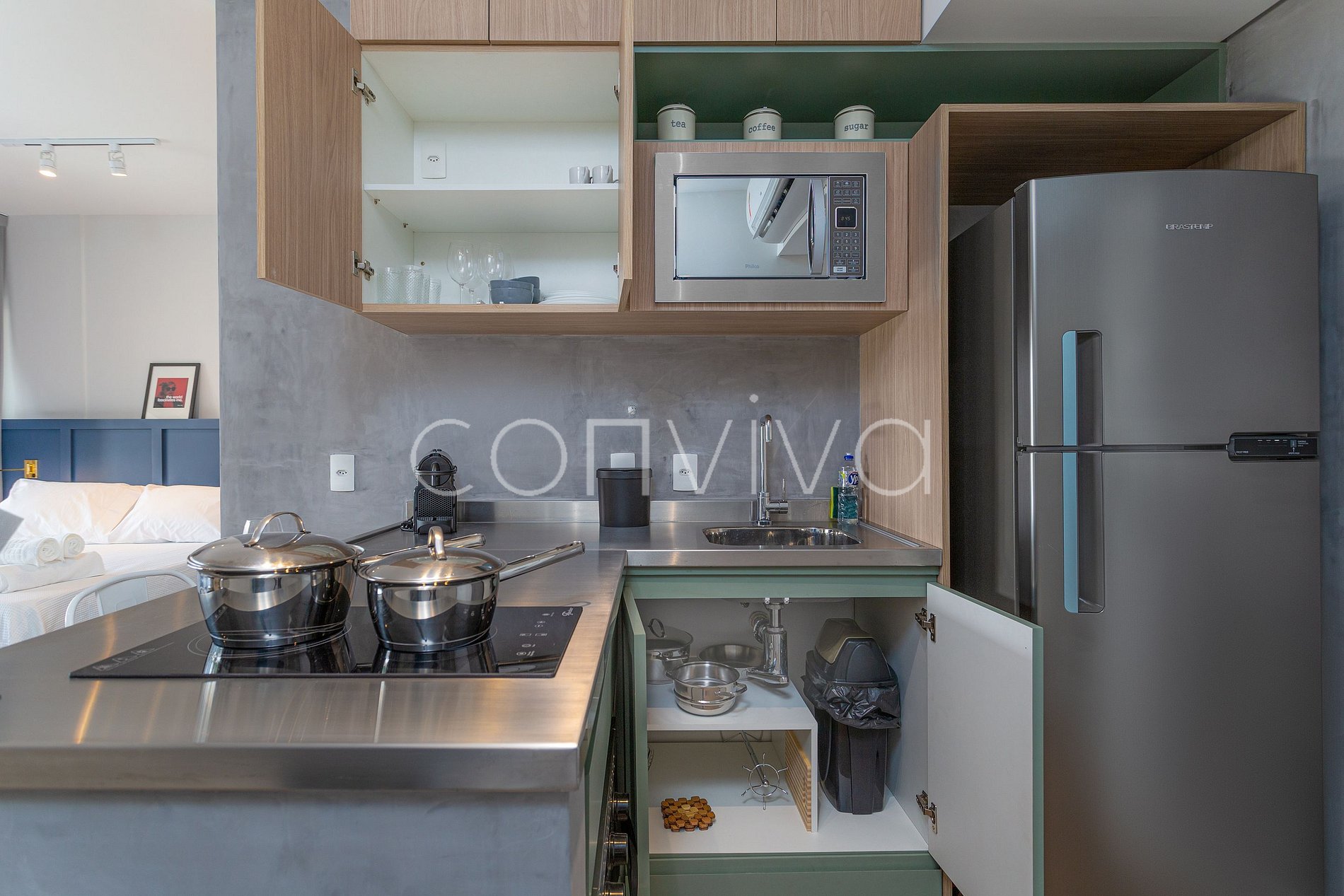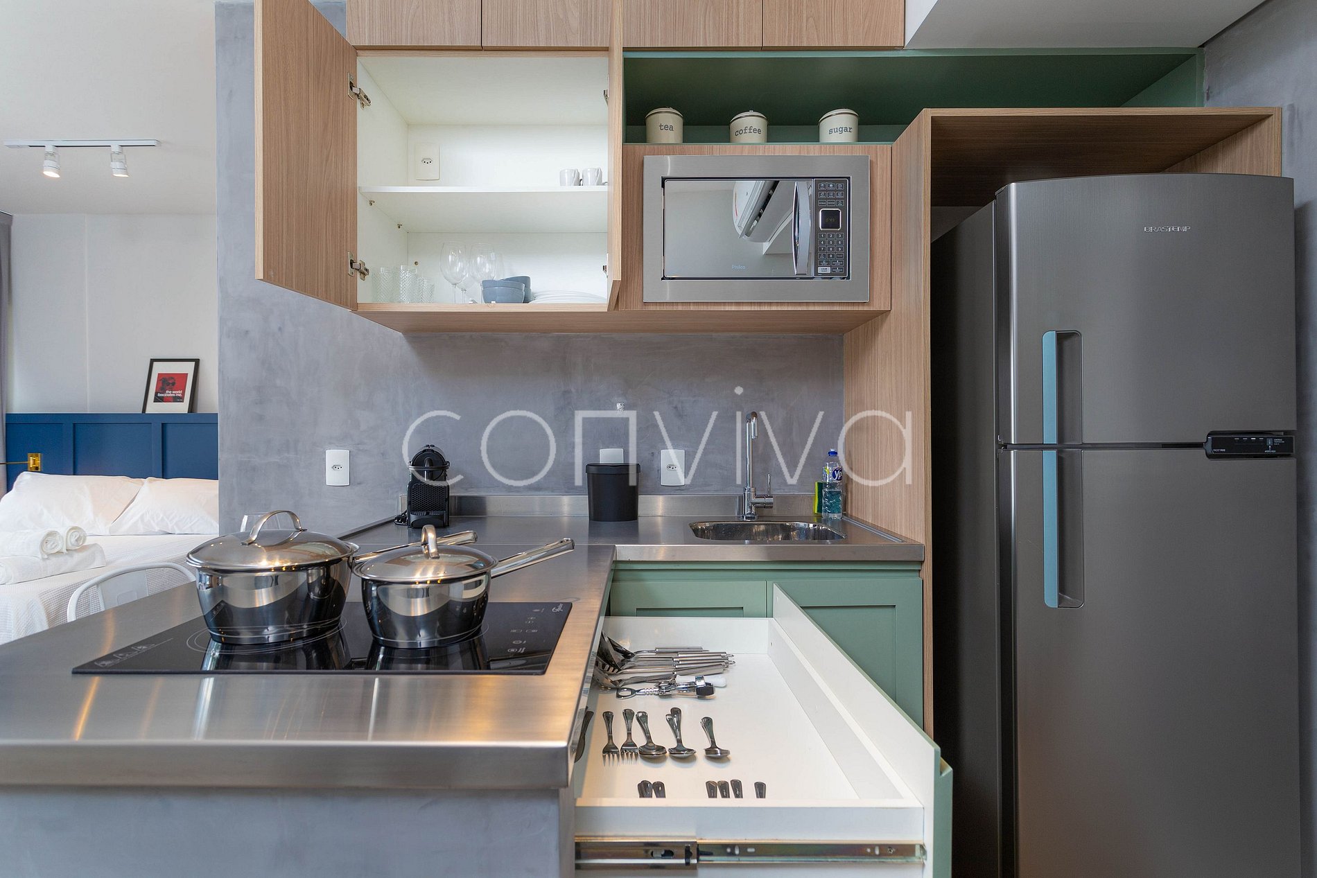 Con 45m², en el 2º piso, una cama queen size, sofá, baño y cocina americana, en la mejor zona de São Paulo.