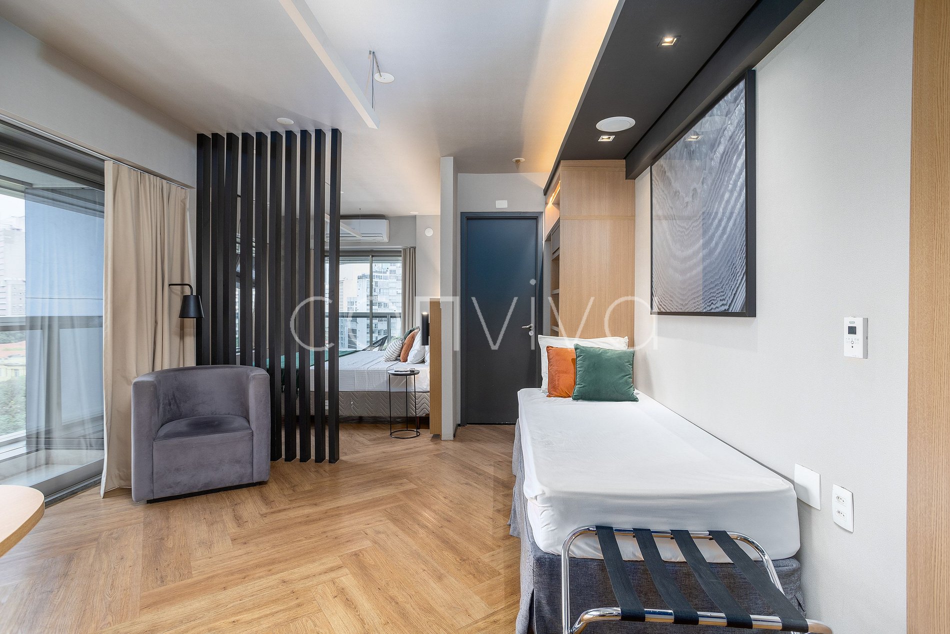 Espacio de 48m², en el 10º piso, con una cama king size en el dormitorio y una cama individual en el salón, balcón, cocina americana y cuarto de baño.