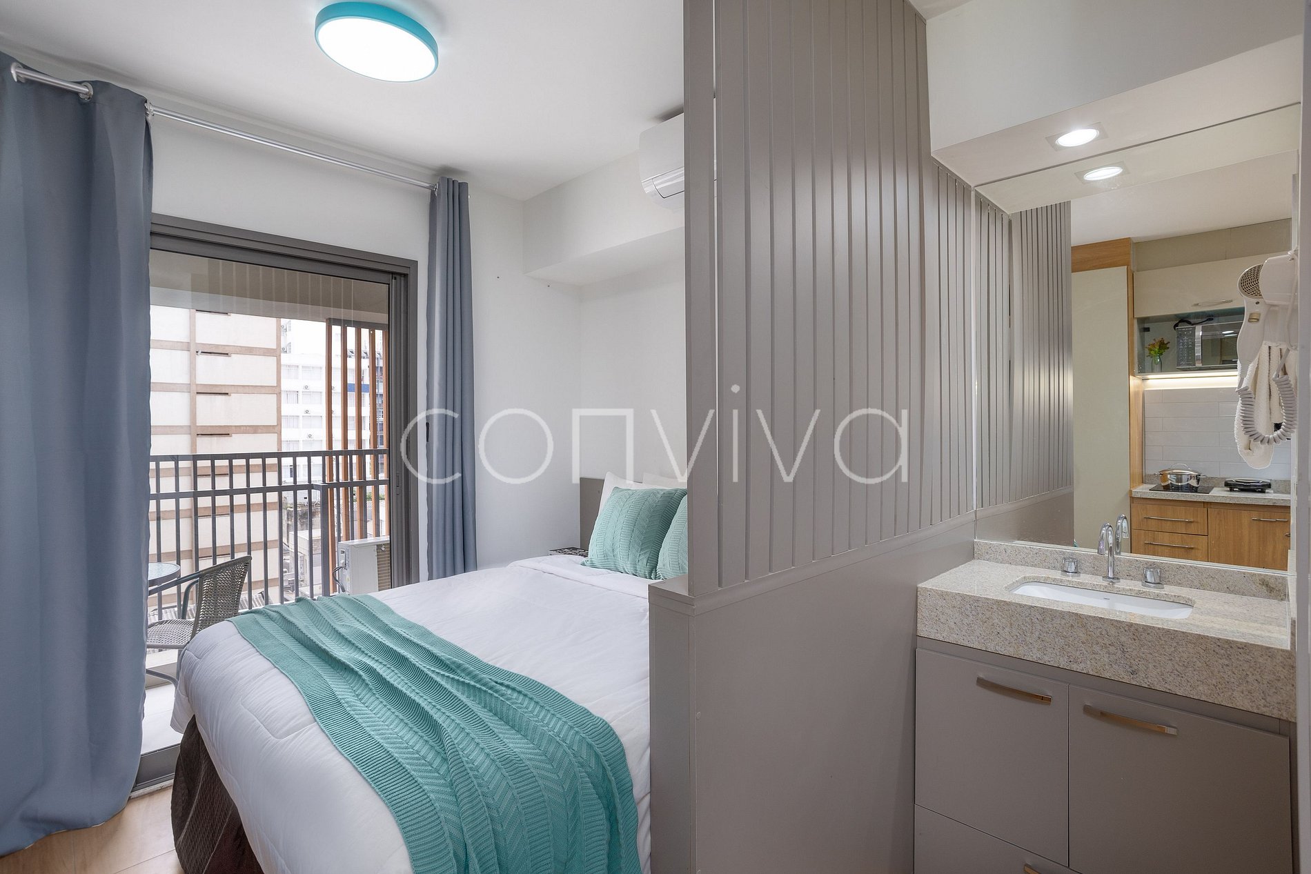 Desfrute de São Paulo no 6º andar. Studio moderno de 22m² com cama queen, varanda com vista para a cidade, cozinha completa, Wi-Fi, Smart TV e ar-condicionado.