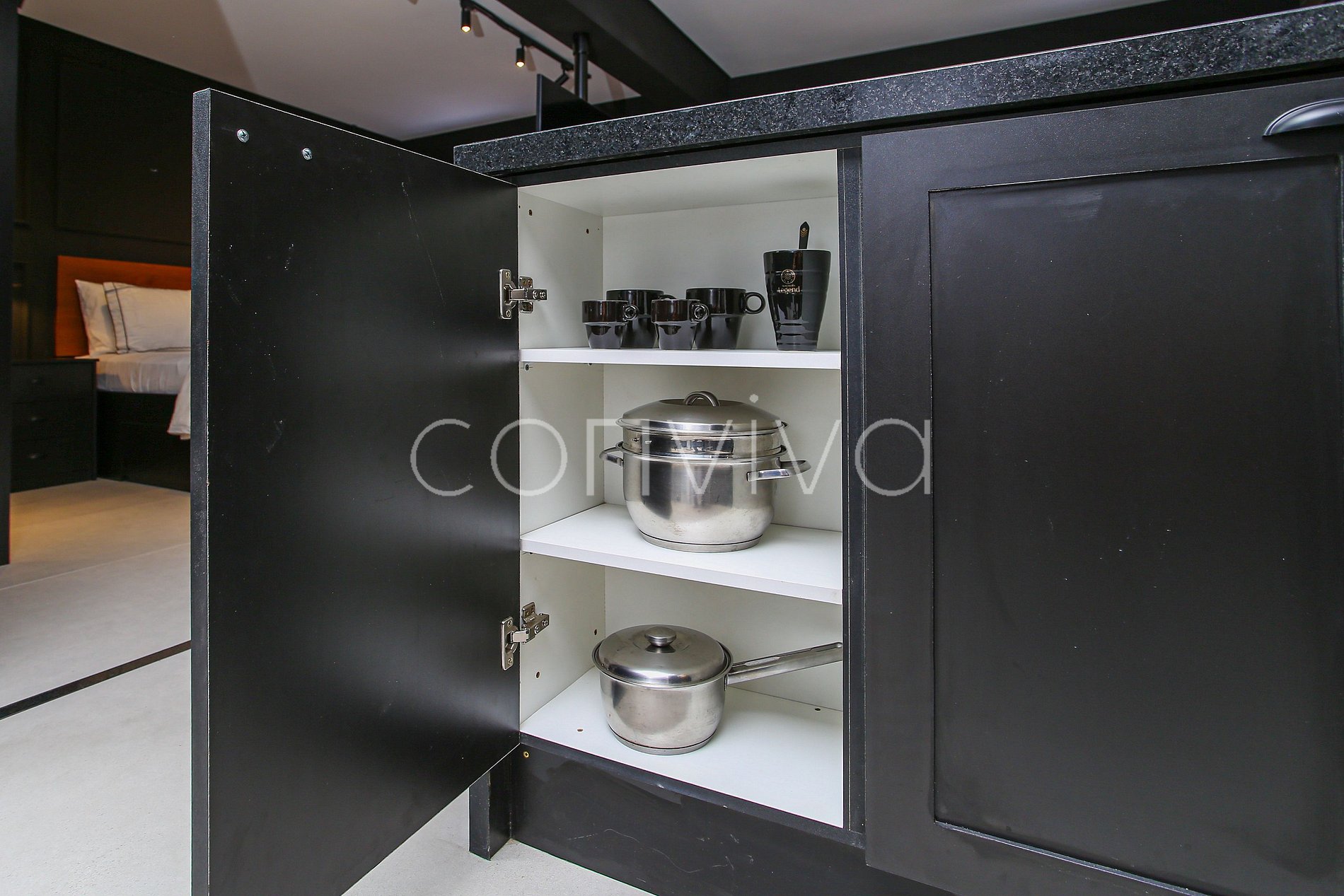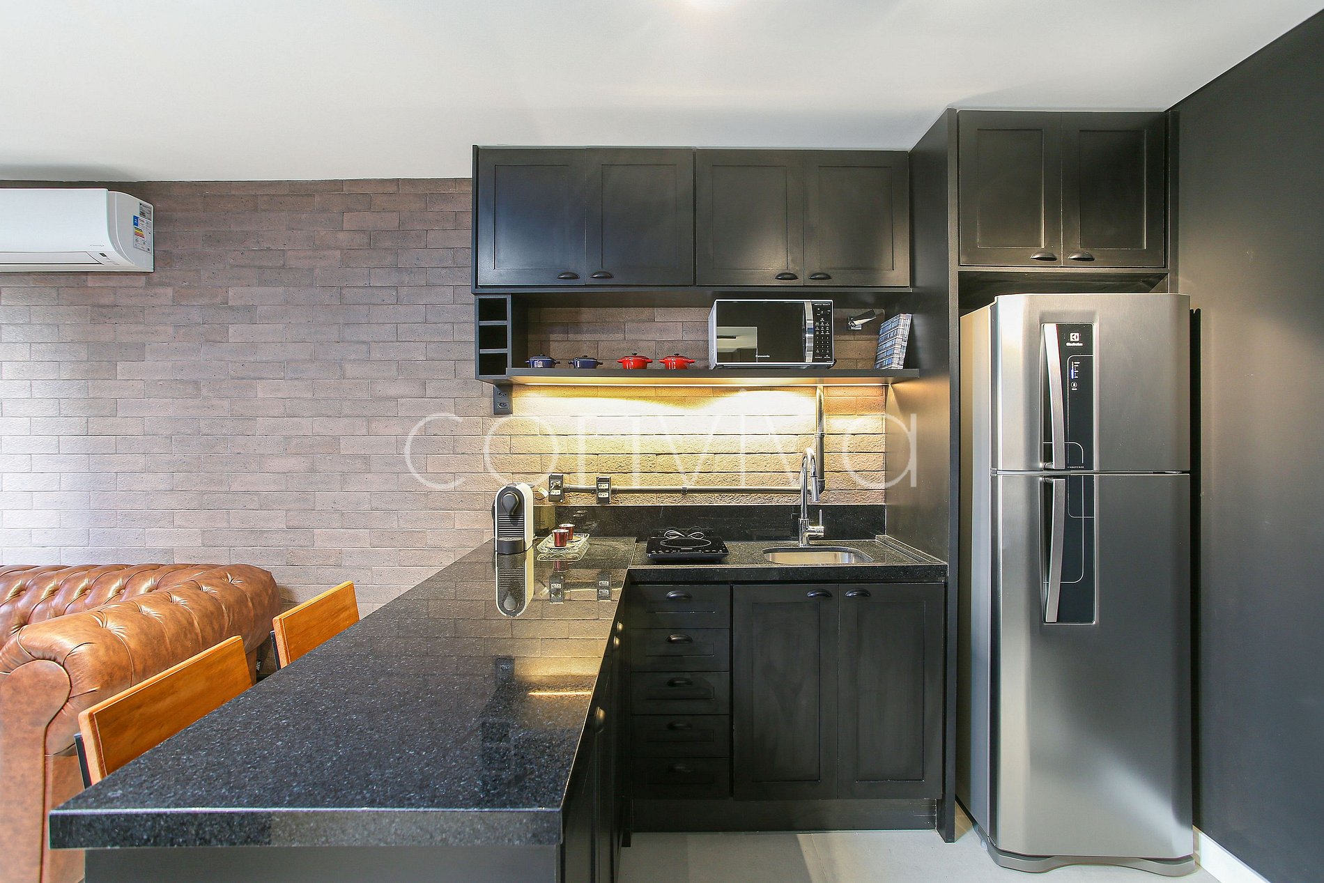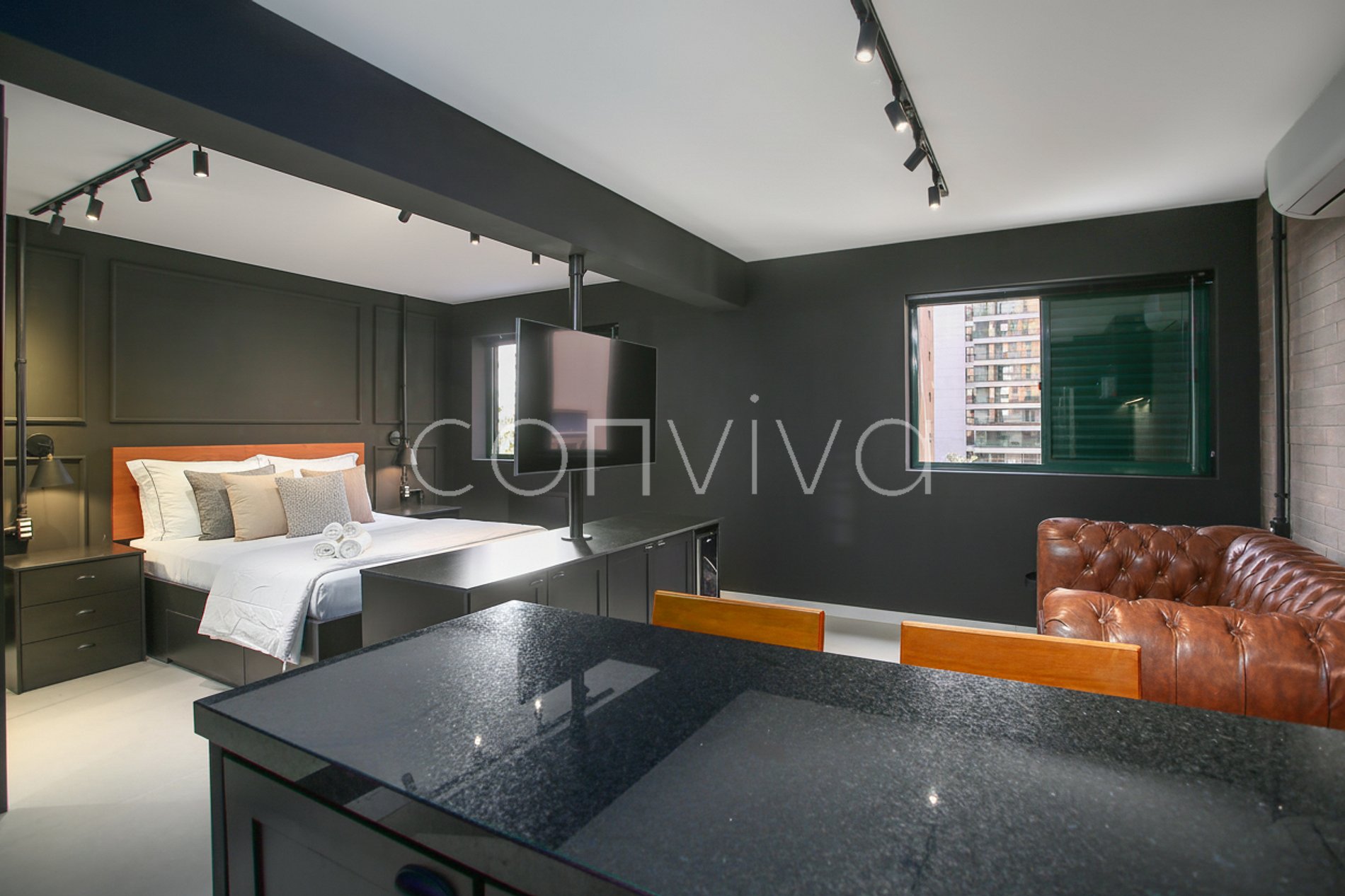 Espacio de 40m², situado en la 3ª planta, con cama de matrimonio, sofá, cuarto de baño y cocina americana con utensilios de primera calidad, cerca de la Avenida Brigadeiro Faria Lima.