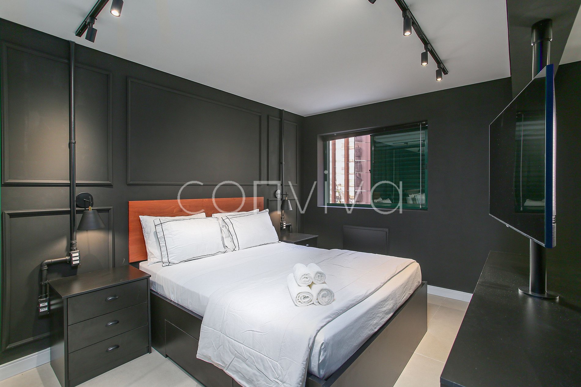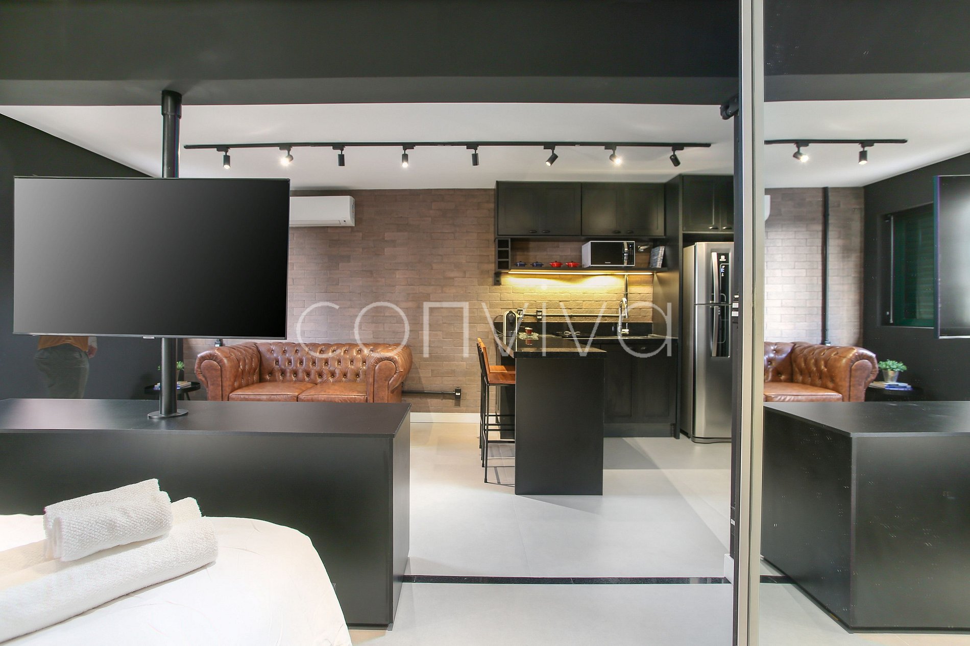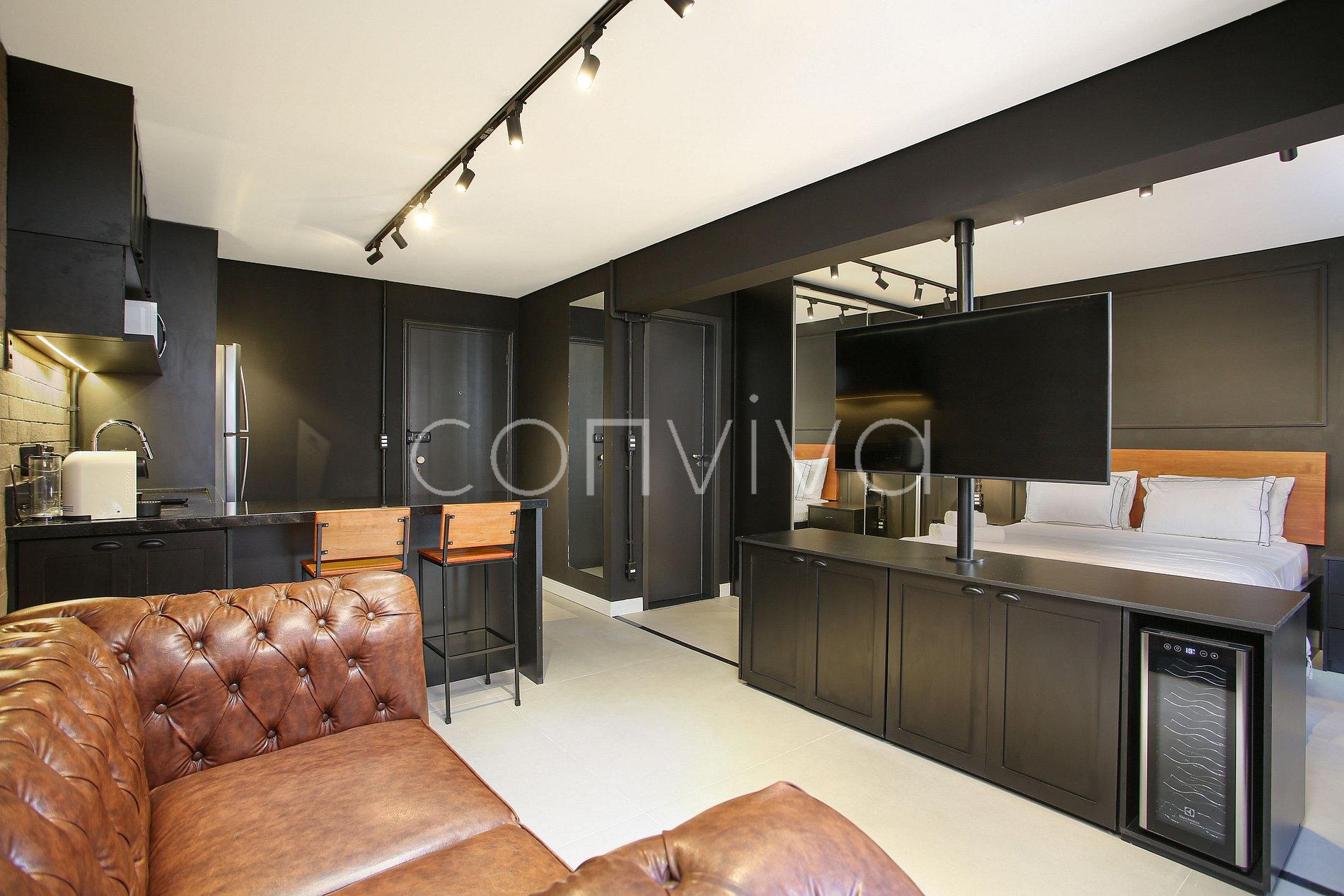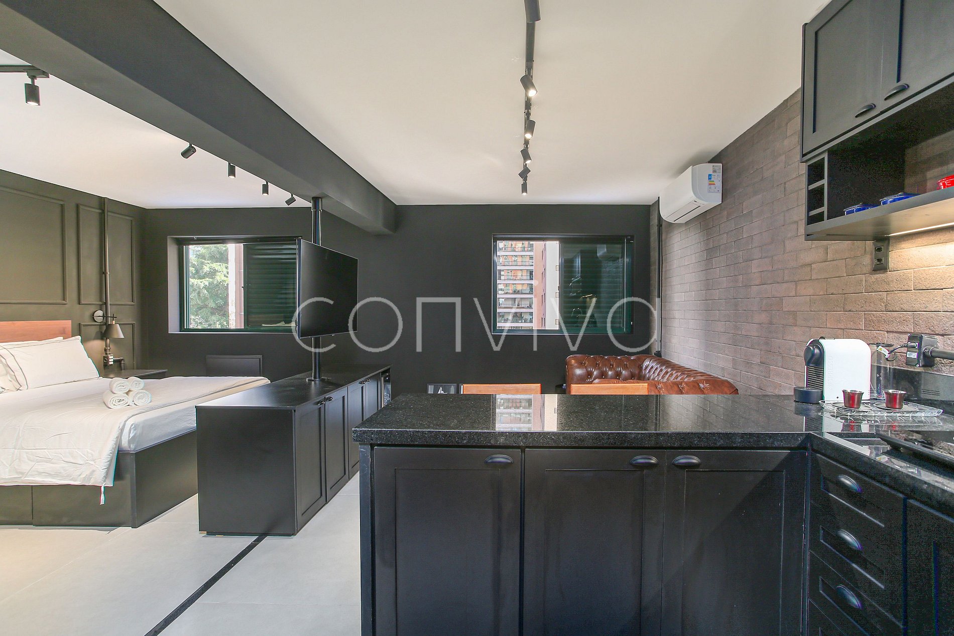 Espacio de 40m², situado en la 3ª planta, con cama de matrimonio, sofá, cuarto de baño y cocina americana con utensilios de primera calidad, cerca de la Avenida Brigadeiro Faria Lima.