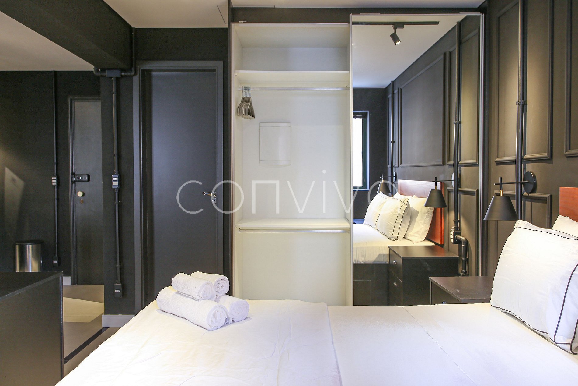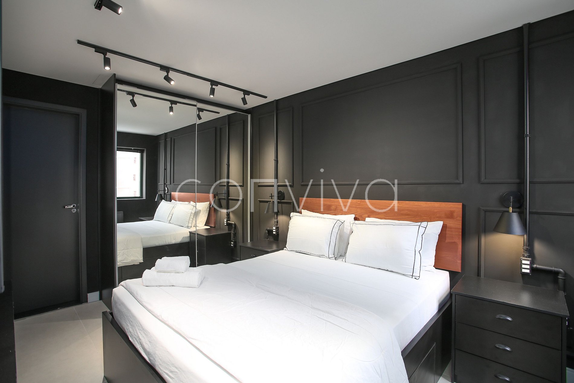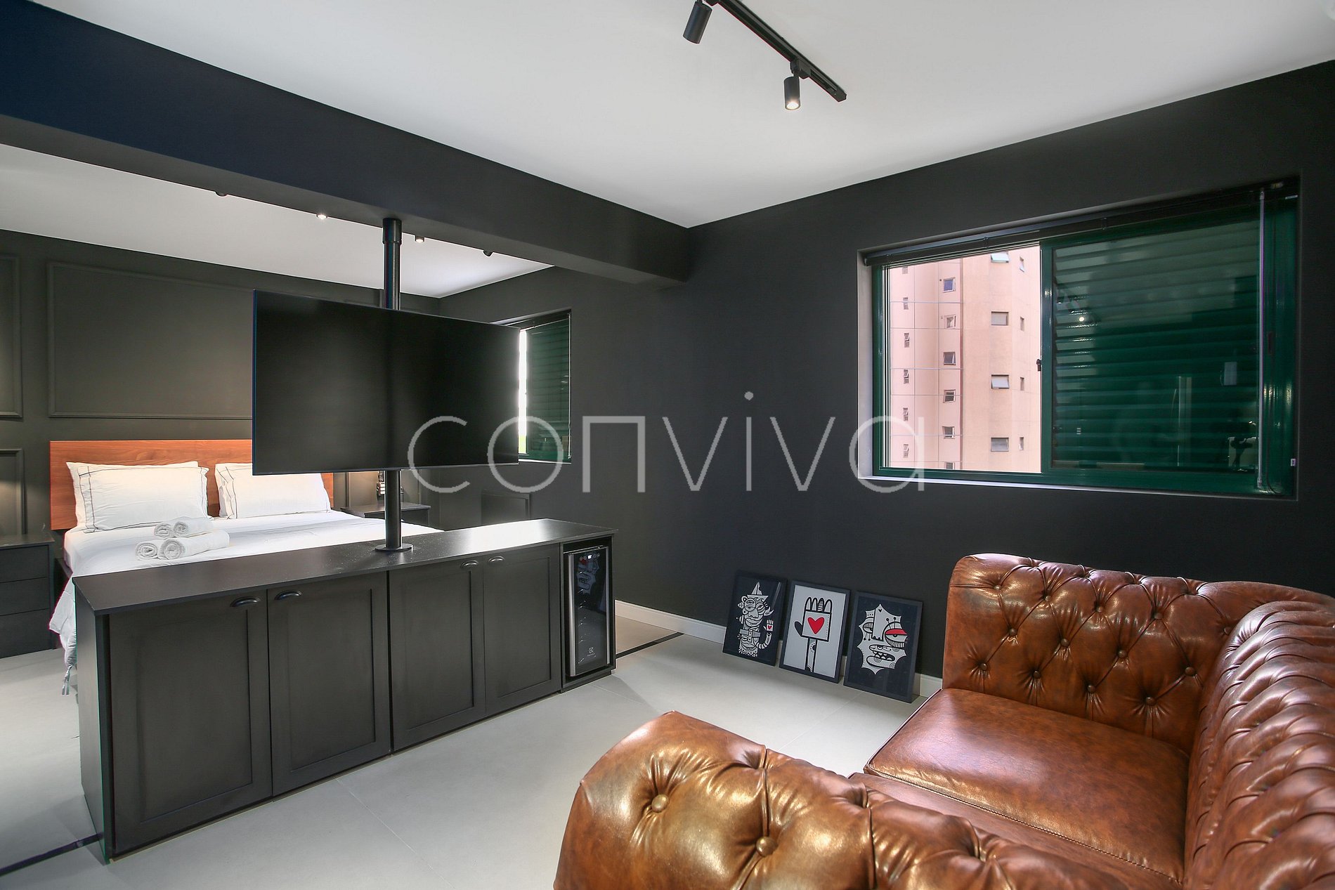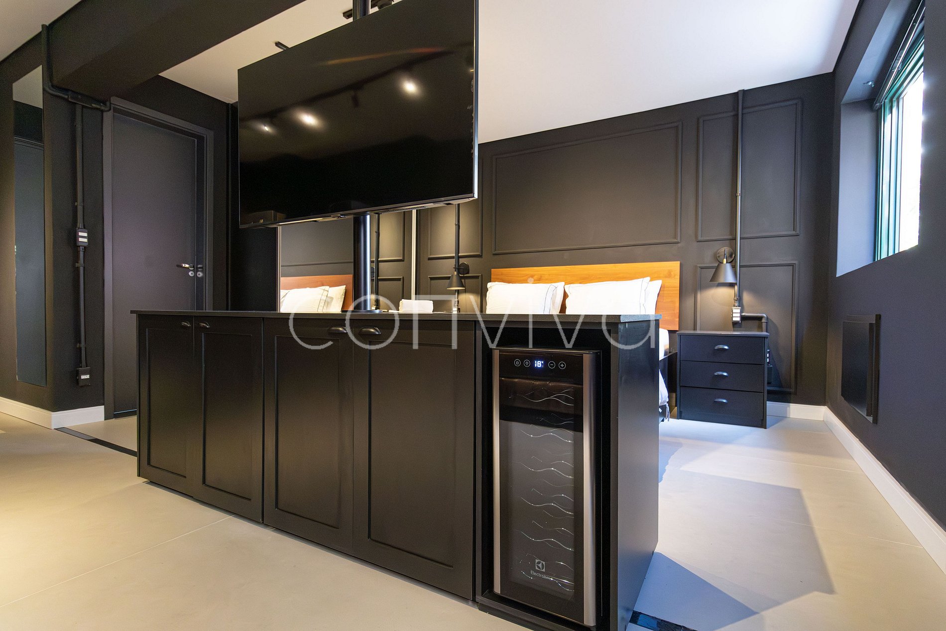 Espacio de 40m², situado en la 3ª planta, con cama de matrimonio, sofá, cuarto de baño y cocina americana con utensilios de primera calidad, cerca de la Avenida Brigadeiro Faria Lima.
