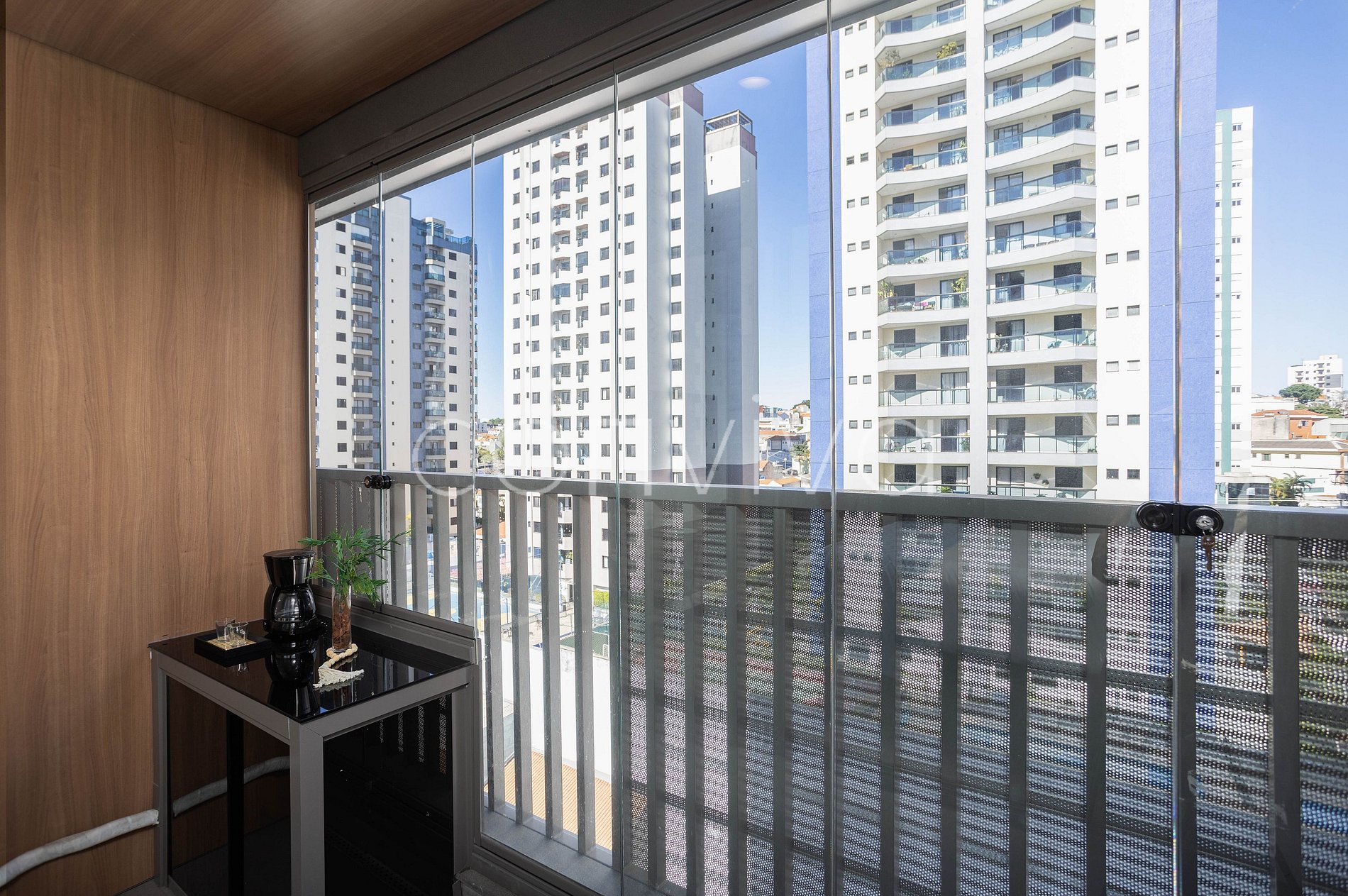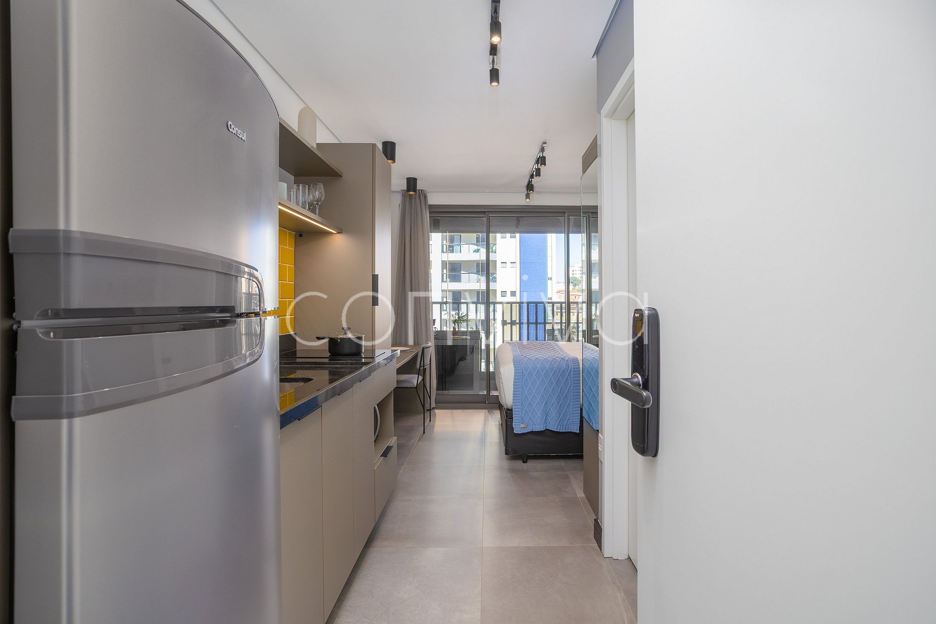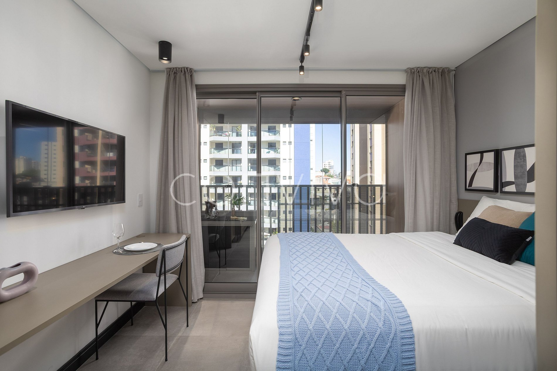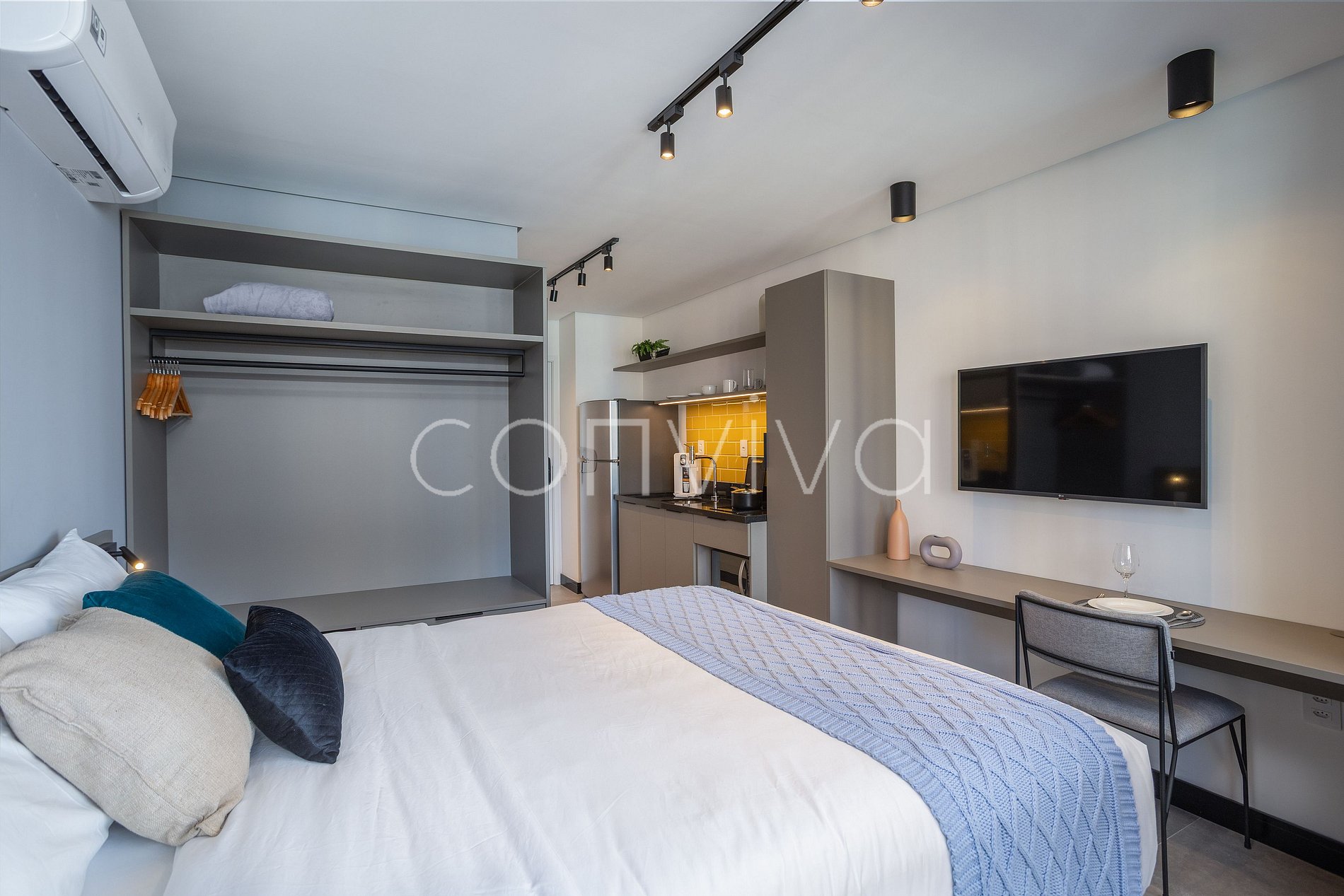 Studio de 25m², no 8º andar, com cama queen size, cozinha compacta, espaço para refeições e home office, banheiro espaçoso e varanda fechada.
