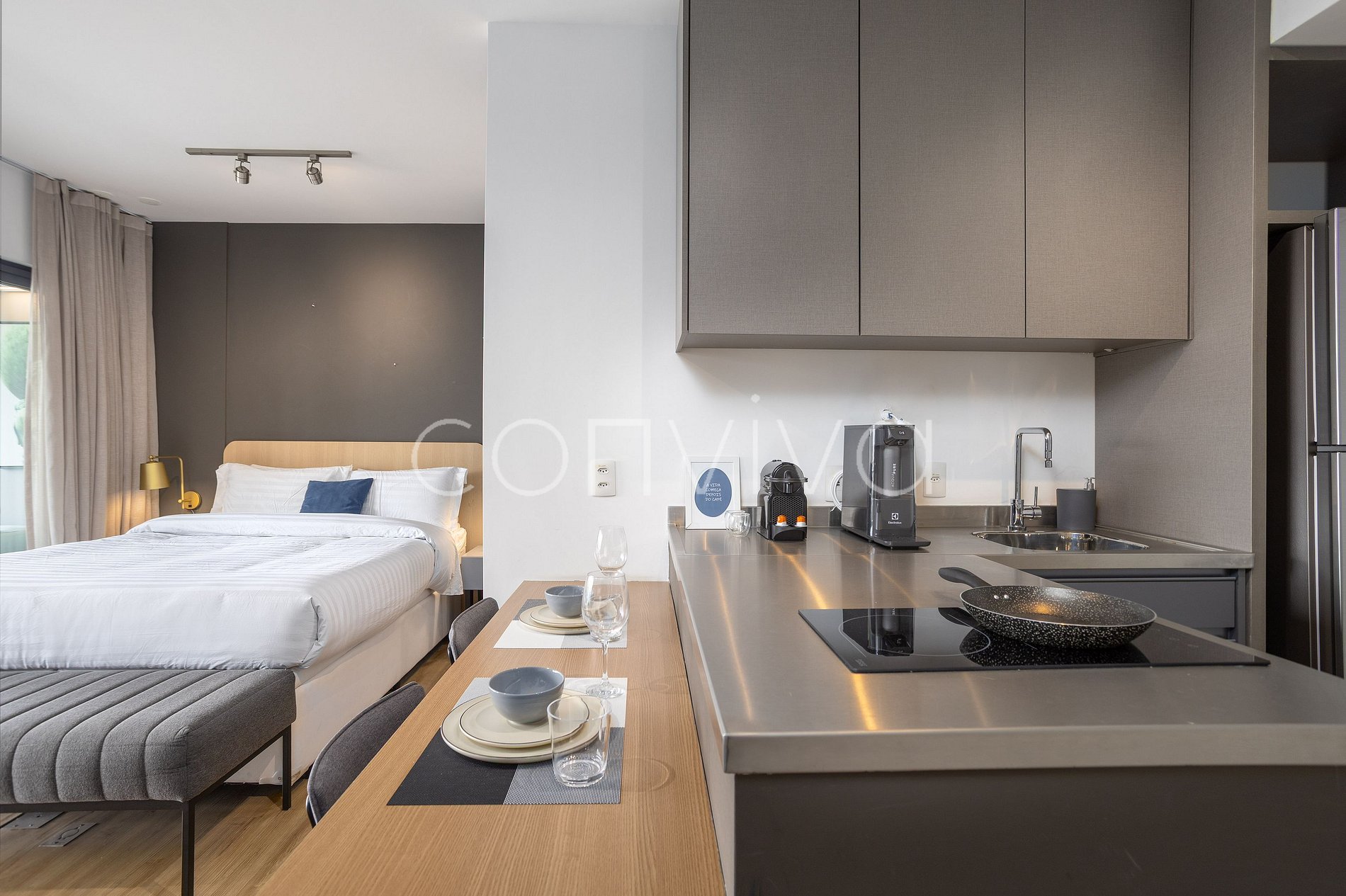 Espaço de 46m², no 8º andar, com uma cama queen size, banheiro, cozinha compacta e varanda com espaço para home offfice.