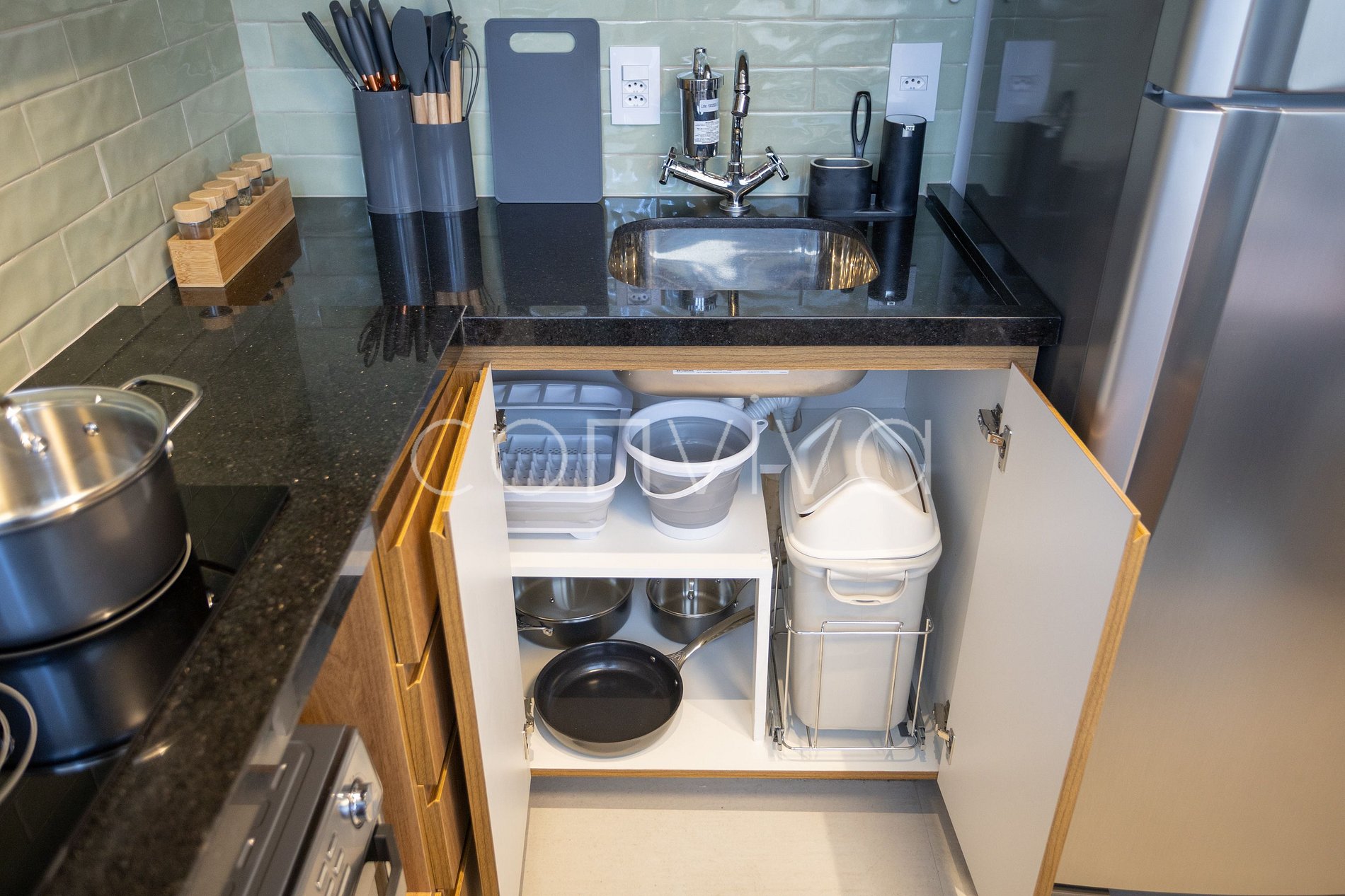 Studio completo conta com uma cama queen, banheiro espaçoso e cozinha totalmente equipada.