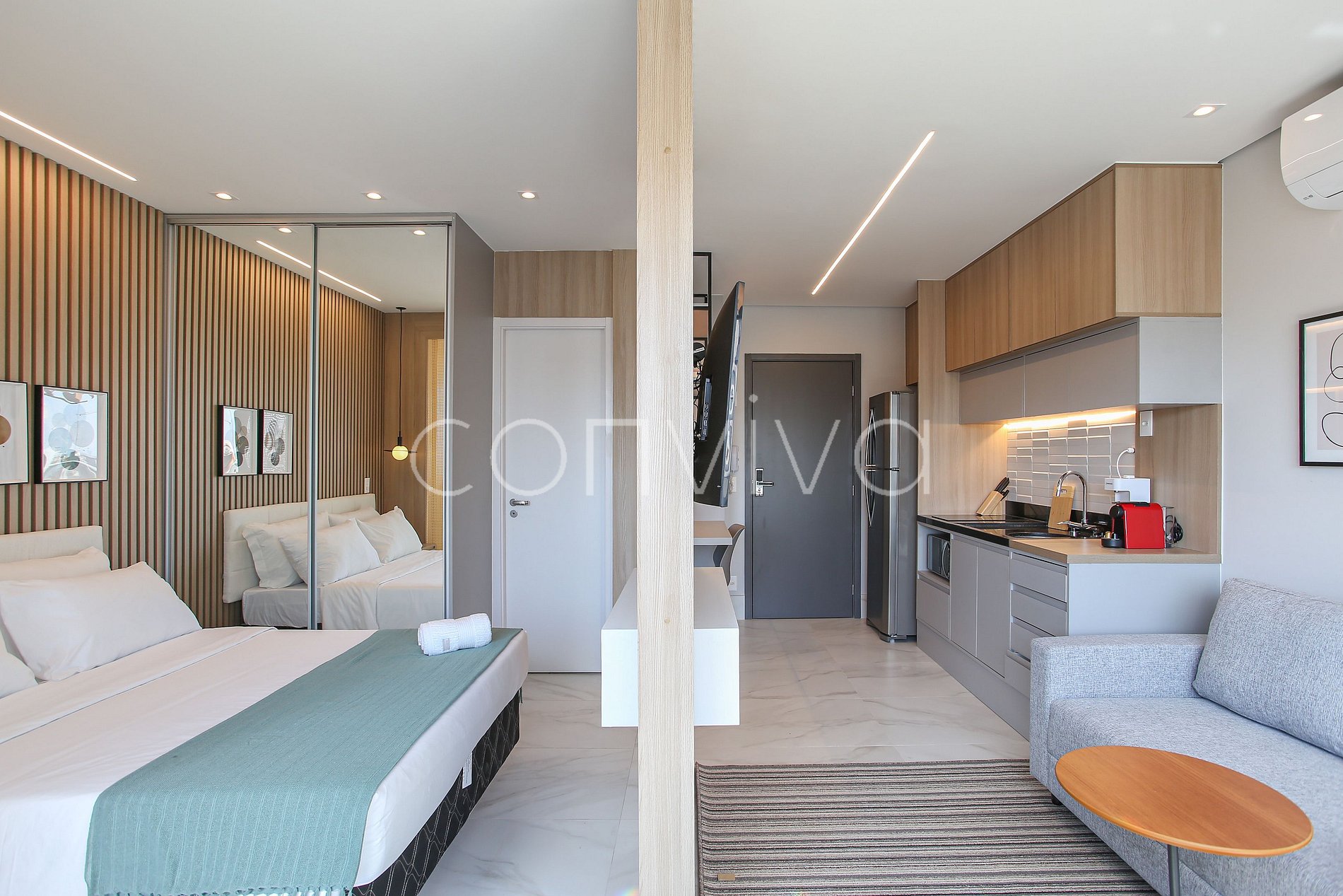 Un espacio de 30m² en el piso 17. Con cama de matrimonio, sofá, baño y cocina americana en la mejor ubicación de Pinheiros.