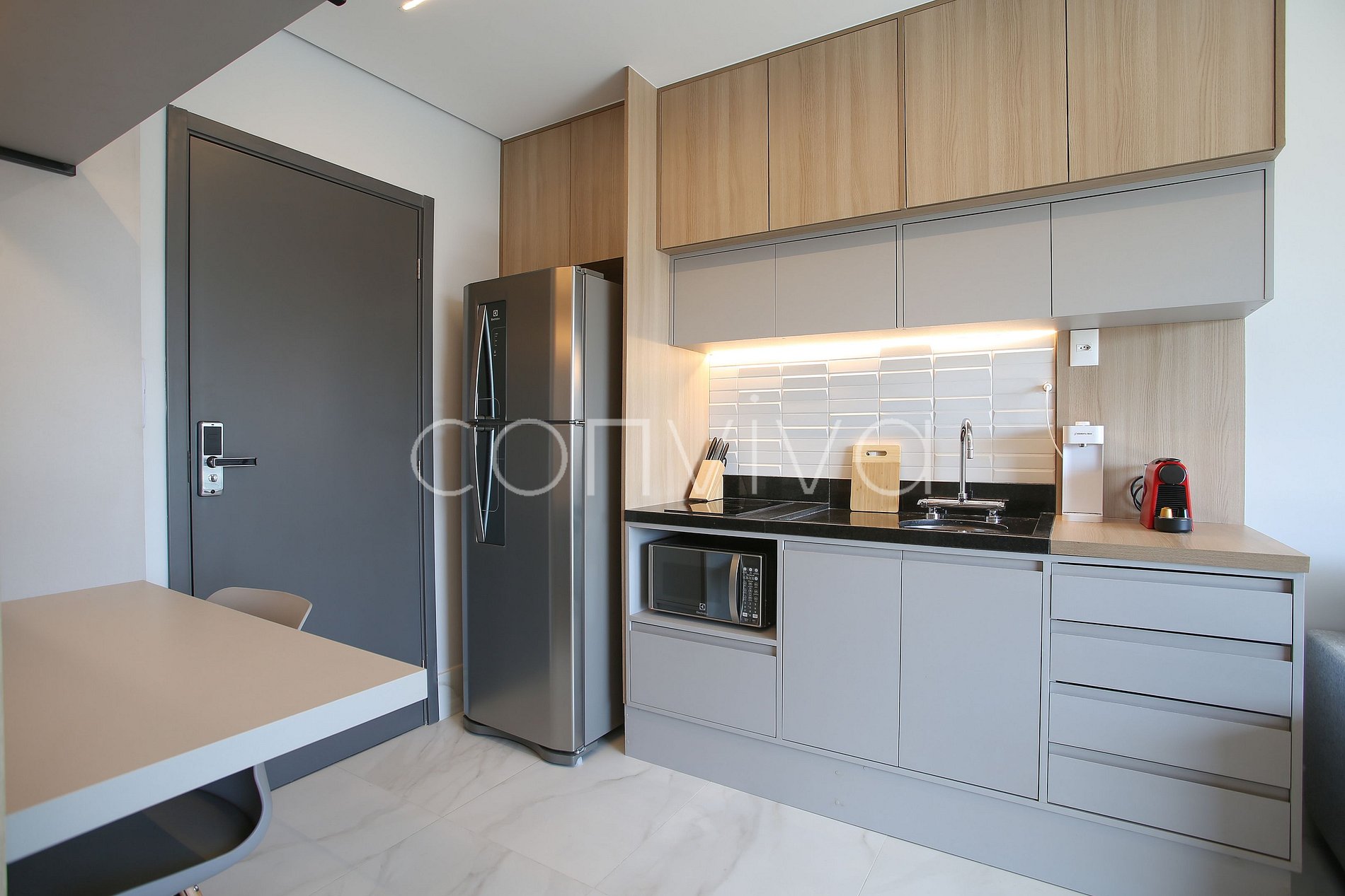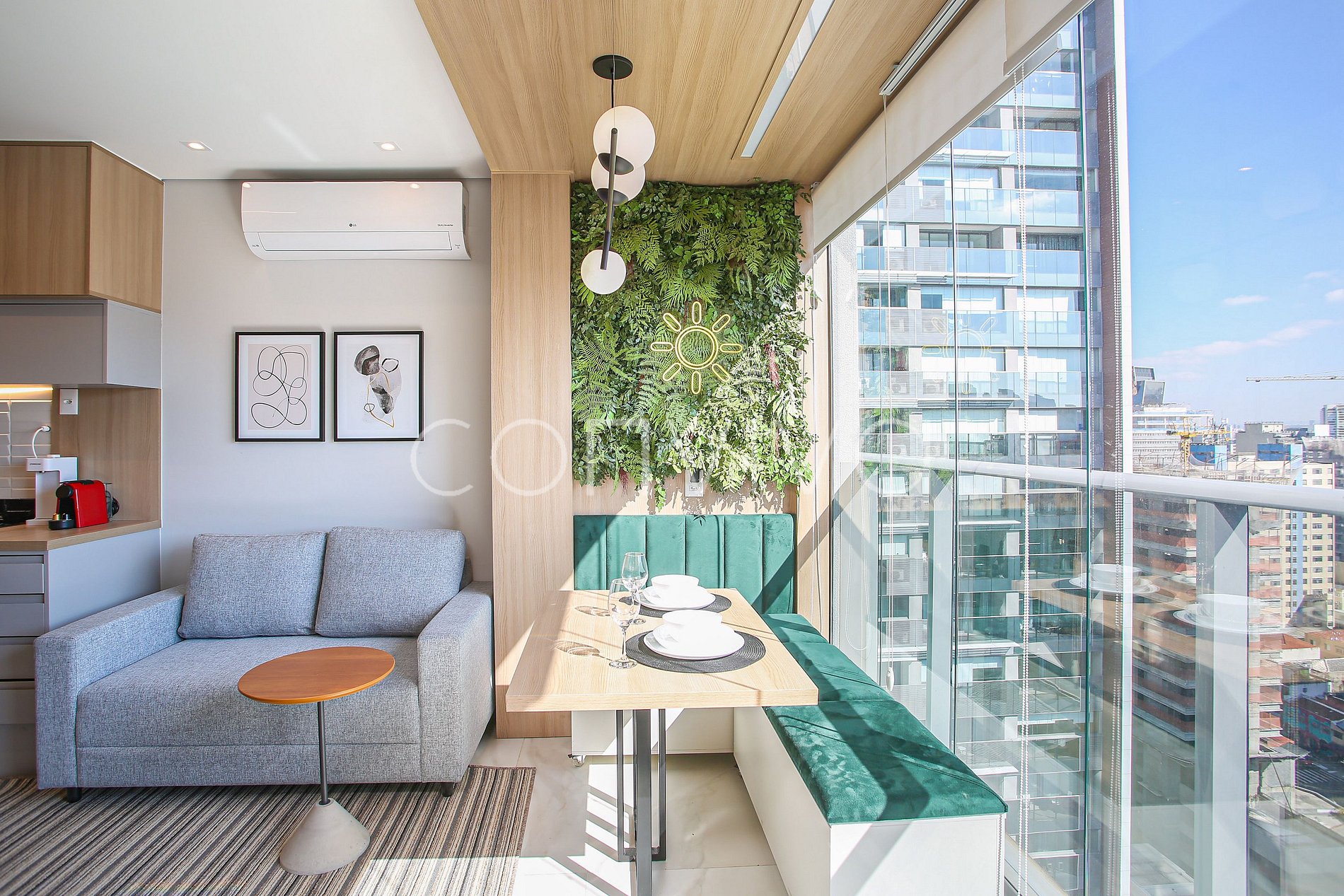 Un espacio de 30m² en el piso 17. Con cama de matrimonio, sofá, baño y cocina americana en la mejor ubicación de Pinheiros.