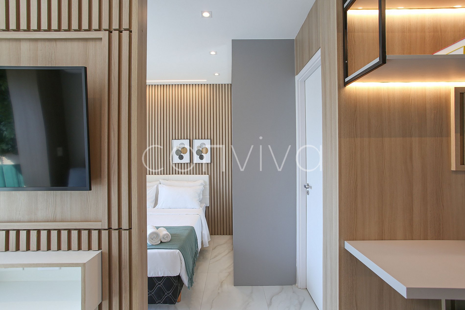 Un espacio de 30m² en el piso 17. Con cama de matrimonio, sofá, baño y cocina americana en la mejor ubicación de Pinheiros.