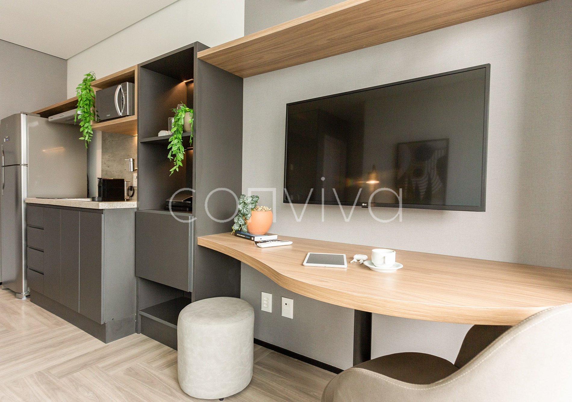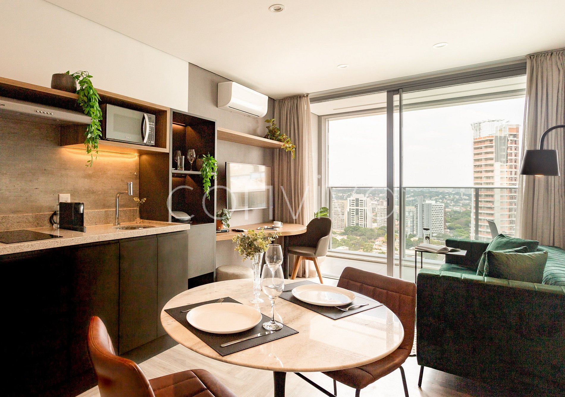 Un espacio de 30m² en el piso 16. Con cama de matrimonio, sofá, baño y cocina americana en la mejor ubicación de Pinheiros.