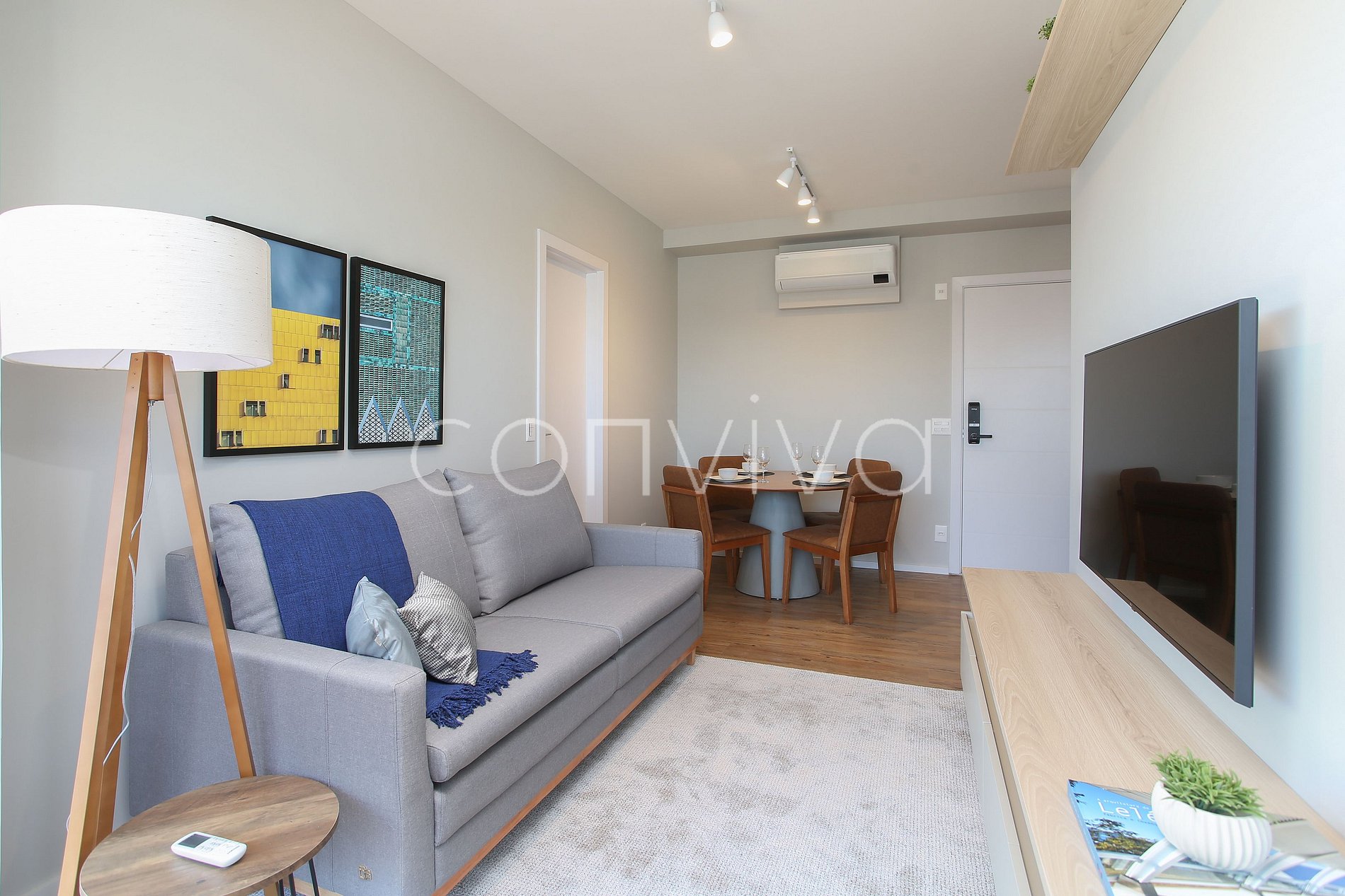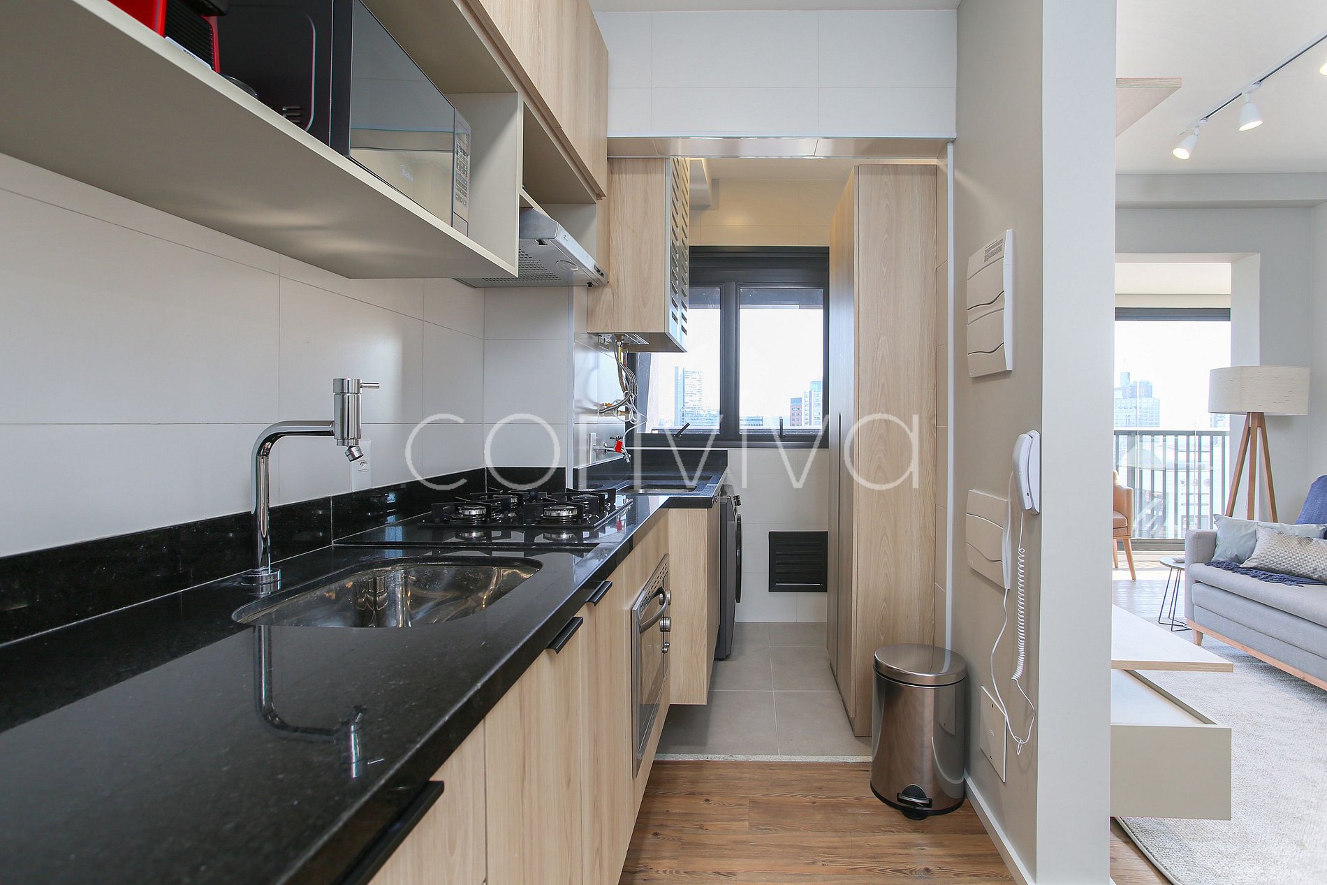Un espacio acogedor de 48m² en el 17º piso, con cama de matrimonio, baño, sofá, cocina, con vistas al barrio de Pinheiros.