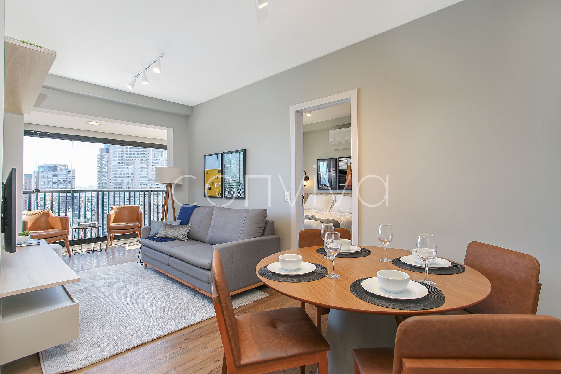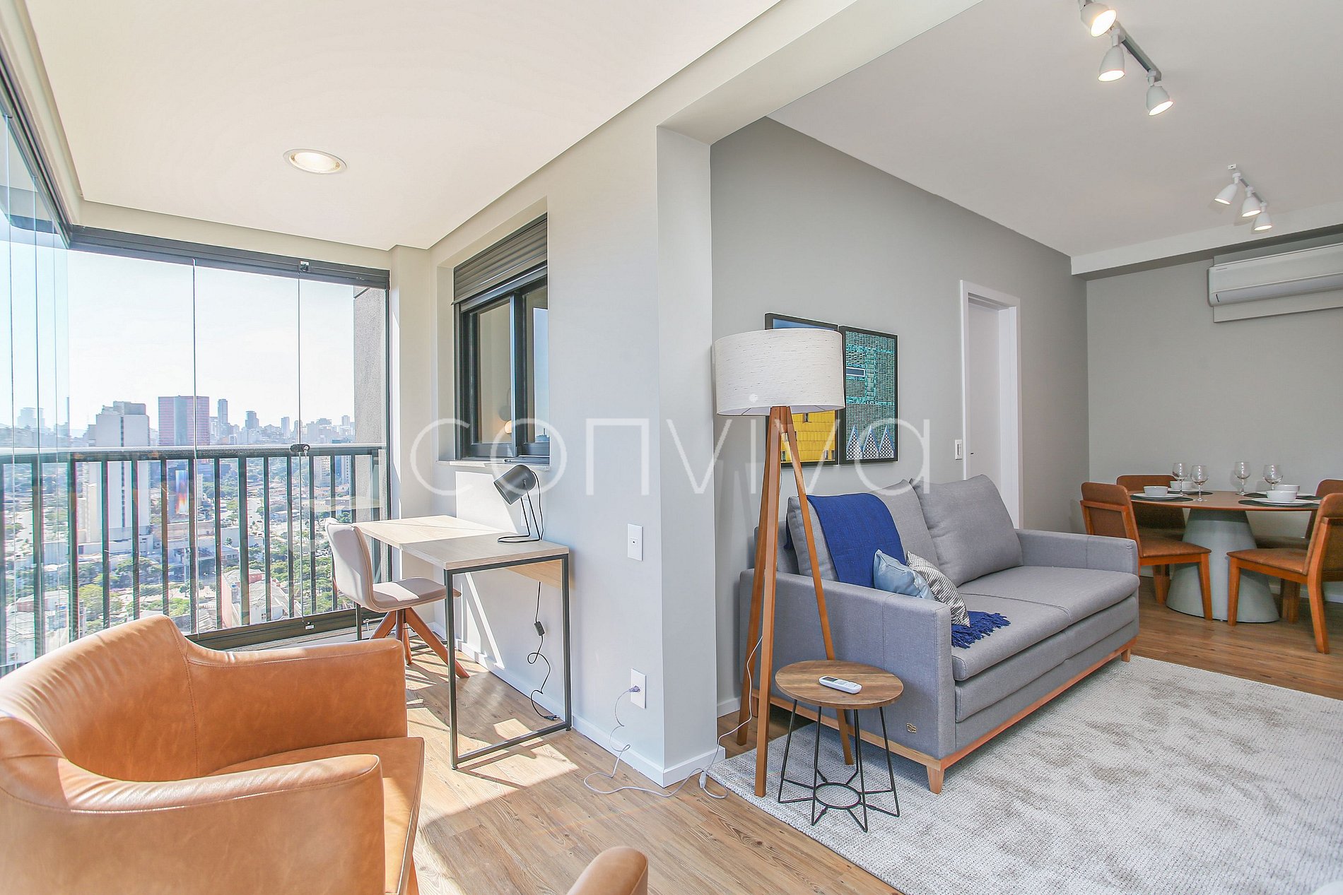 Un espacio de 48m², en la 3ª planta, con una cama de matrimonio, un sofá cama, un cuarto de baño y una cocina americana, en la mejor ubicación de Pinheiros.