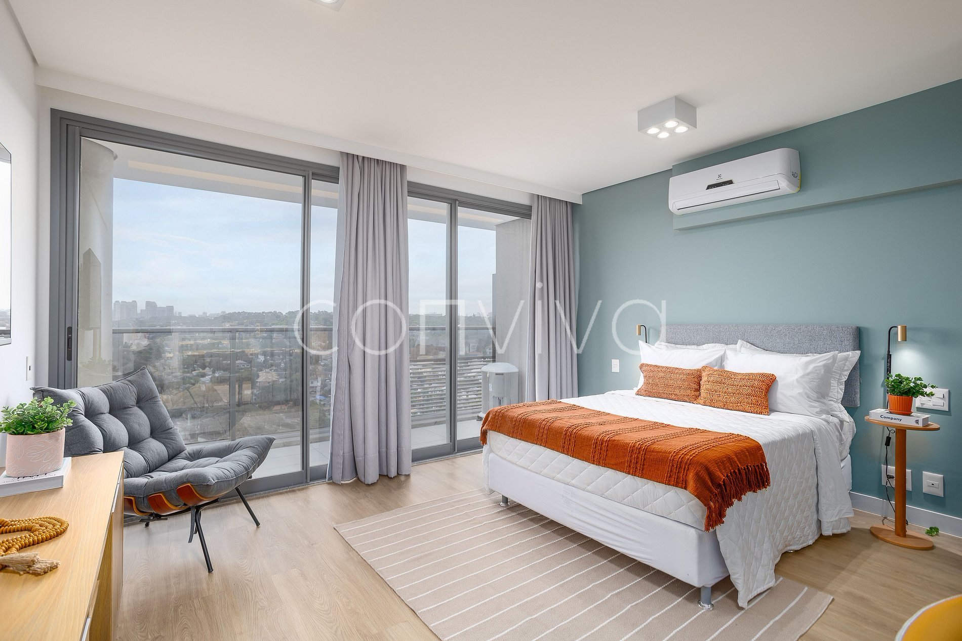 Un espacio de 38m², en el 19º piso, compuesto por cama queen, sofá, baño, cocina completa y balcón con vista privilegiada para el Jockey Club.