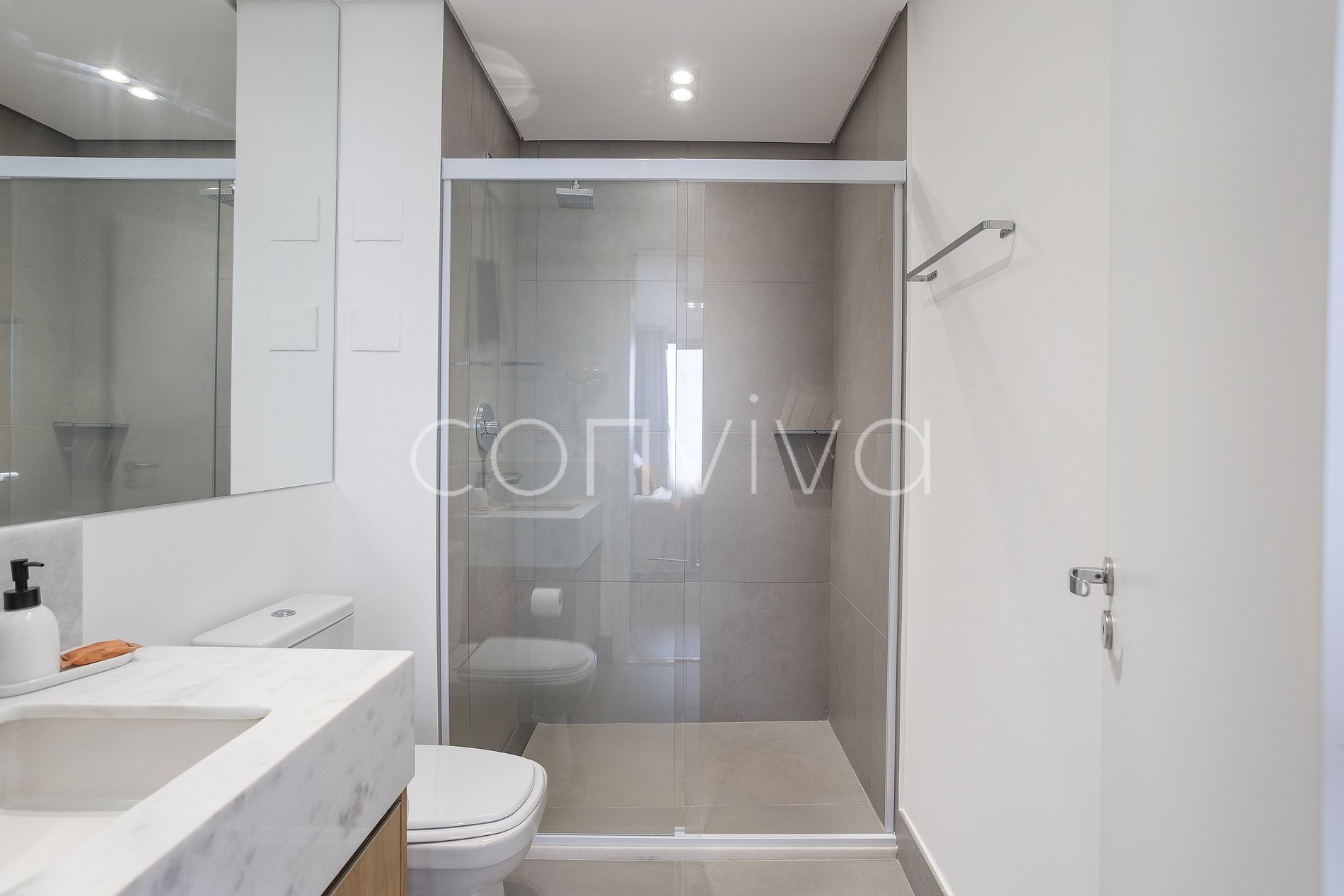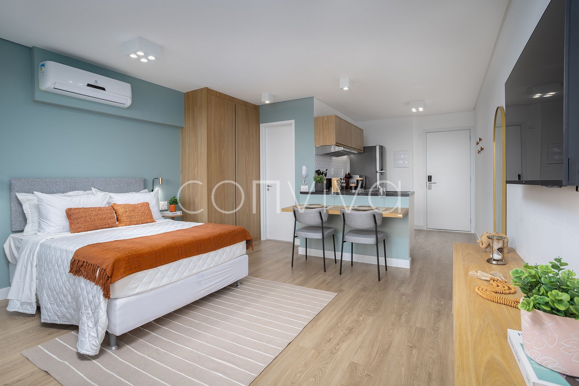 Un espacio de 38m², en el 19º piso, compuesto por cama queen, sofá, baño, cocina completa y balcón con vista privilegiada para el Jockey Club.