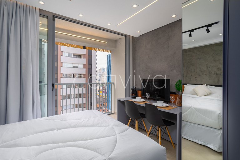 Un espacio de 25m² en el 7º piso con cama de matrimonio, balcón, cuarto de baño y cocina americana.