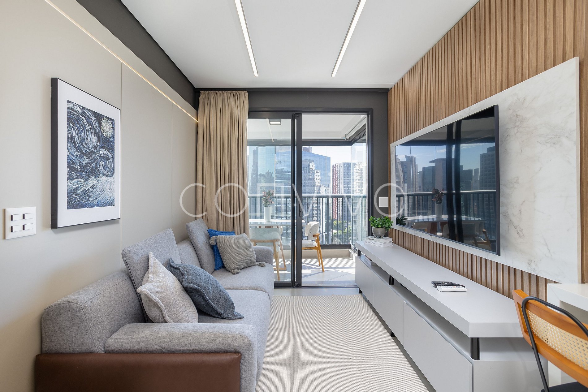 Espacio de 48m², en el 11º piso, con cama queen size, sofá, baño, cocina completa y amplio balcón.