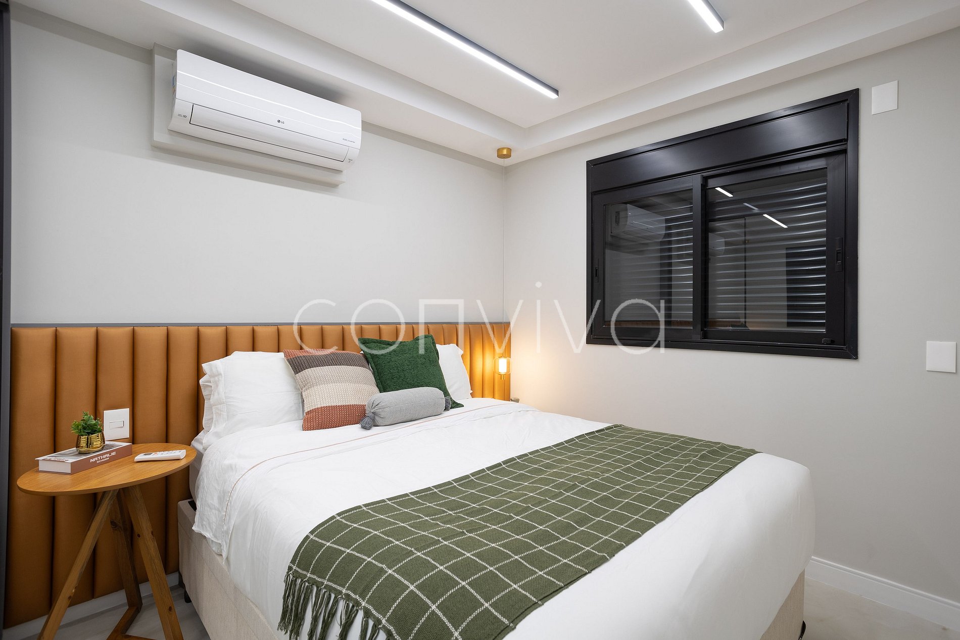 Espacio de 48m², en el 11º piso, con cama queen size, sofá, baño, cocina completa y amplio balcón.