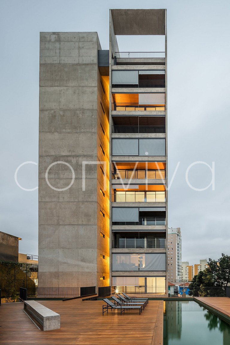 Un proyecto firmado por el premiado estudio Una Arquitetos, con una fachada de inspiración modernista que armoniza hormigón y cristal, privilegiada por la luz natural que invade las estancias a través de las paredes acristaladas y las trampillas. En el edificio hay conserje 24 horas, gimnasio, piscina y lavandería.