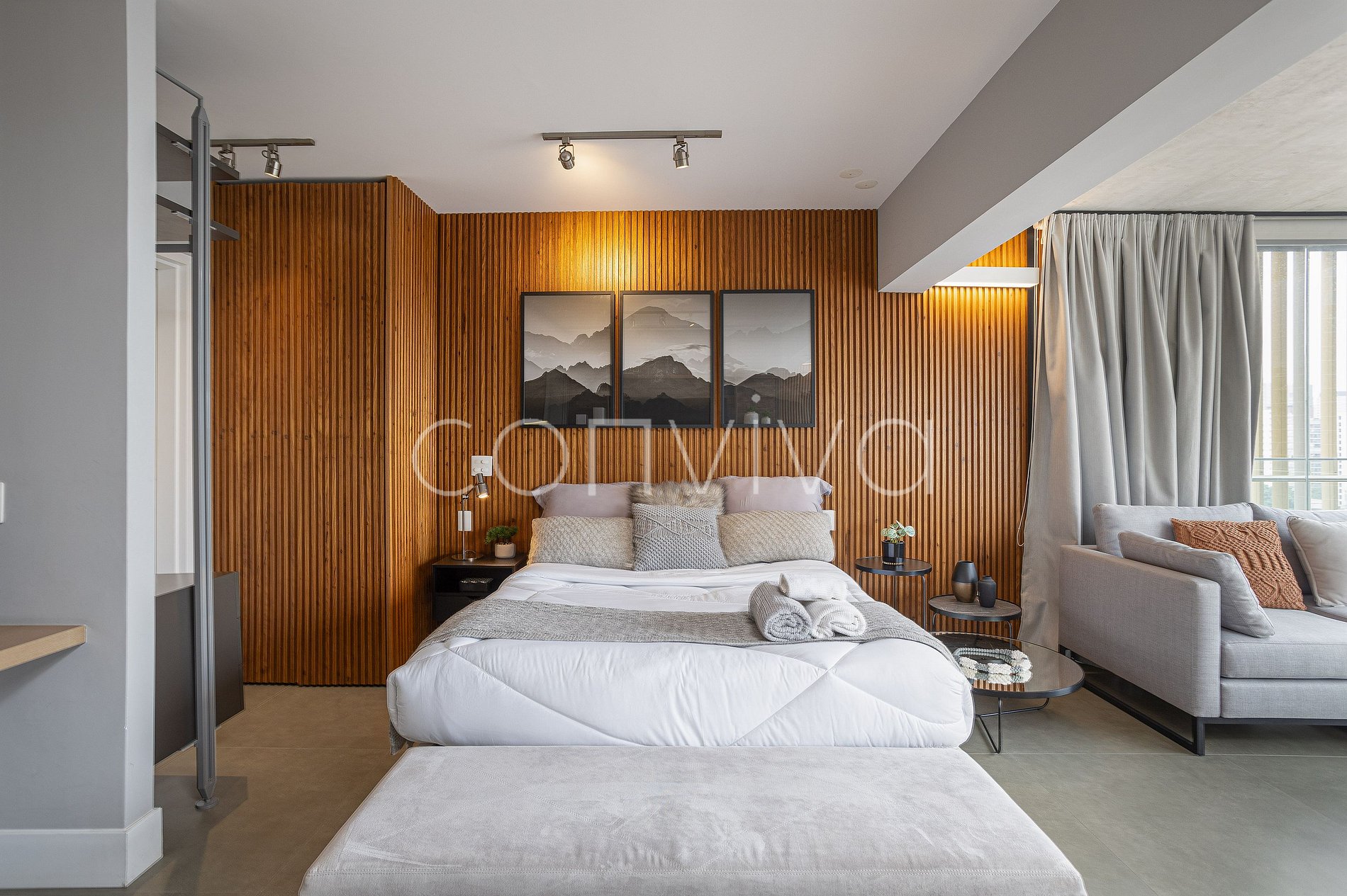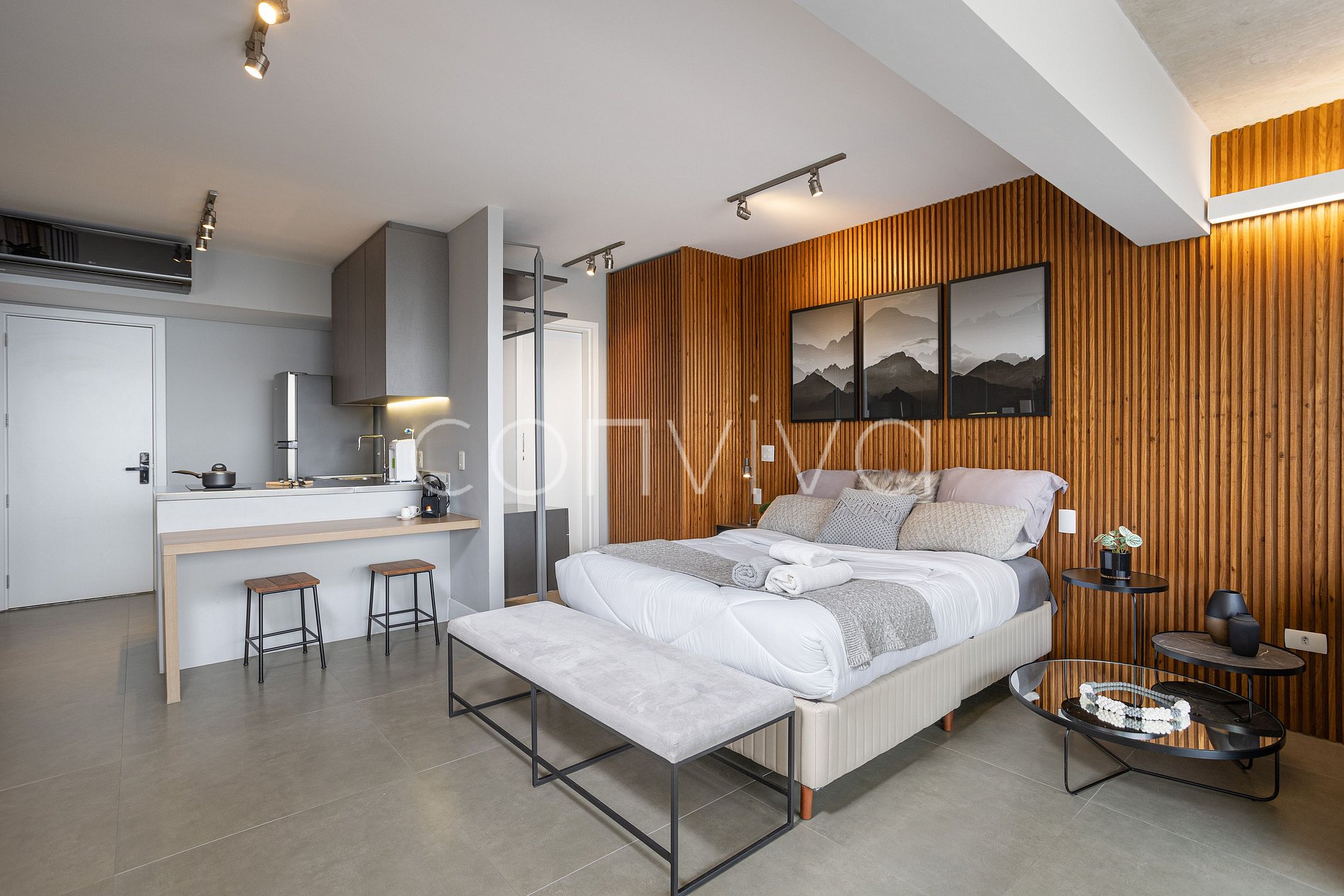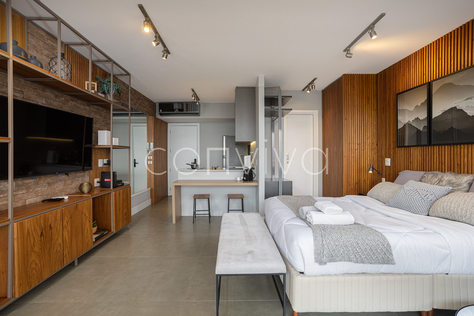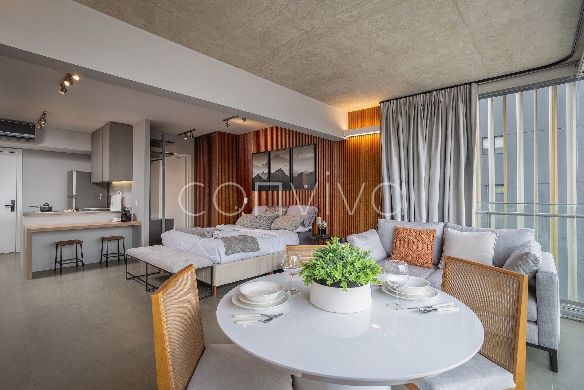 Com 46m² no 14º andar, combina conforto e estilo: cama queen size, living, banheiro privativo e cozinha equipada, ideal para short e long stay. A decoração deslumbrante e o ambiente bem iluminado tornam a estadia perfeita para quem busca um studio premium, com fácil acesso à Faria Lima e JK Iguatemi.