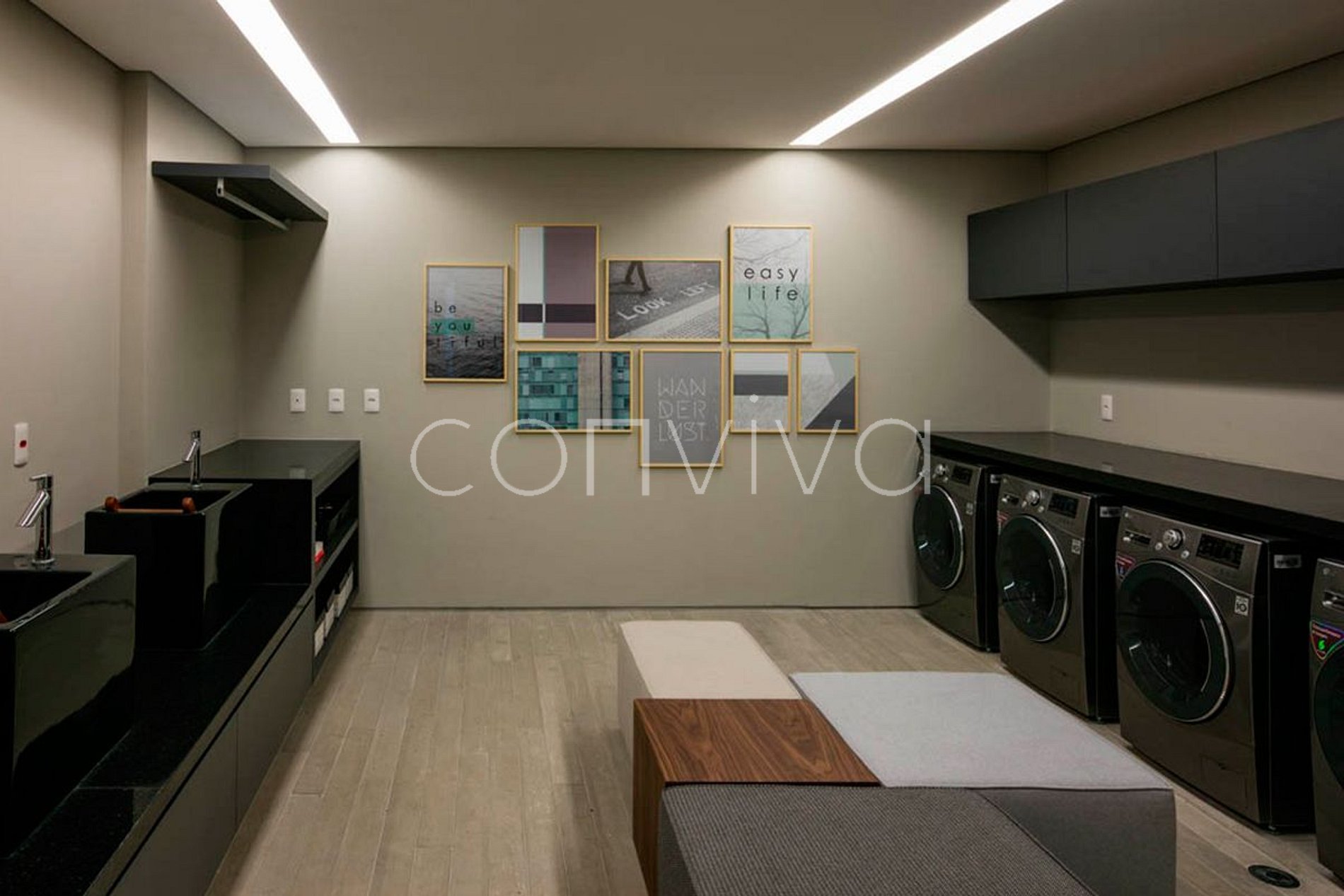 Há uma lavanderia coletiva no prédio que pode ser utilizada mediante instalação do aplicativo no celular e compra de créditos.