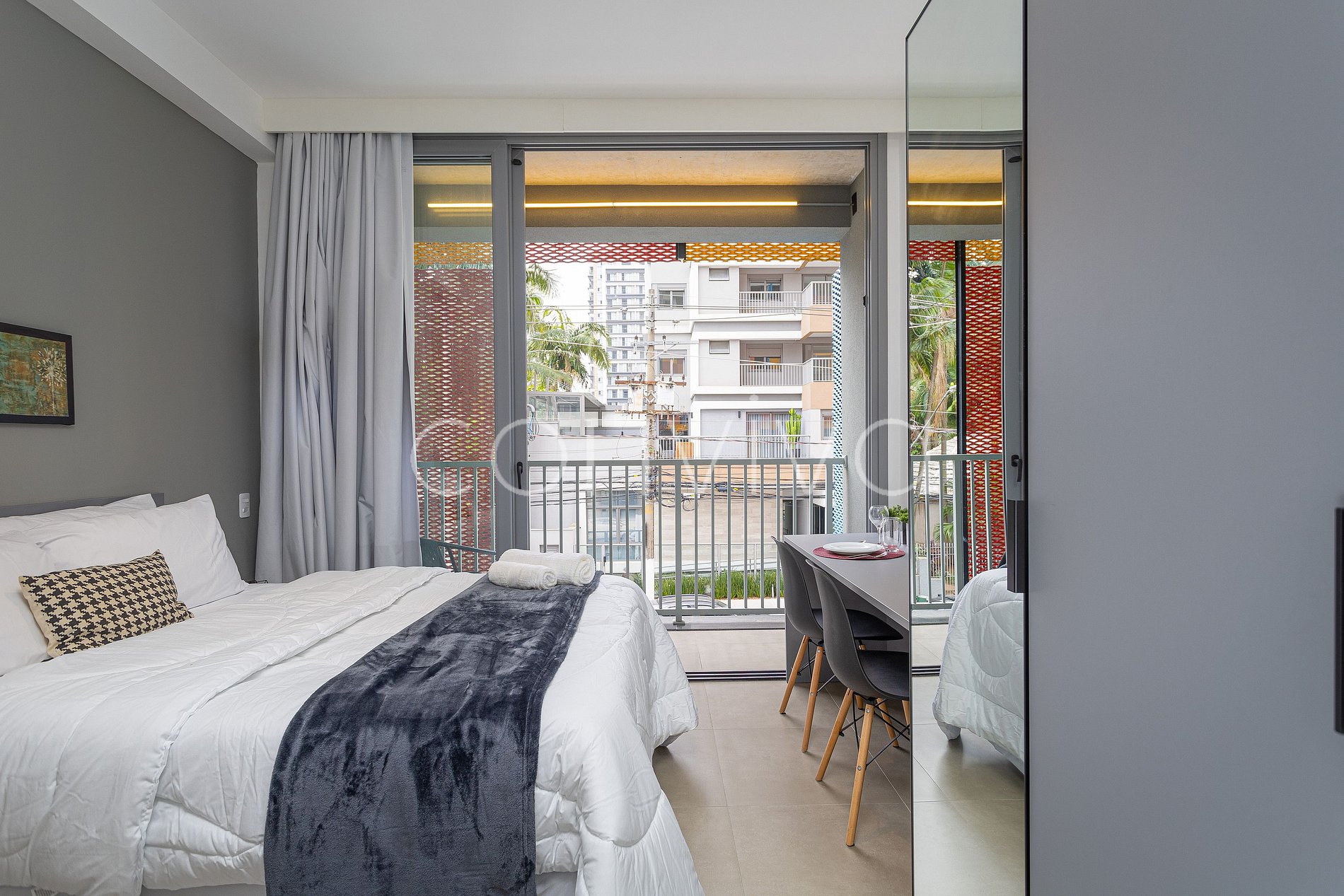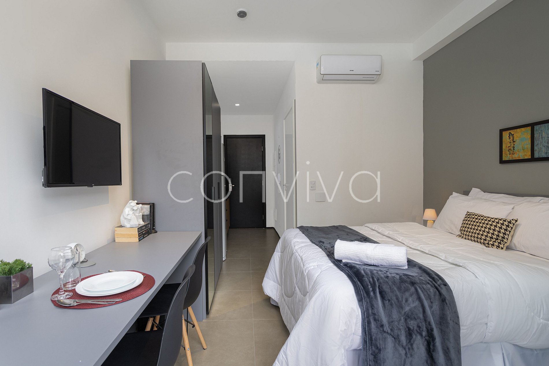 Espaço de 25m², no 1º andar, composto por uma cama casal, banheiro, cozinha compacta e varanda.