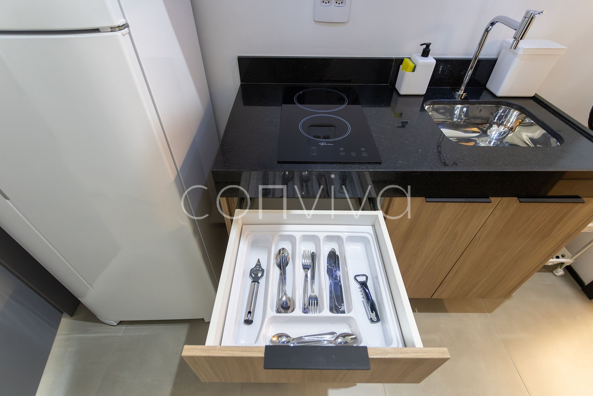 Espaço de 25m², no 1º andar, composto por uma cama casal, banheiro, cozinha compacta e varanda.