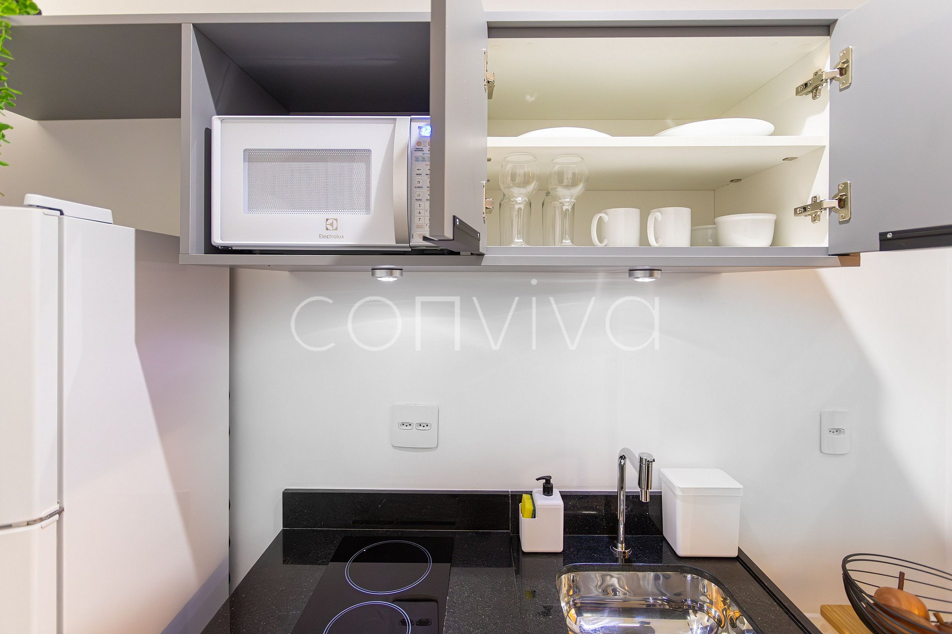 Espaço de 25m², no 1º andar, composto por uma cama casal, banheiro, cozinha compacta e varanda.