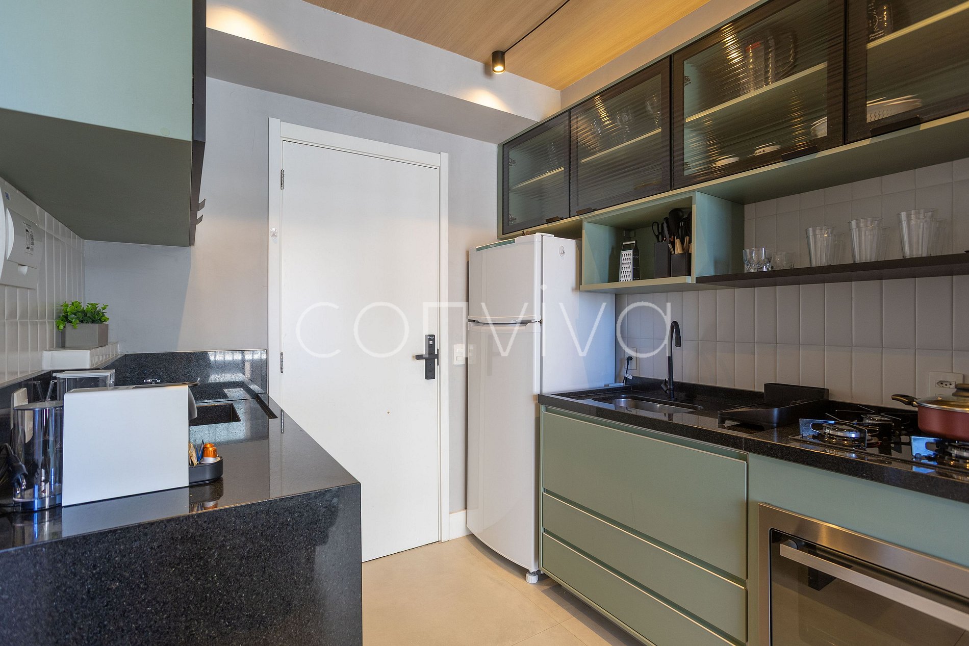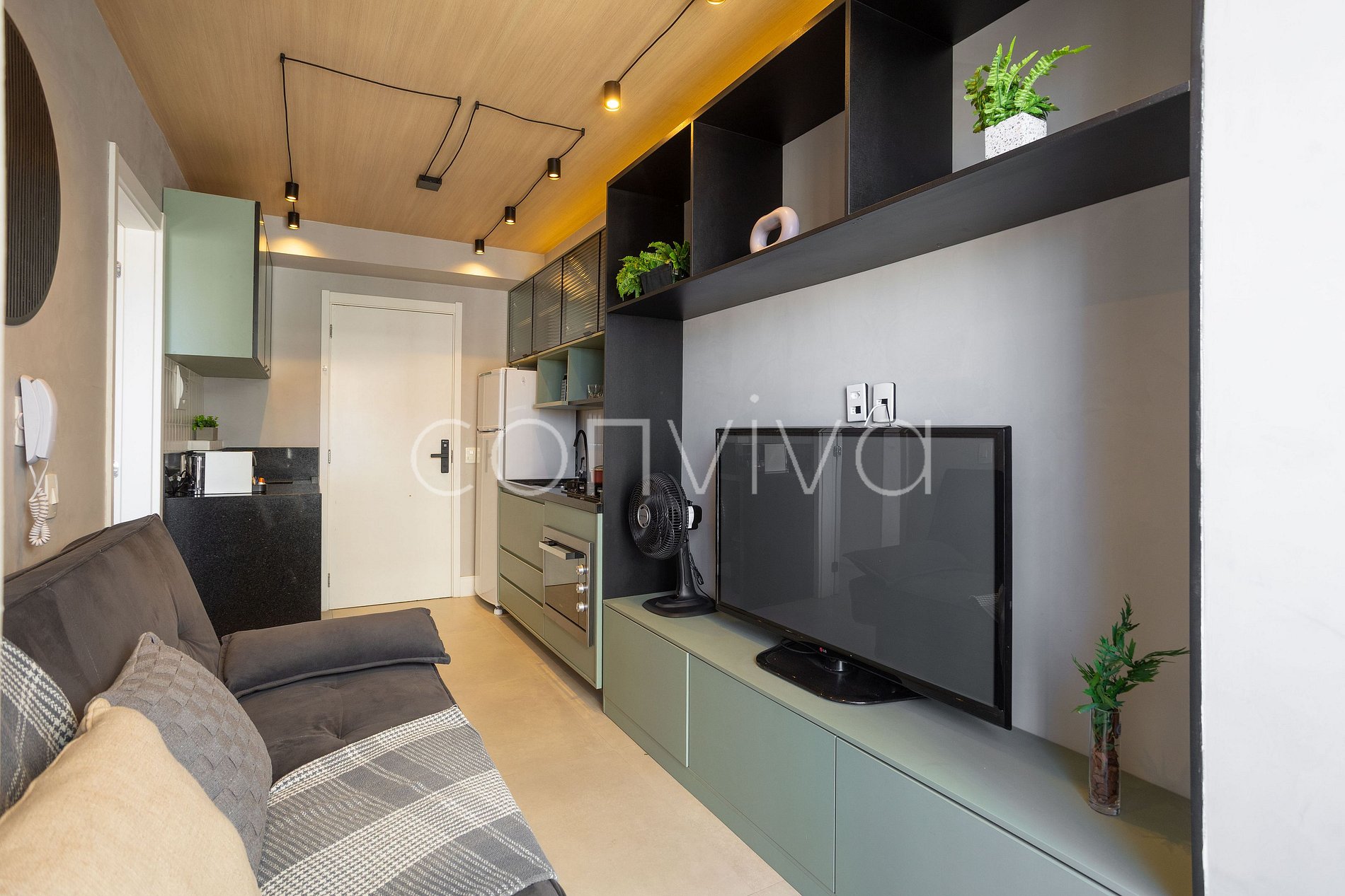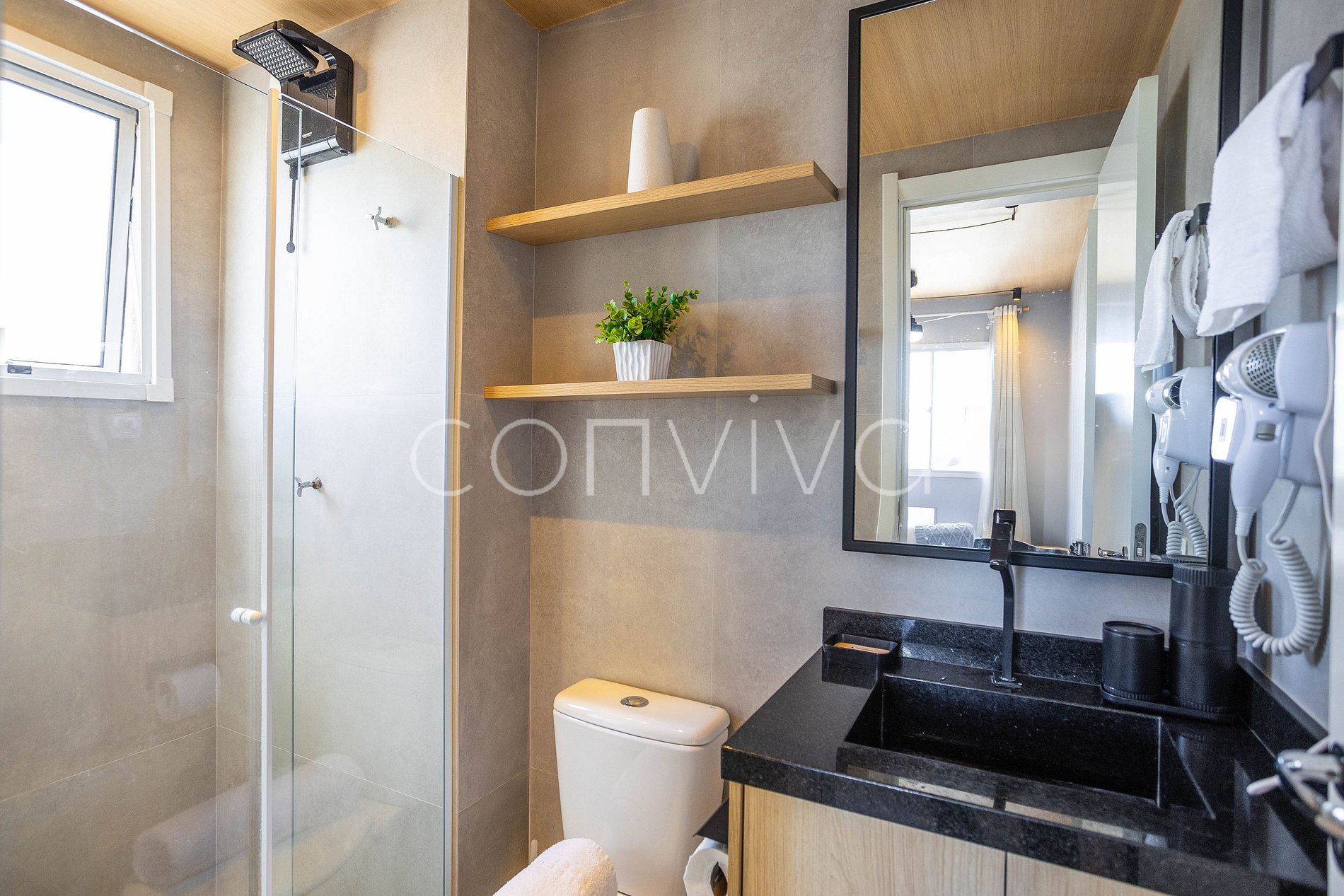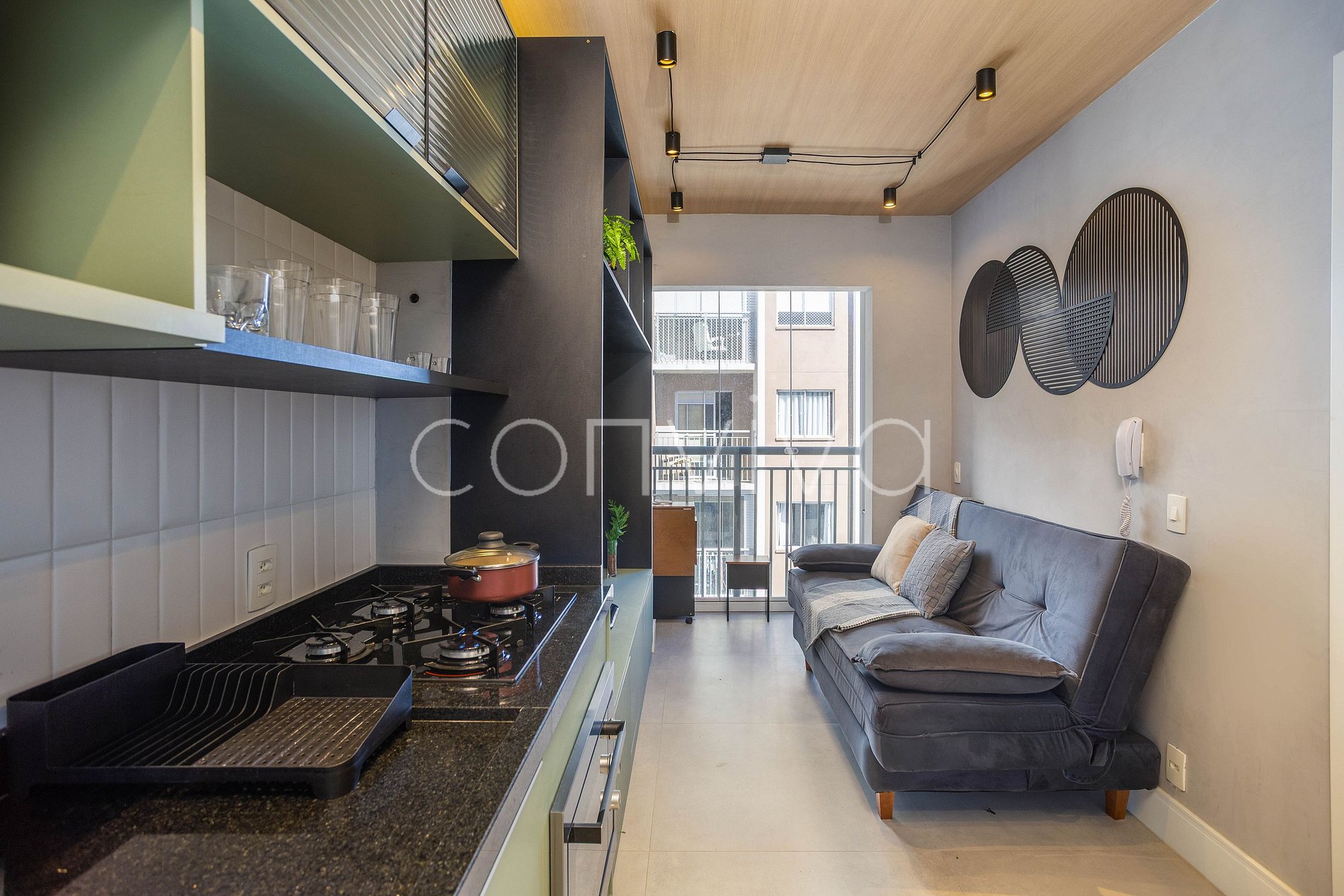 Espaço de 30m², no 15º andar, com uma cama cama de casal, home office, sofá cama, banheiro espaçoso, cozinha completa, decoração moderna e uma vista incrível para o bairro.