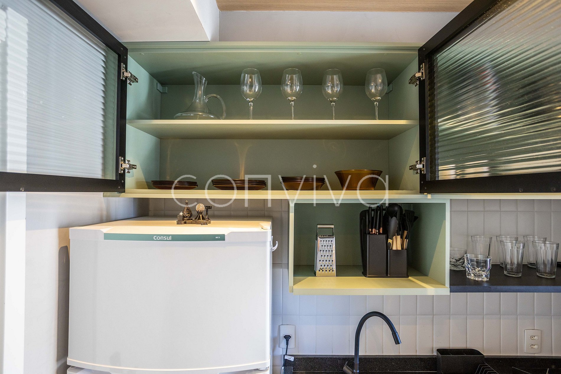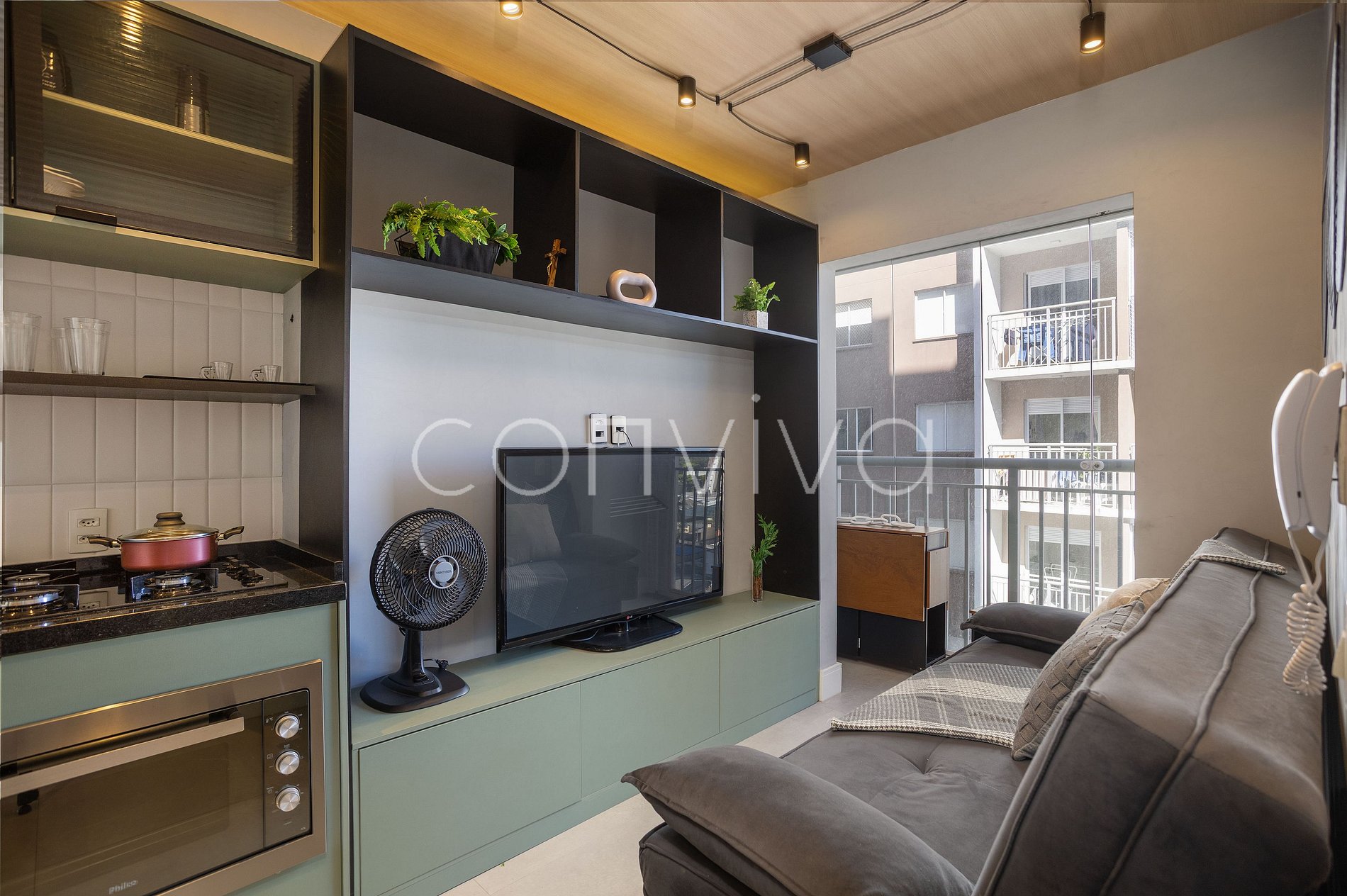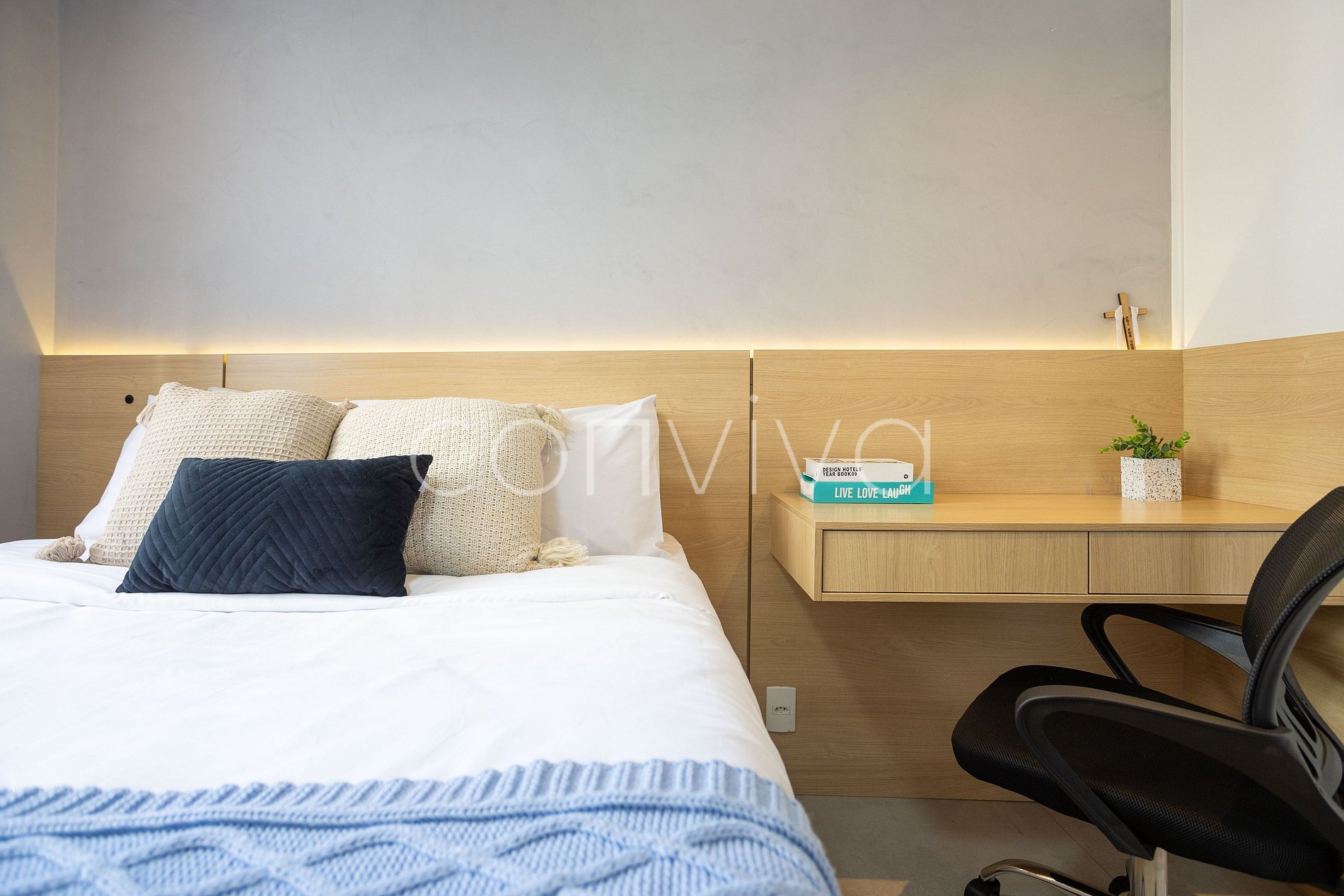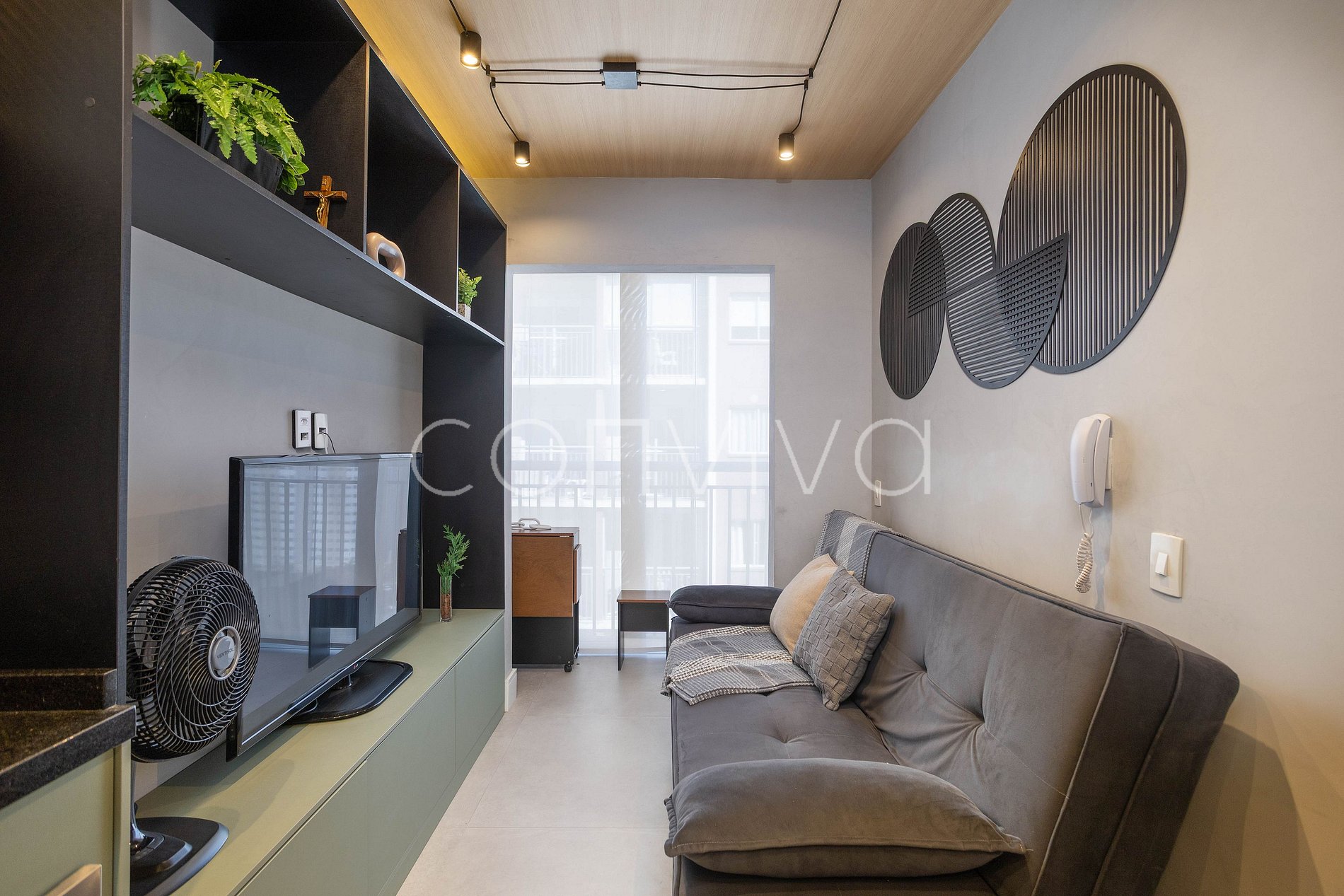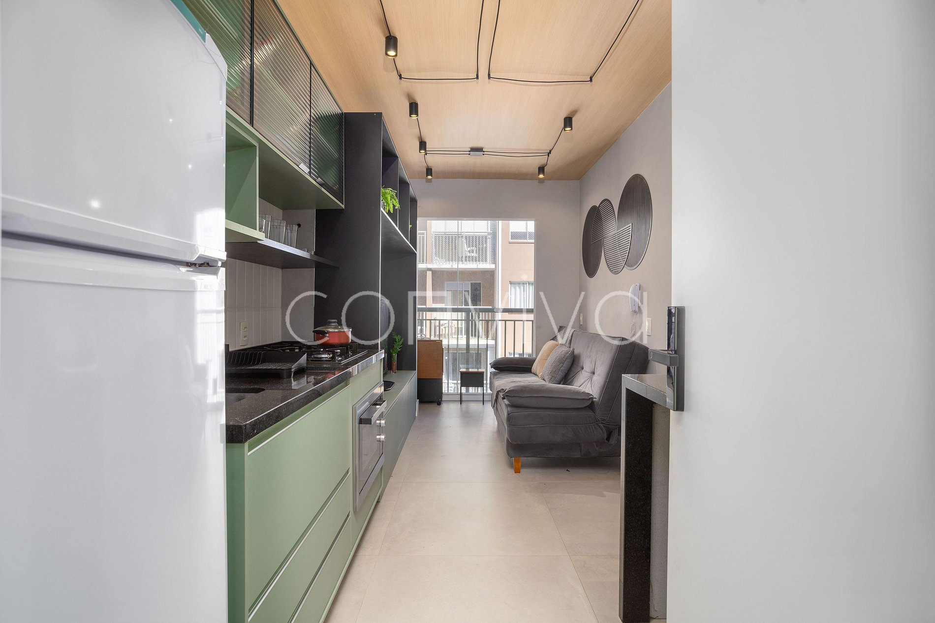 Espaço de 30m², no 15º andar, com uma cama cama de casal, home office, sofá cama, banheiro espaçoso, cozinha completa, decoração moderna e uma vista incrível para o bairro.