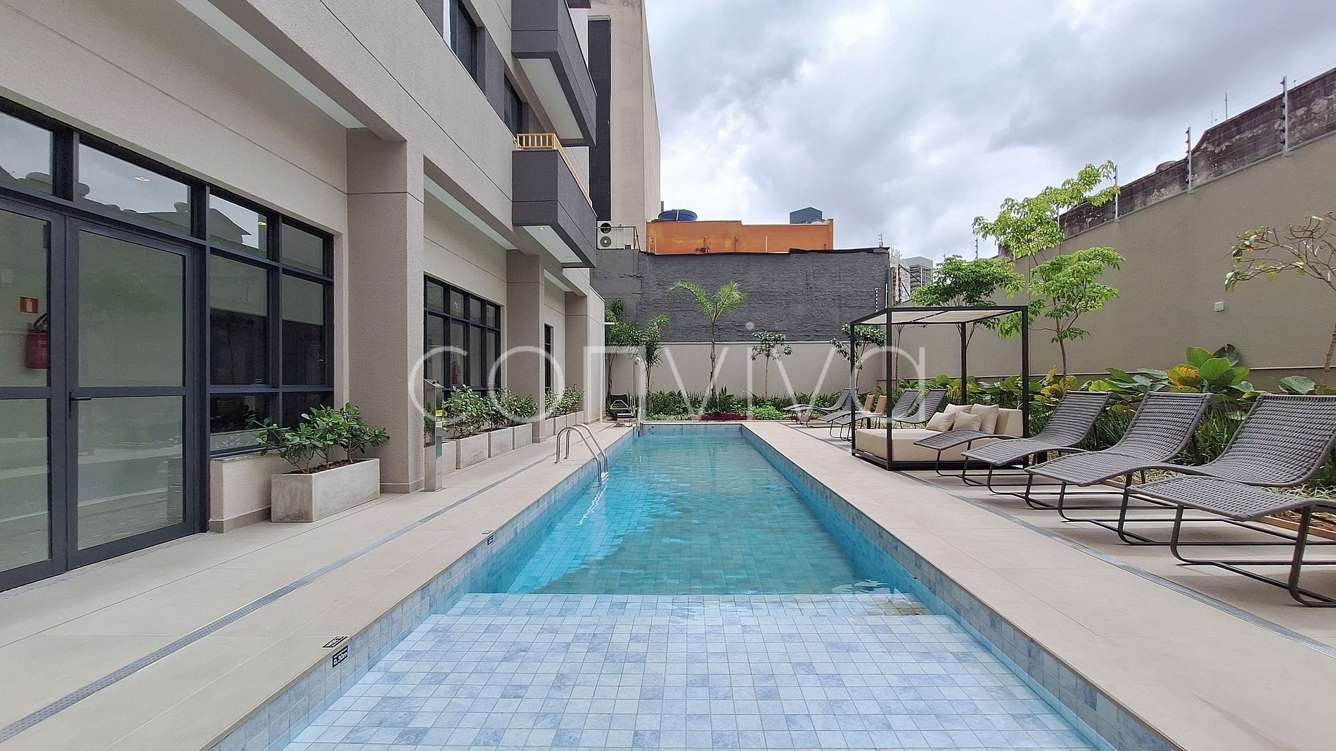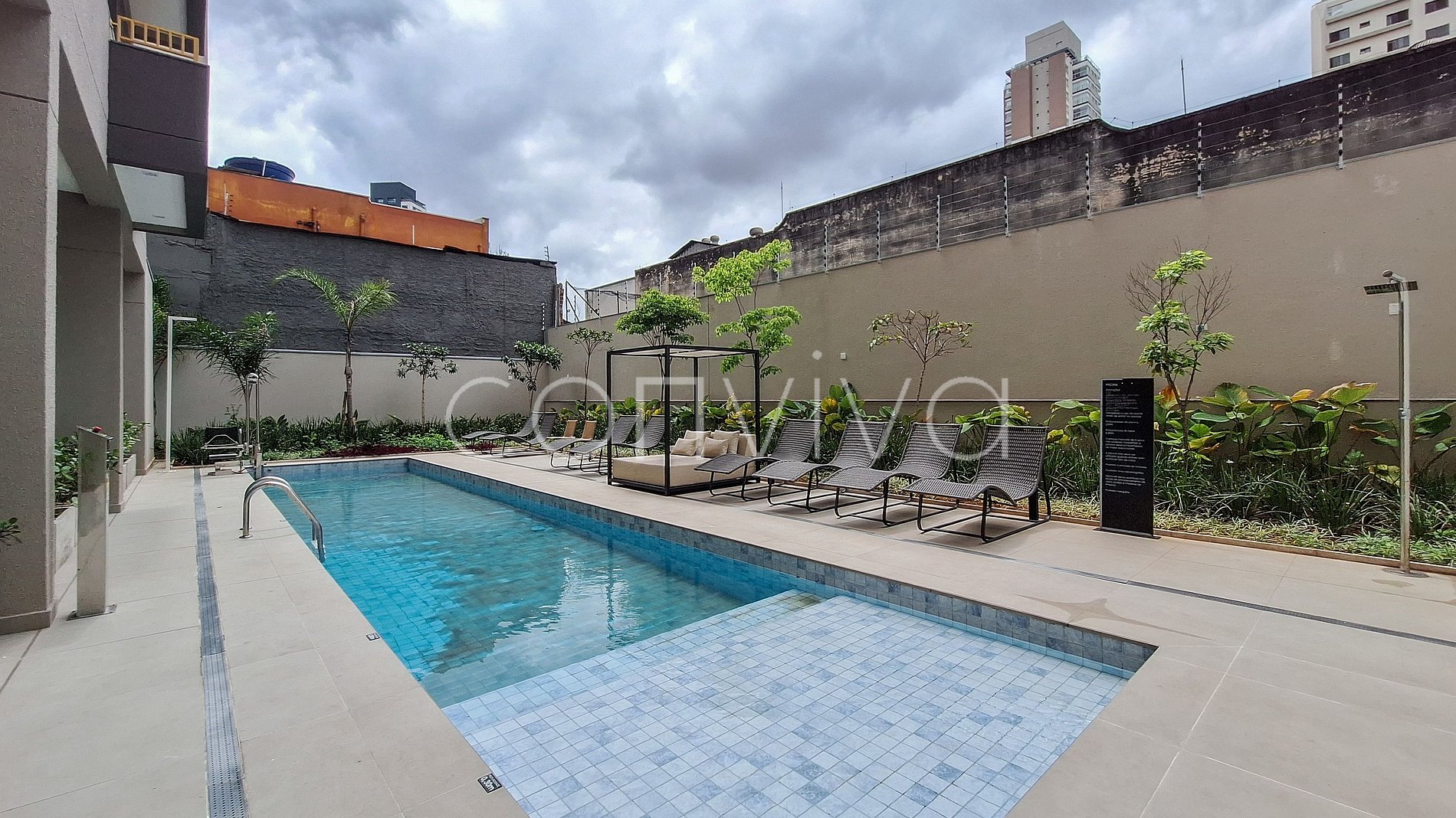 Espaço de 26m², no 14º andar, possui uma suíte com cama casal, sofá-cama na sala, sacada com vista para cidade e espaço para refeições e cozinha completa.