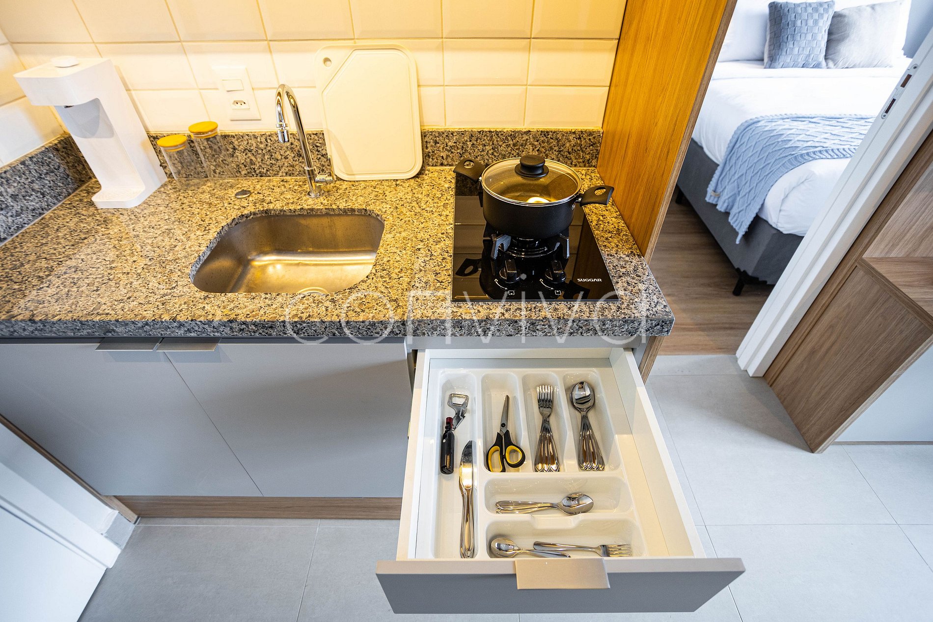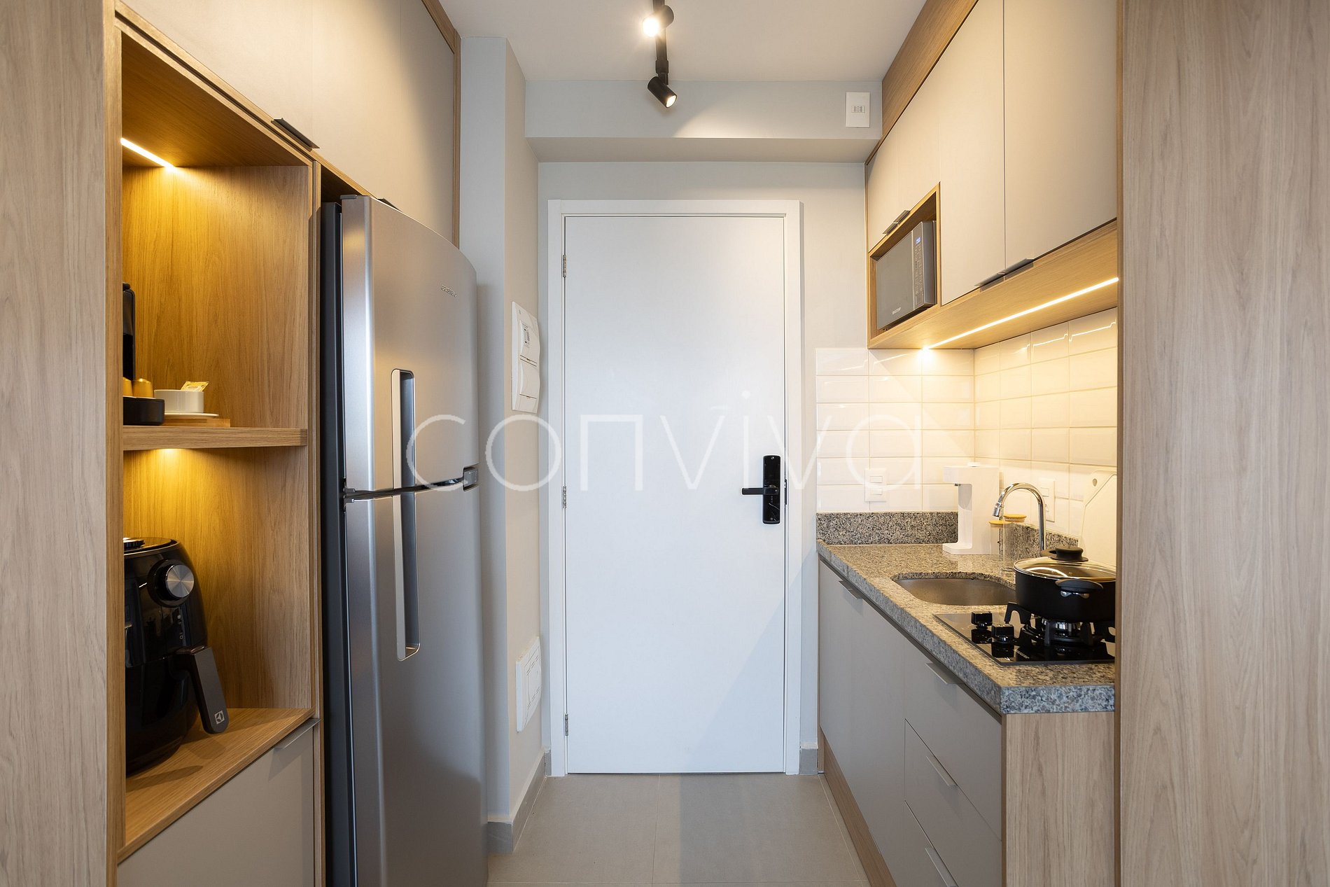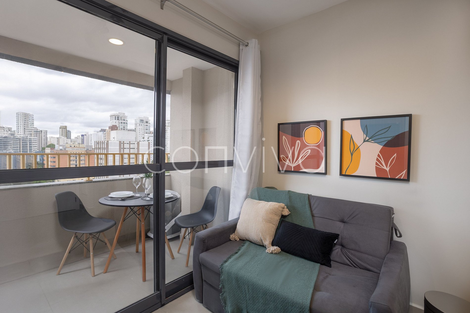 Espaço de 26m², no 14º andar, possui uma suíte com cama casal, sofá-cama na sala, sacada com vista para cidade e espaço para refeições e cozinha completa.