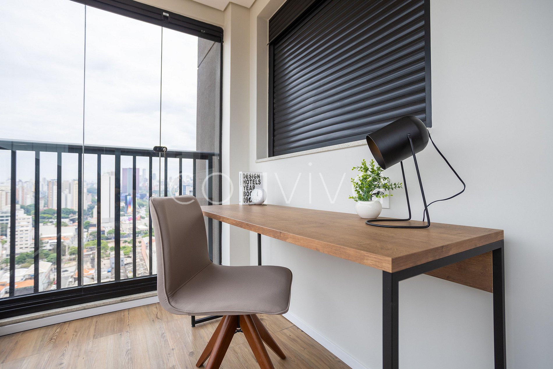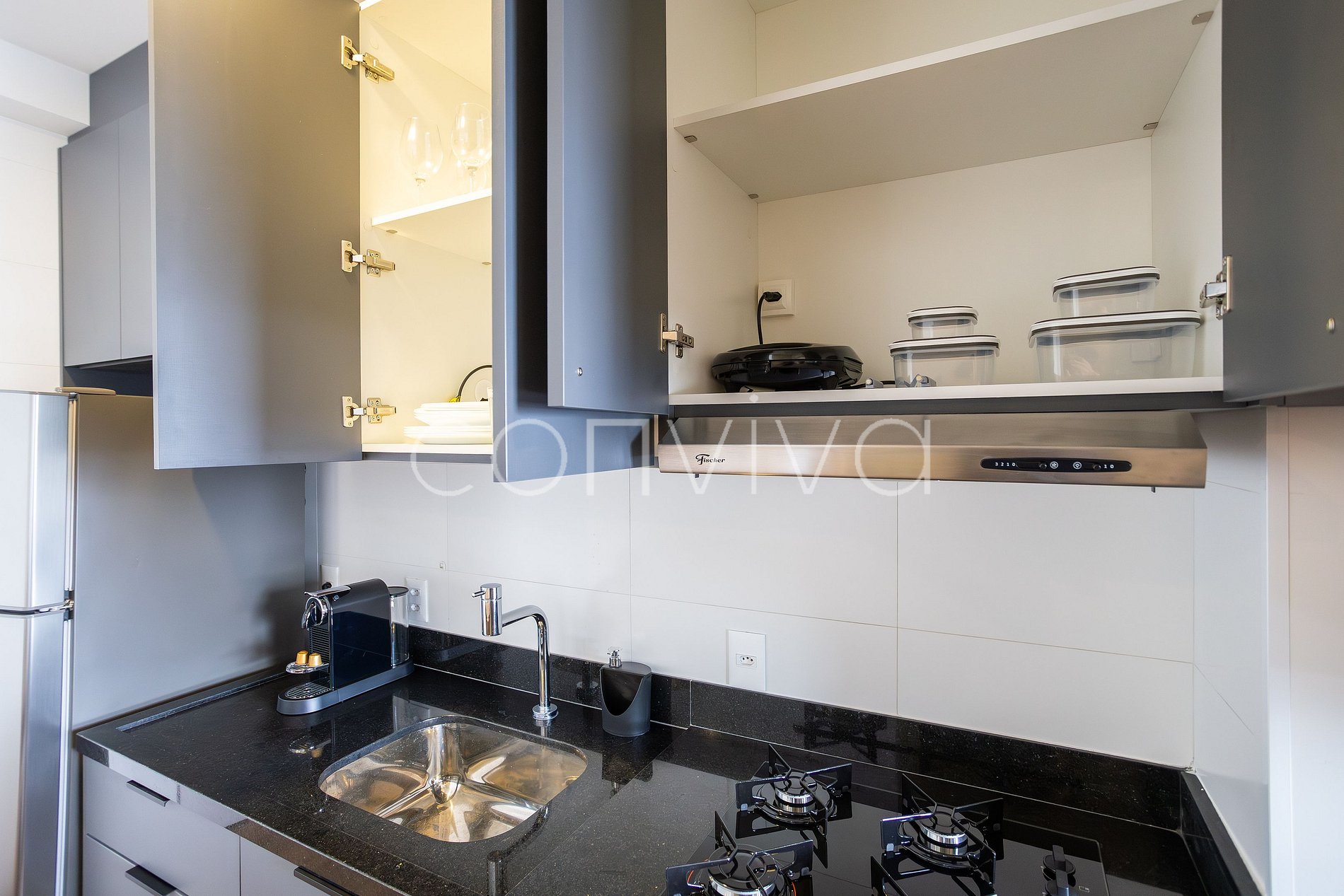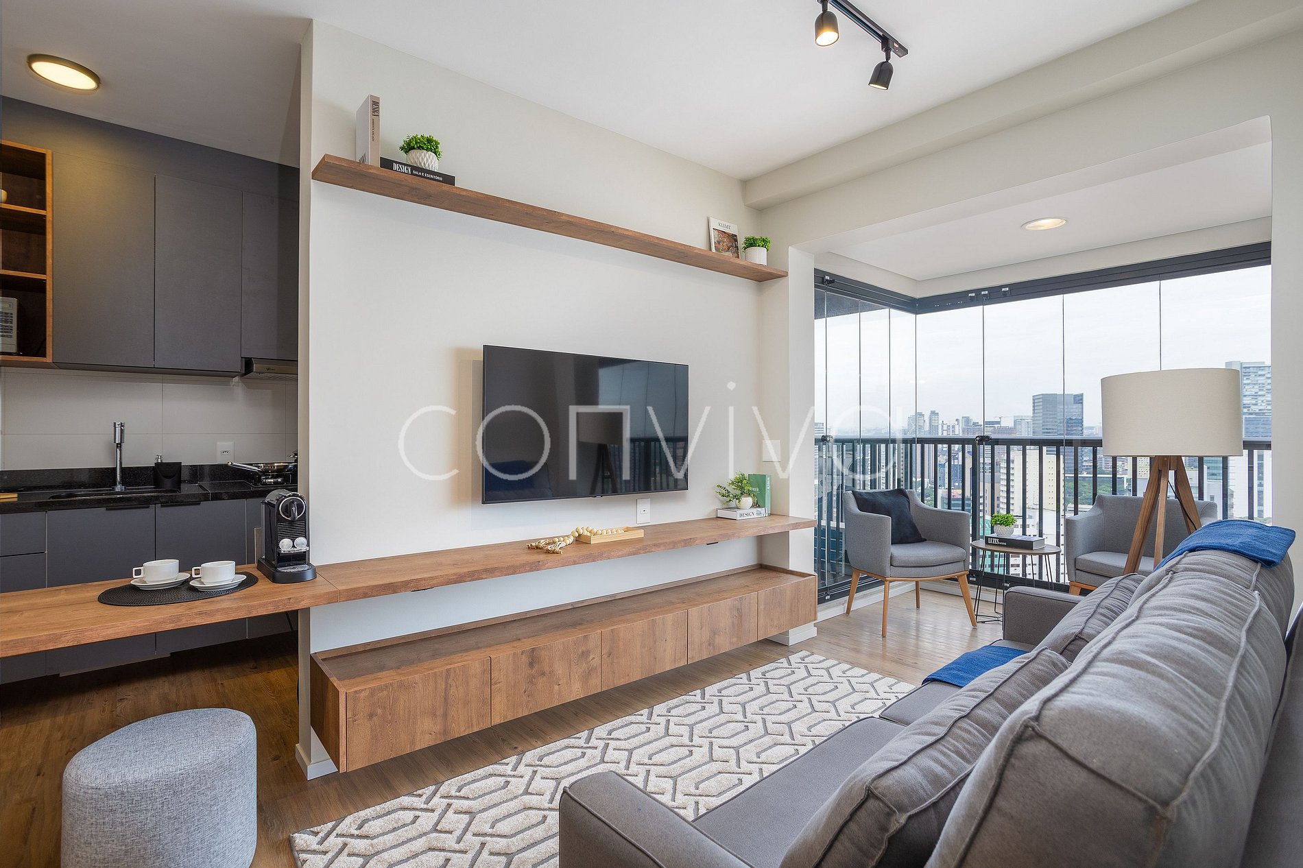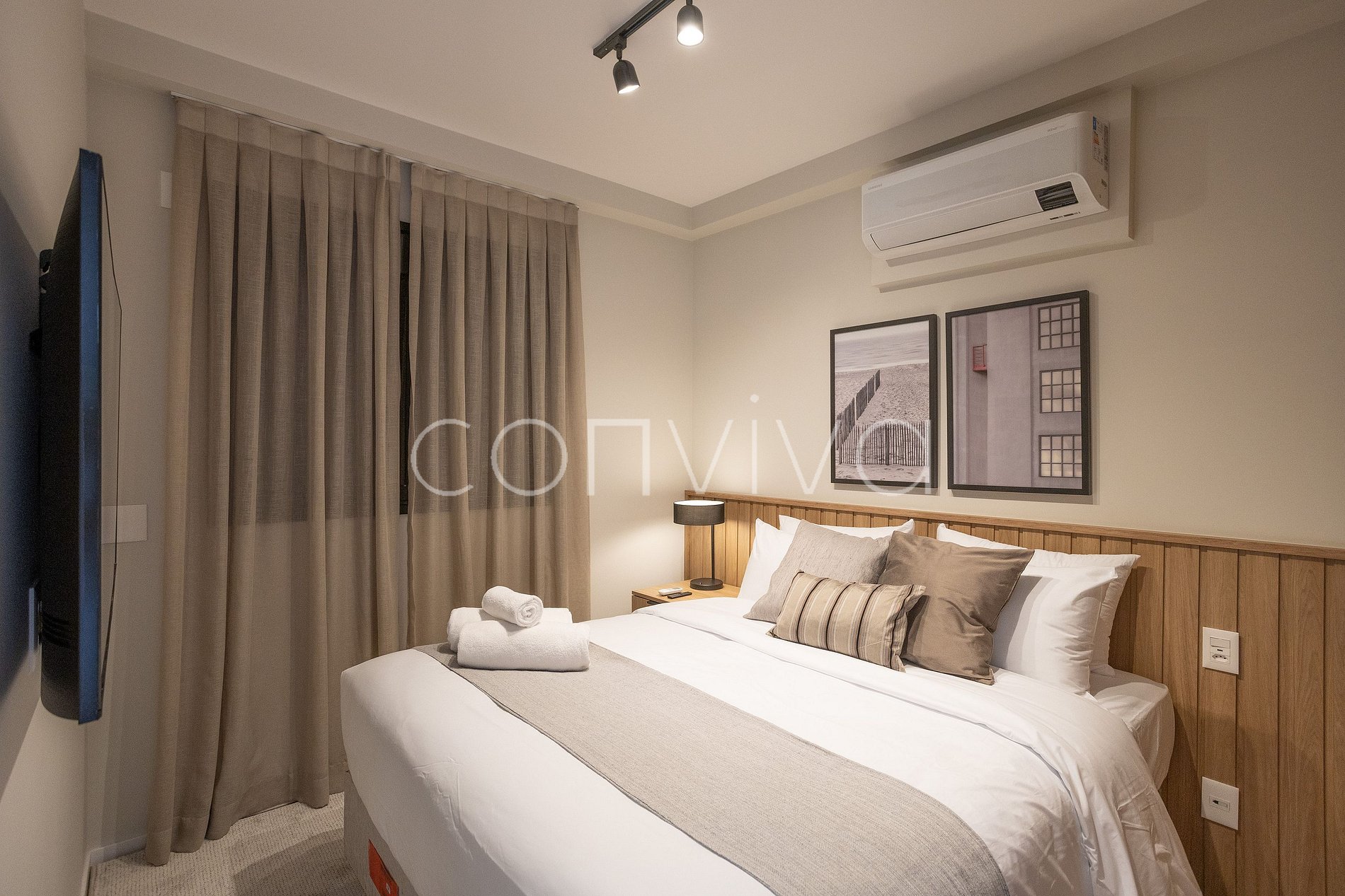 Espaço de 48m², no 18º andar, com uma cama queen size, banheiro, sofá e cozinha. Na melhor localização de Pinheiros, próximo ao metrô Faria Lima.