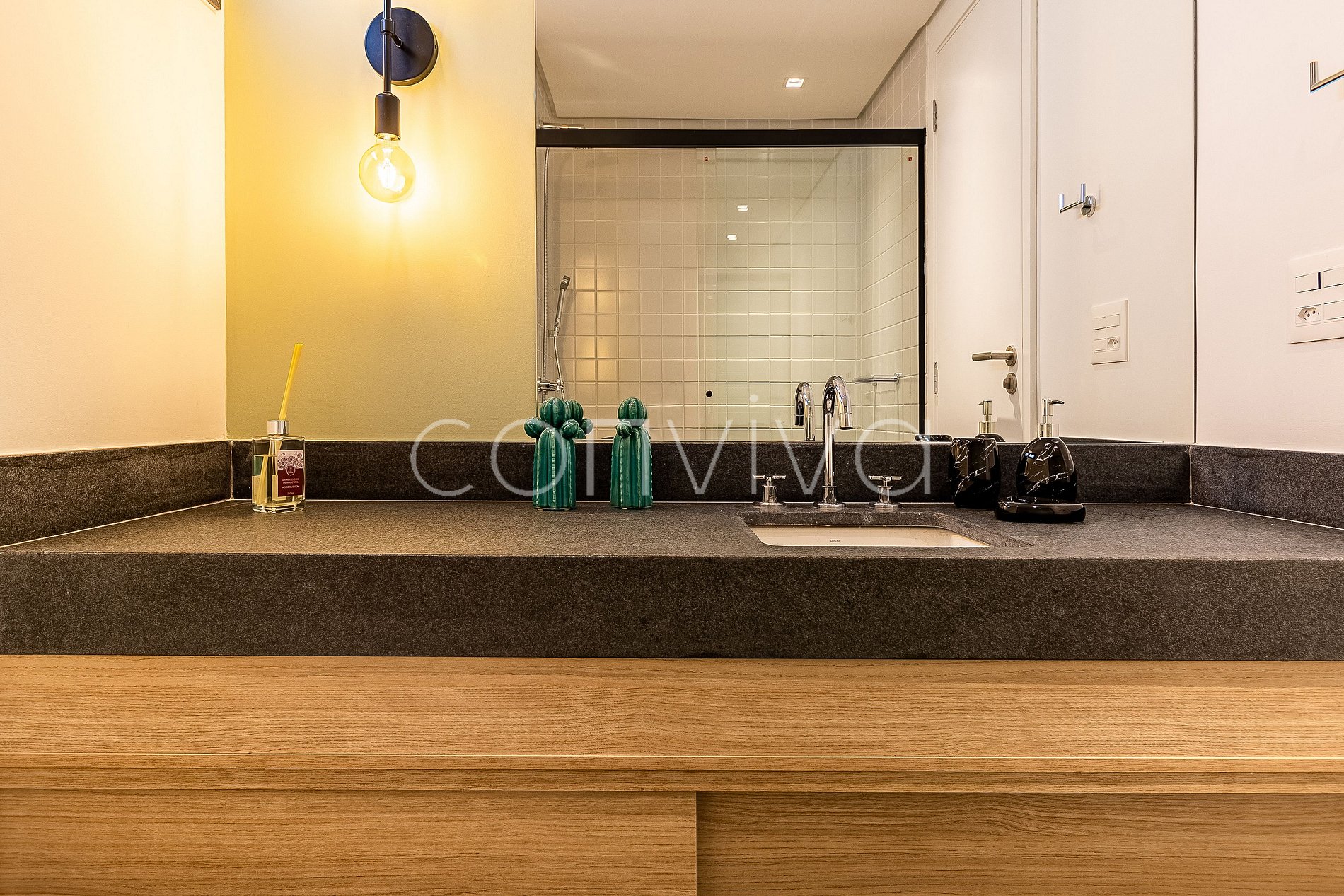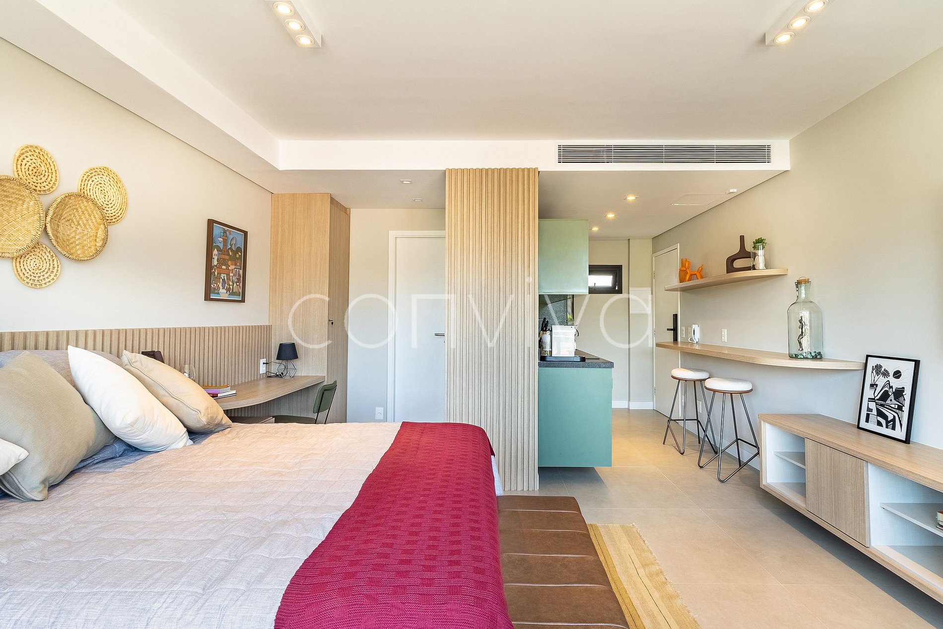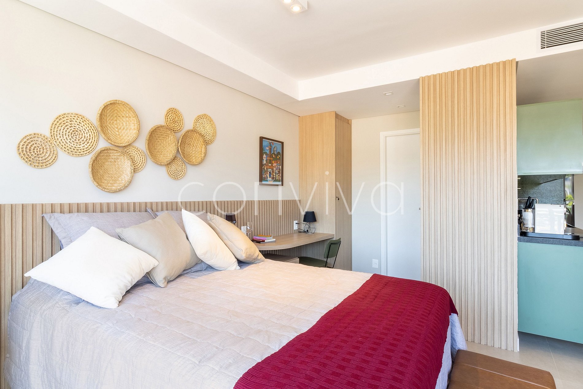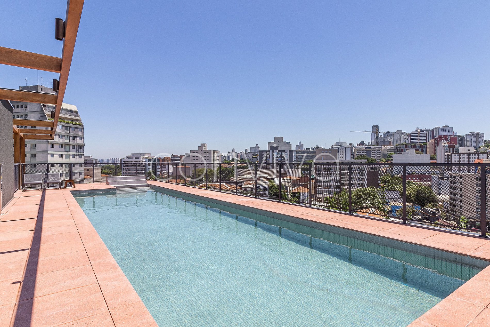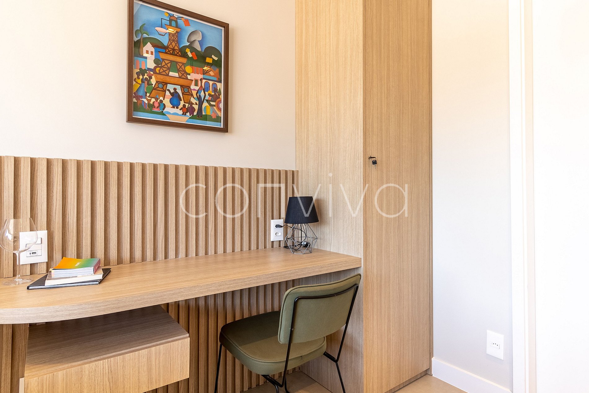 Espaço de 36m², no 3º andar, dispõe de uma cama casal, banheiro, cozinha completa espaçosa, espaço para home office, na melhor localização de Pinheiros.