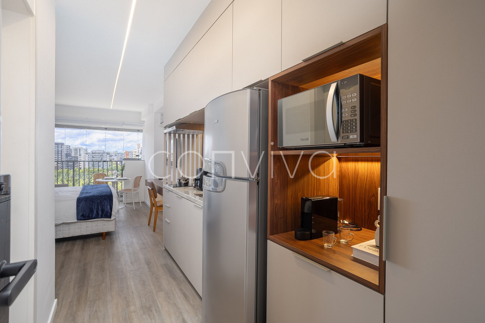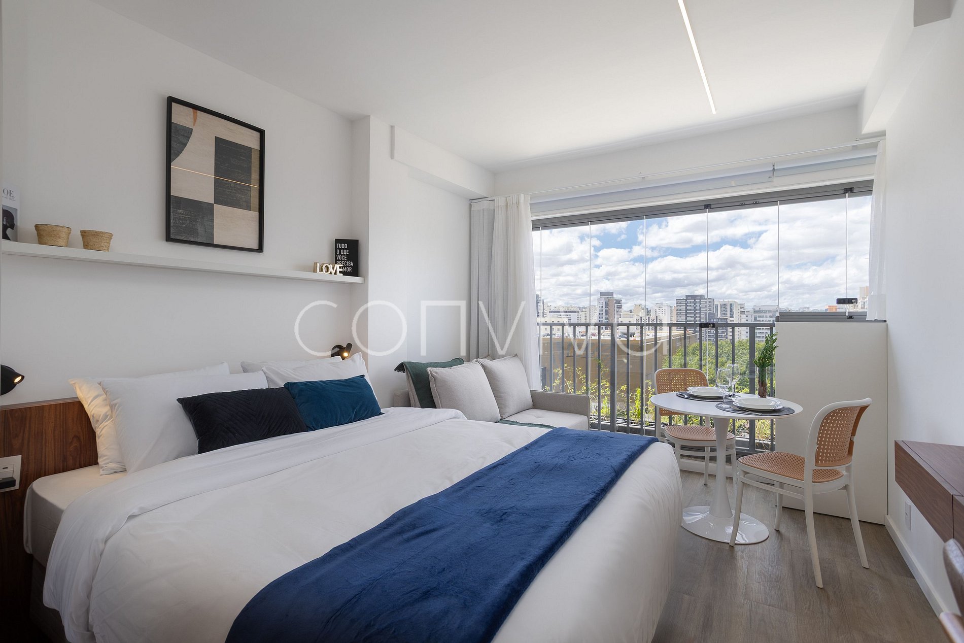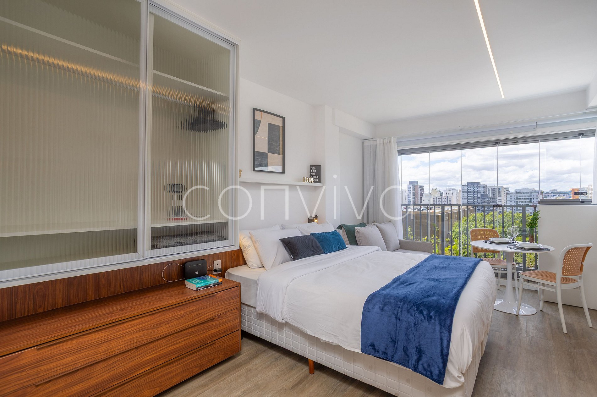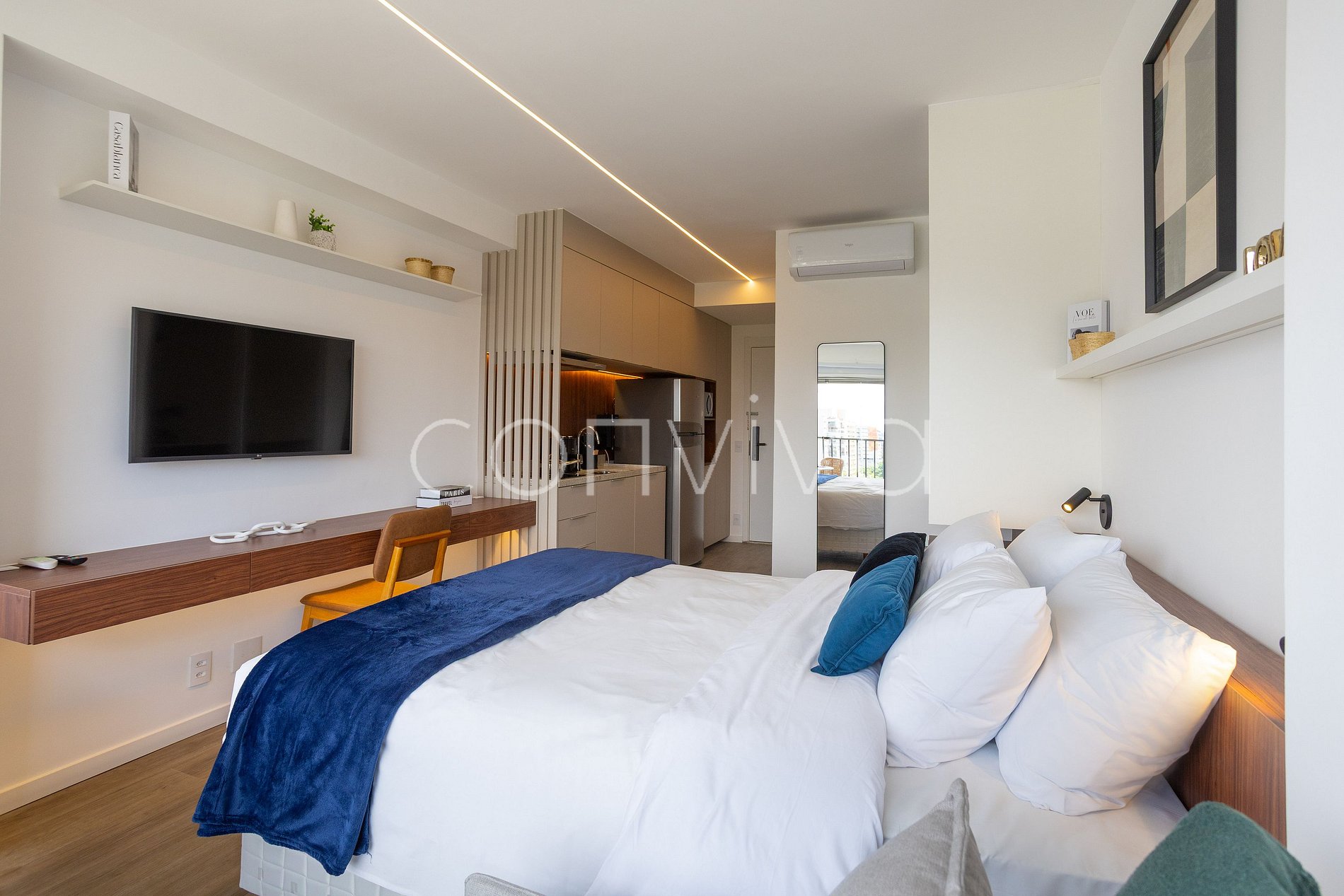 Este apartamento completo conta com cama queen, espaço para home office, sofá-cama, banheiro espaçoso, cozinha totalmente equipada e uma varanda com vista livre da cidade.