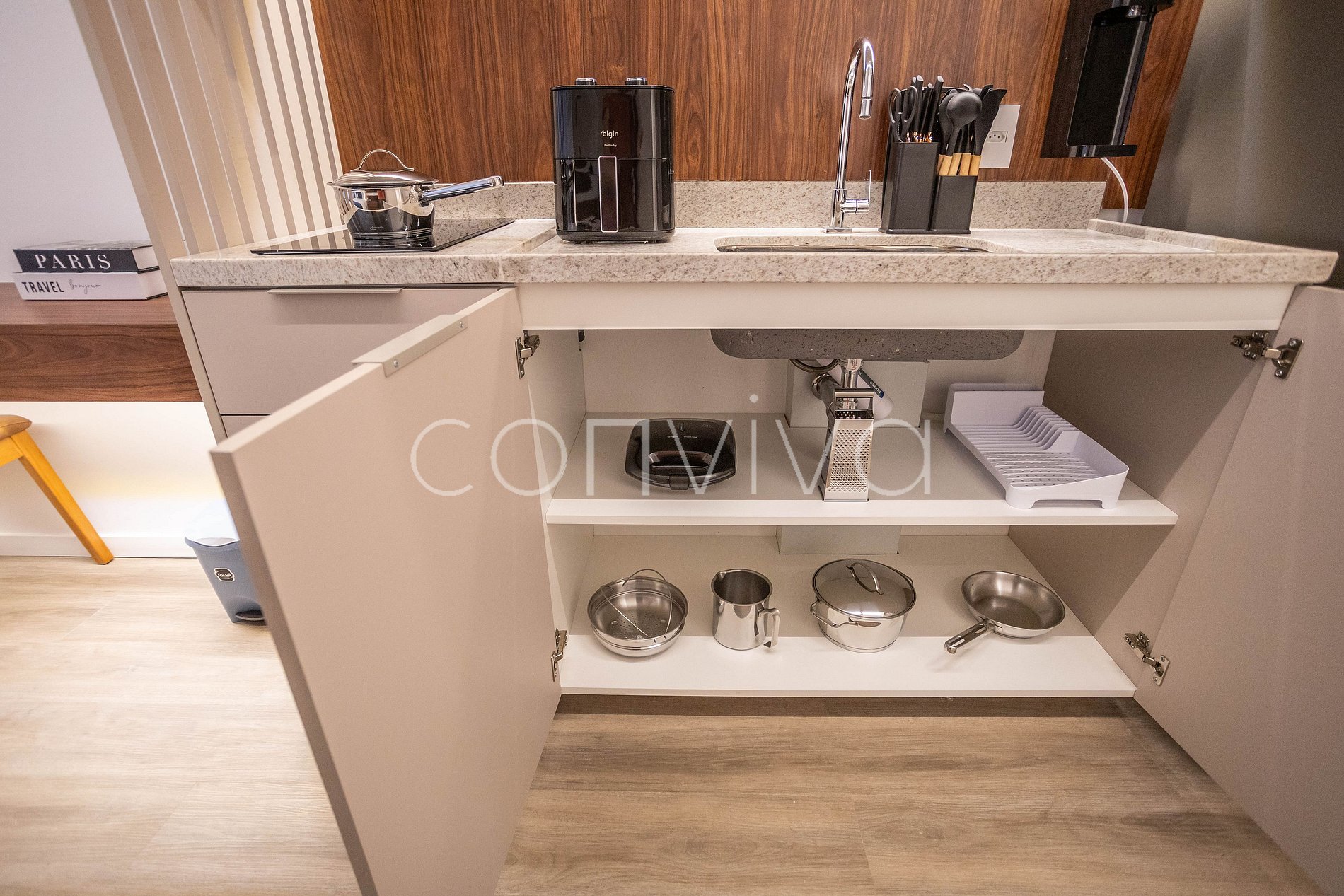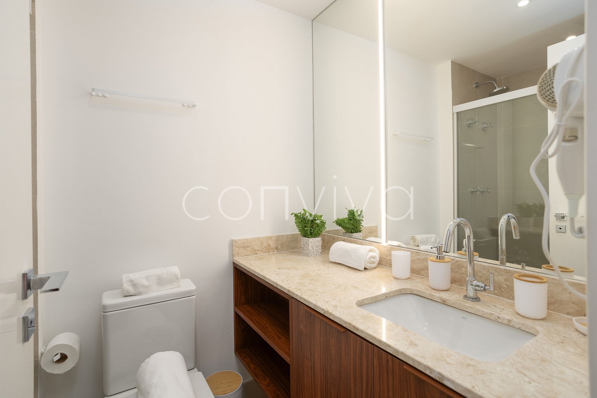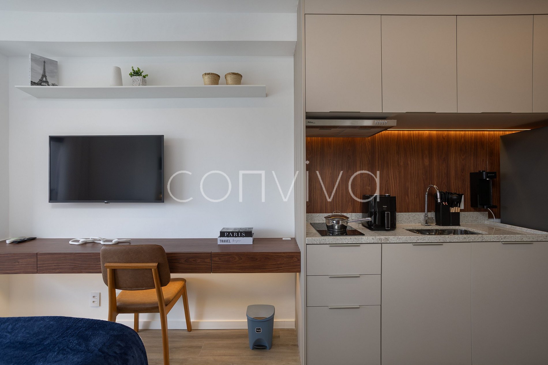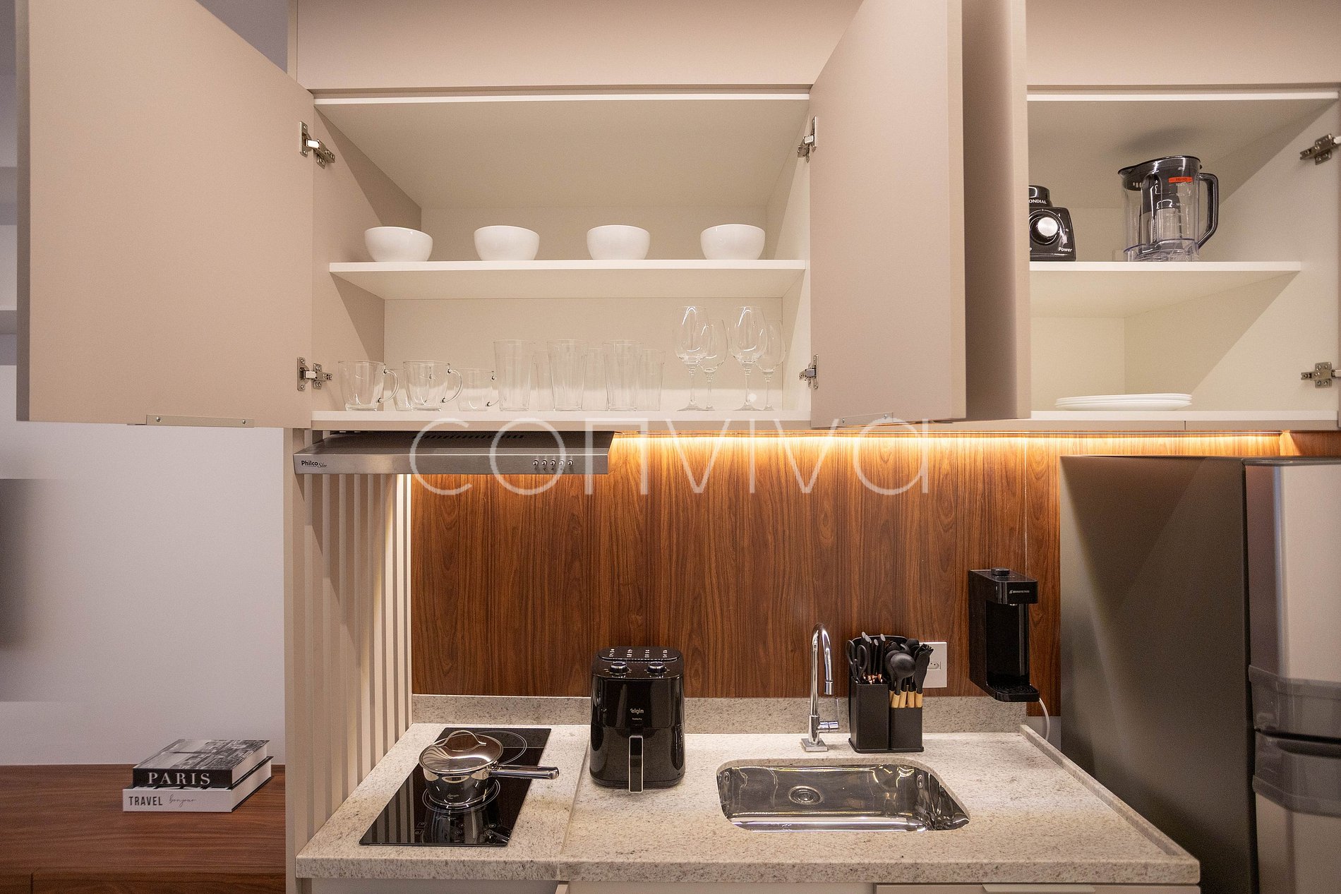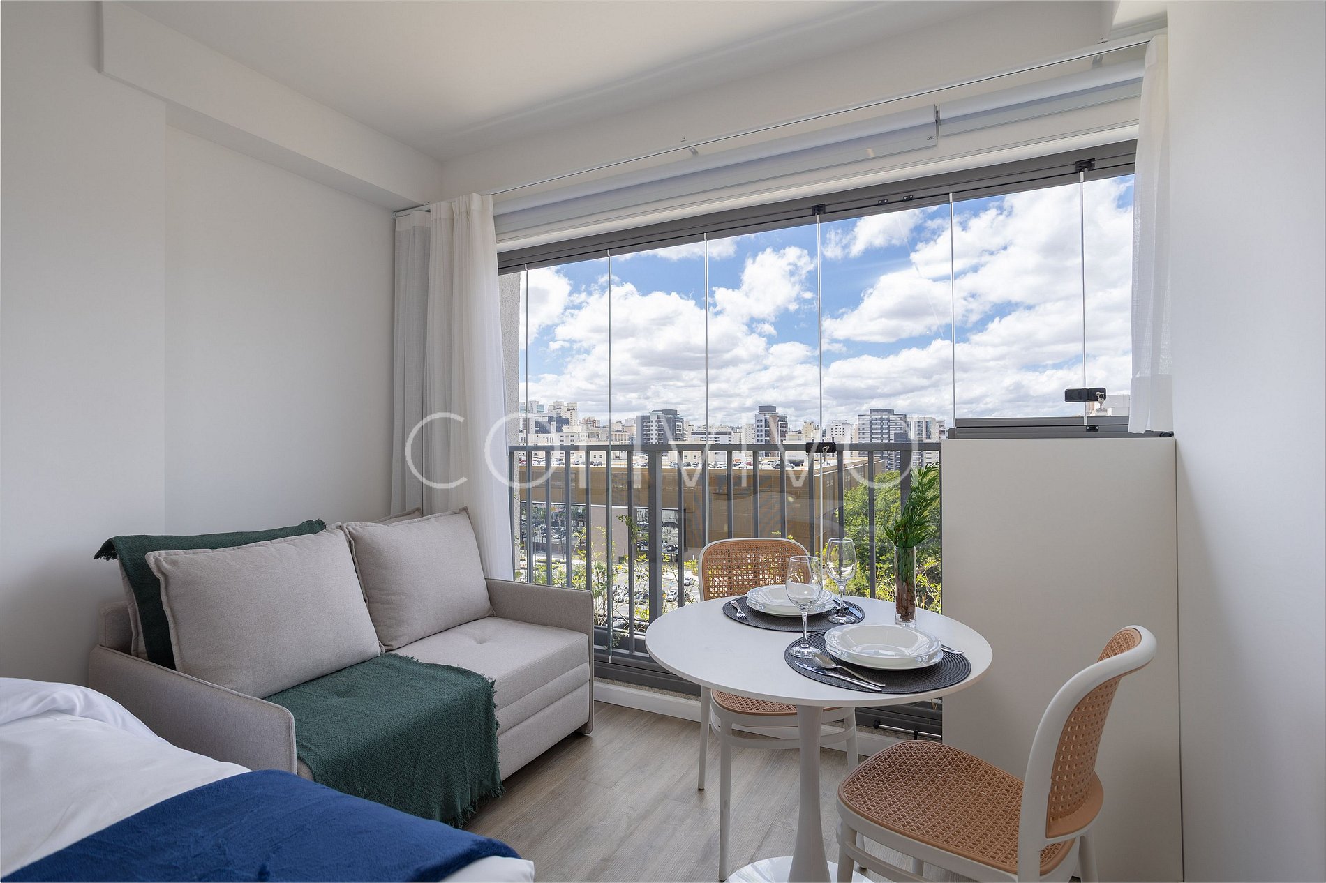 Este apartamento completo conta com cama queen, espaço para home office, sofá-cama, banheiro espaçoso, cozinha totalmente equipada e uma varanda com vista livre da cidade.