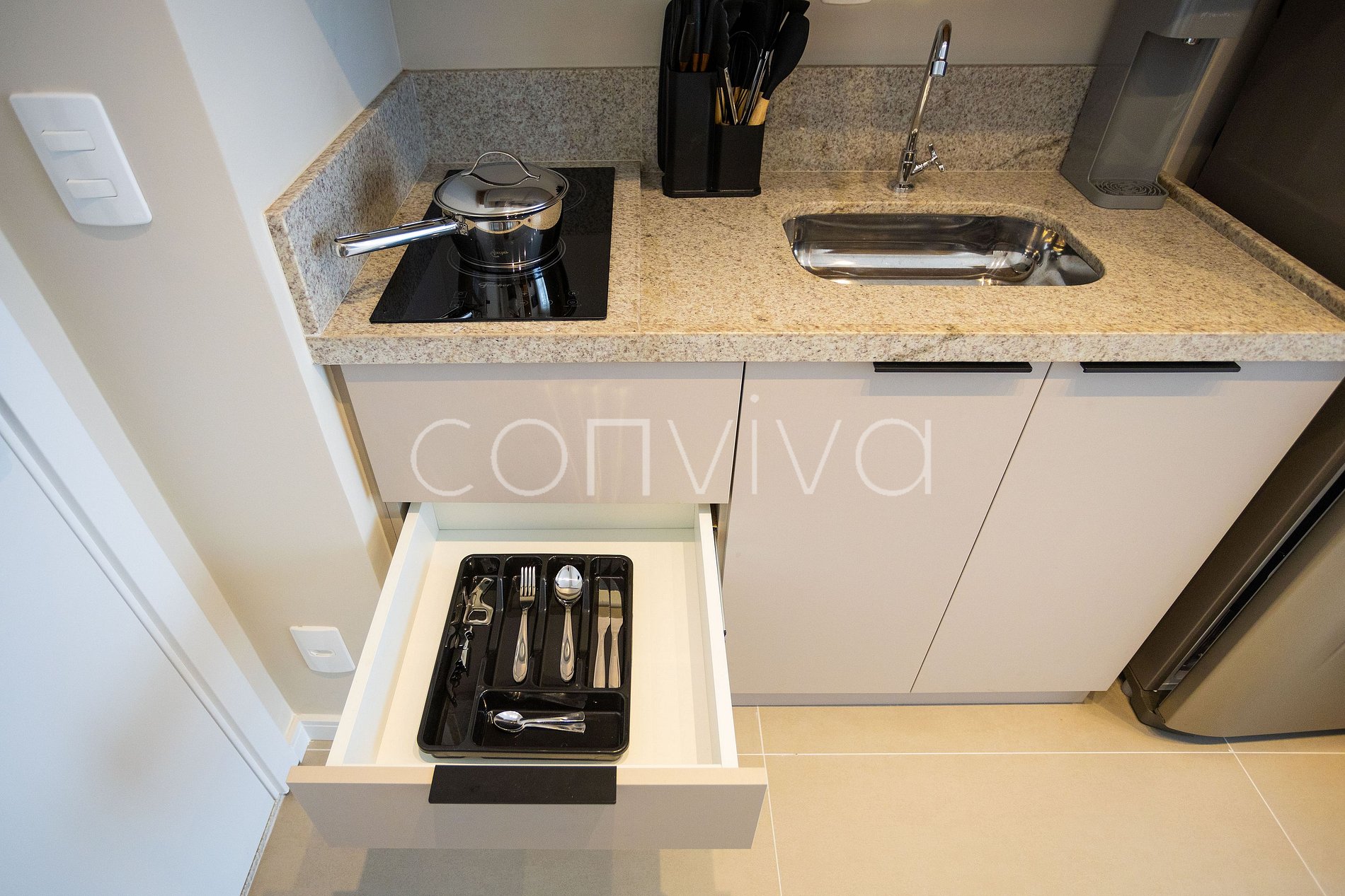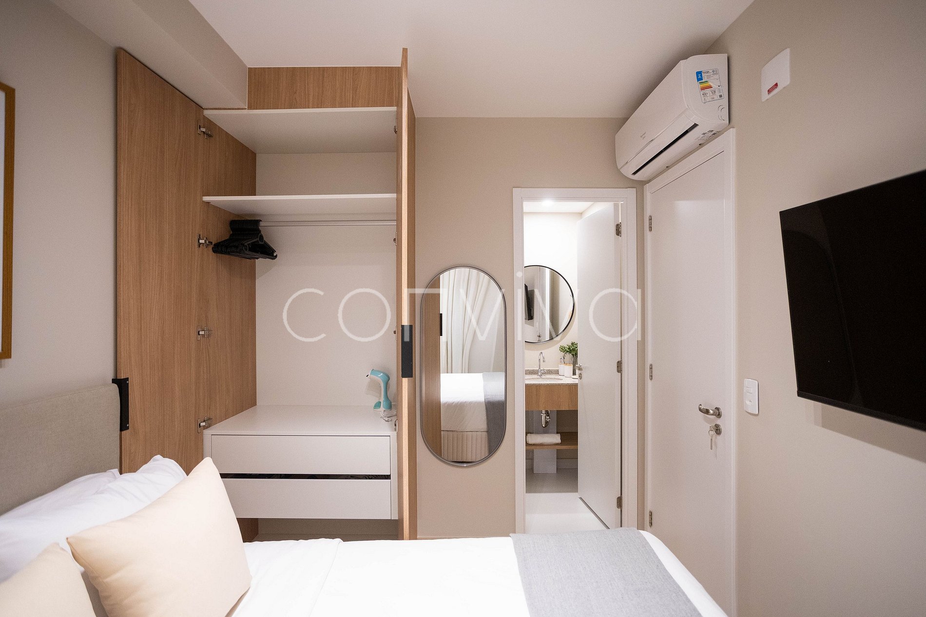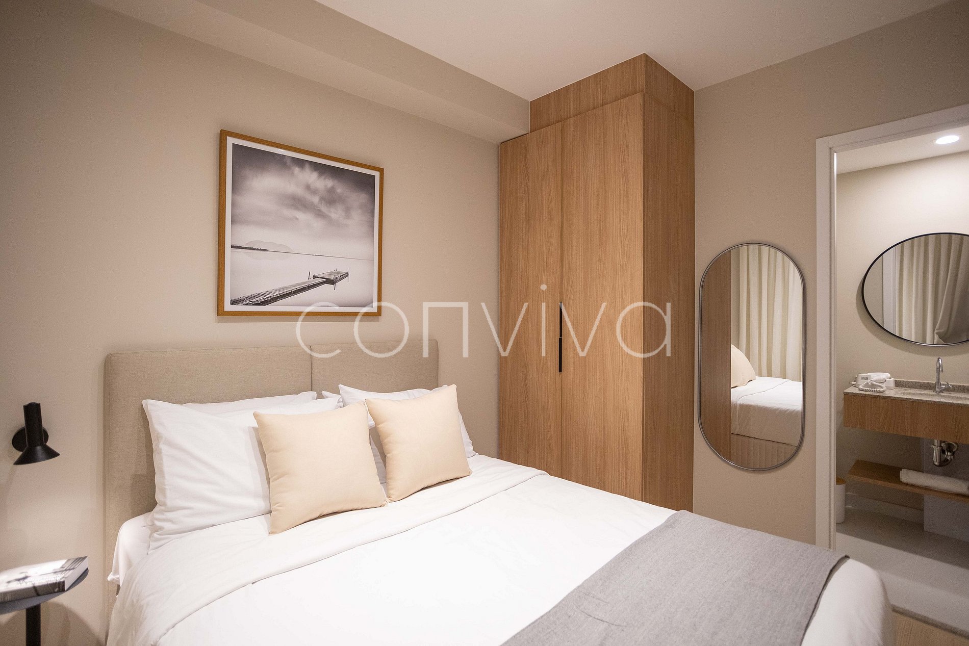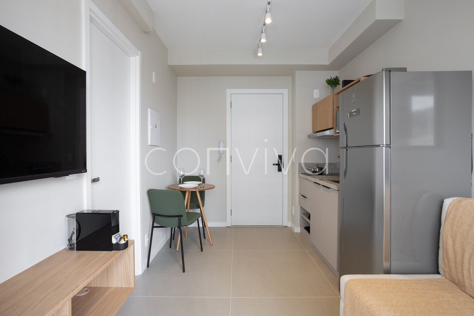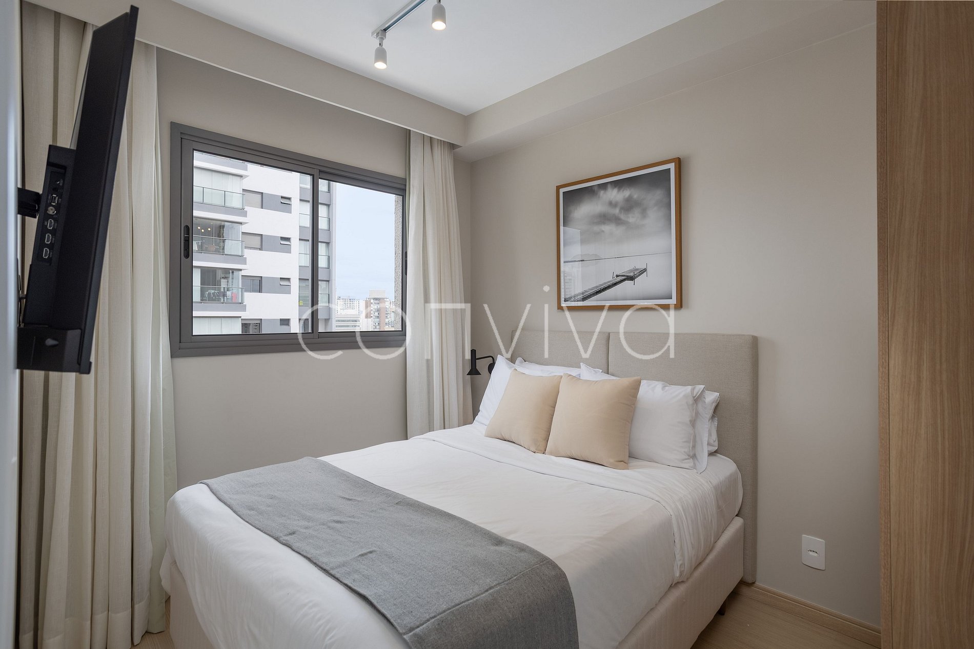 Localizado na melhor região da Vila Nova Conceição, São Paulo. Este moderno apartamento de 26 m² no 15º andar conta com uma cama de casal, banheiro privativo e cozinha compacta totalmente equipada com fogão, micro-ondas, geladeira, além de ar condicionado, Smart TV e área de estar confortável.