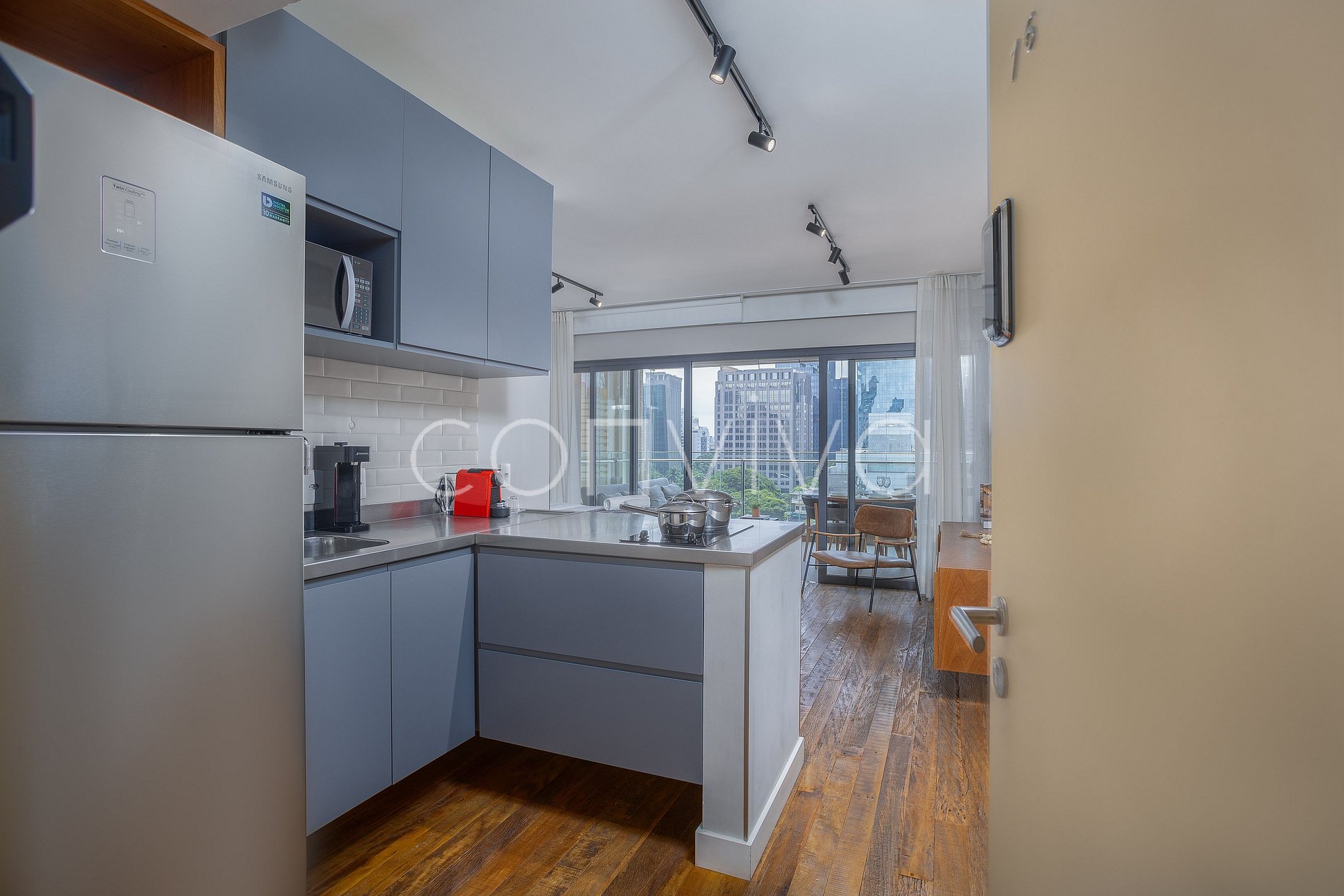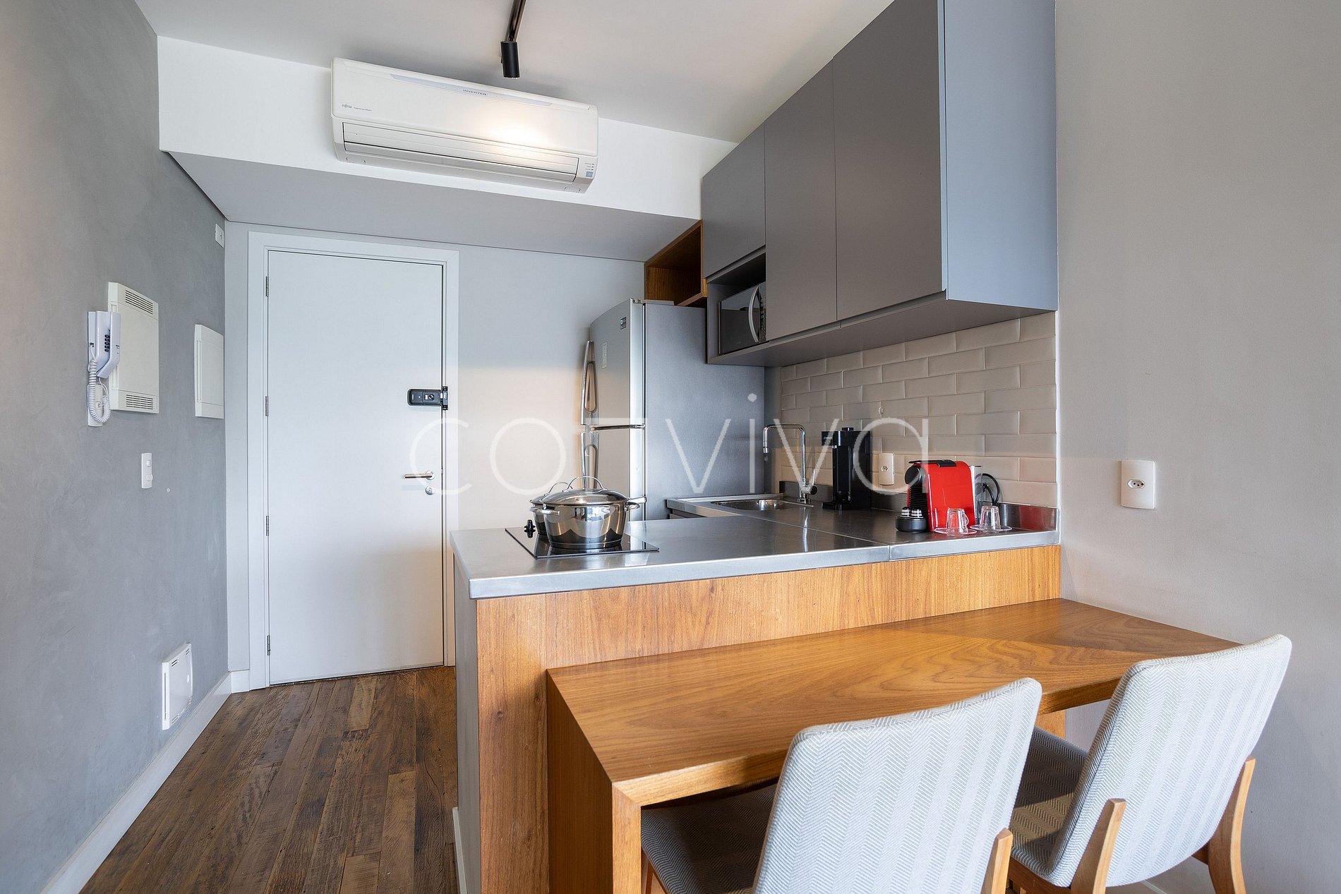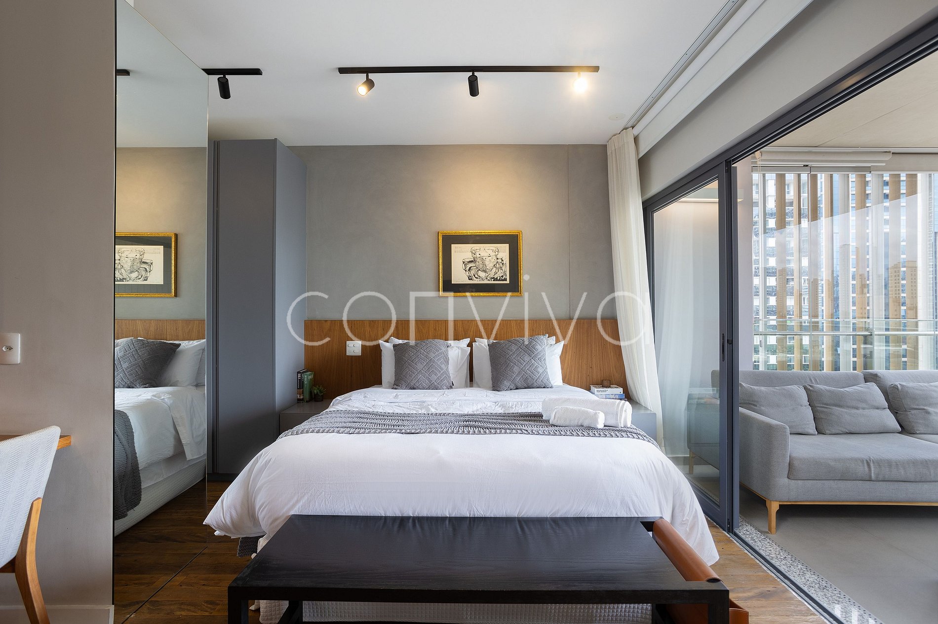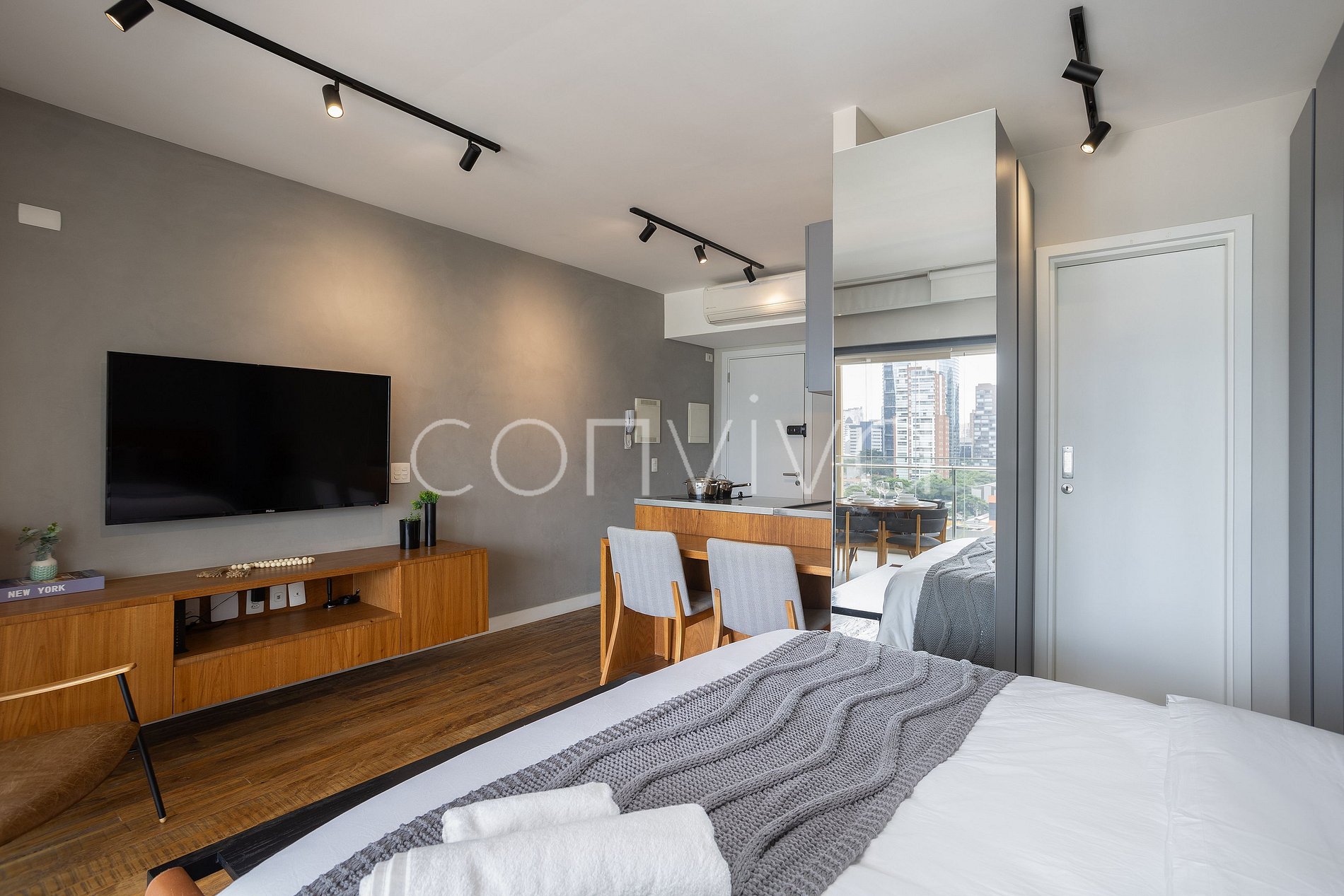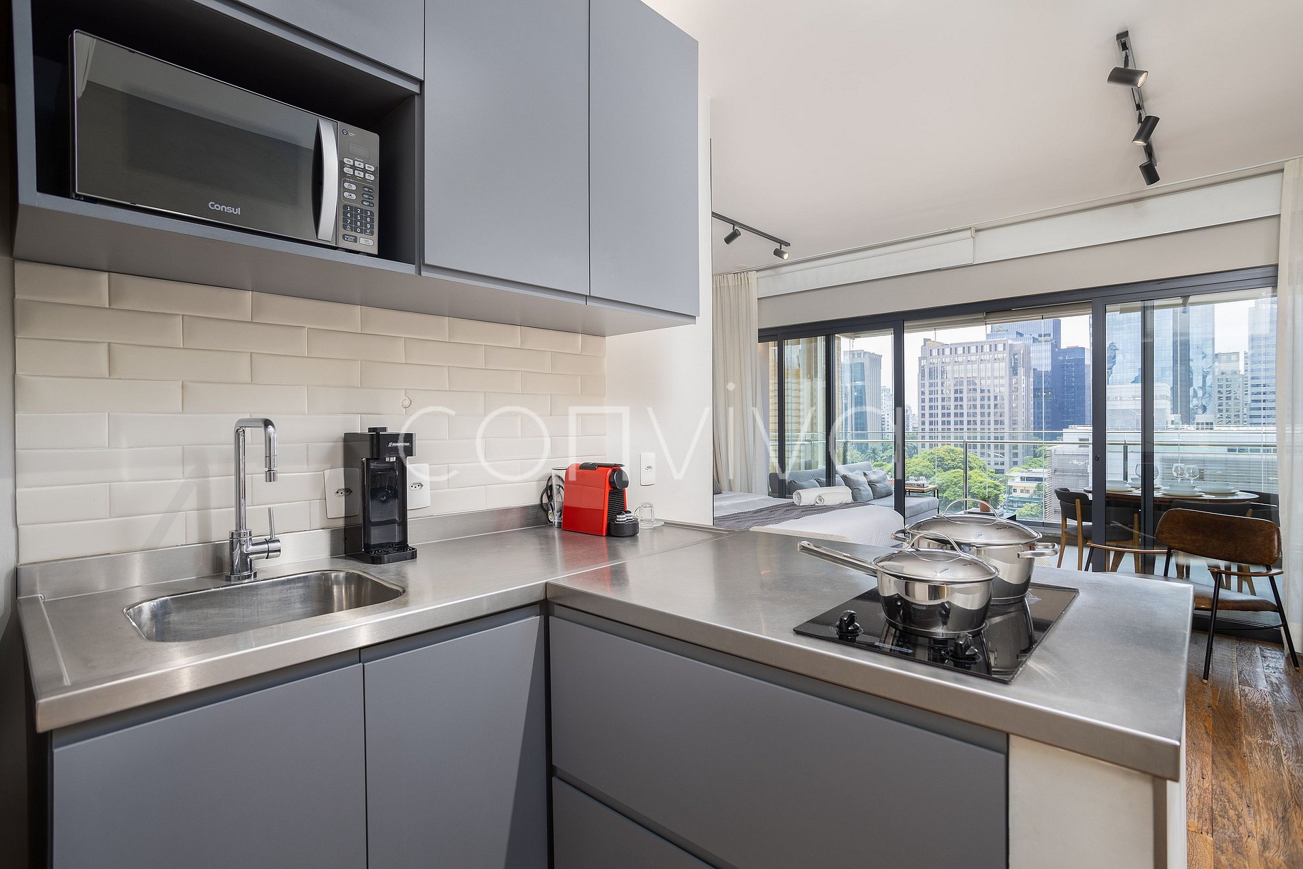 Espaço de 45m², no 7º andar, com cama queen size, banheiro, cozinha bem equipada com itens necessários para sua estadia.