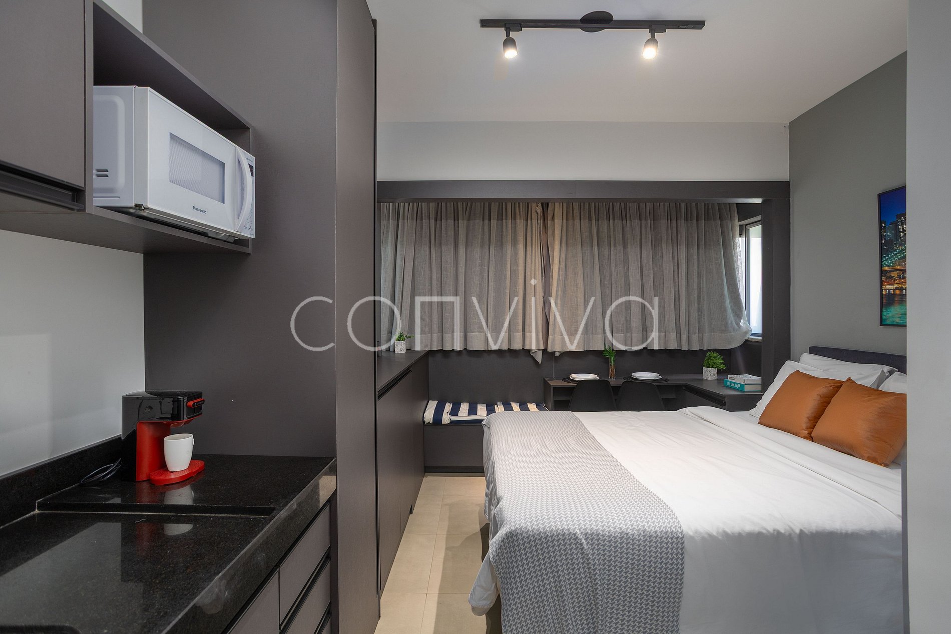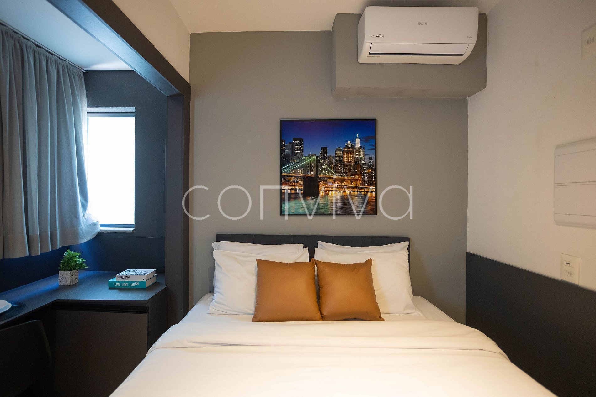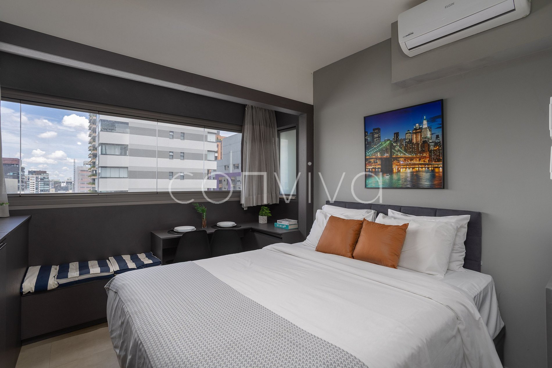 Espaço de 25m² com janela ampla, no 16º andar, composto por uma cama queen size, banheiro espaçoso, cozinha completa espaço para home office e refeições.