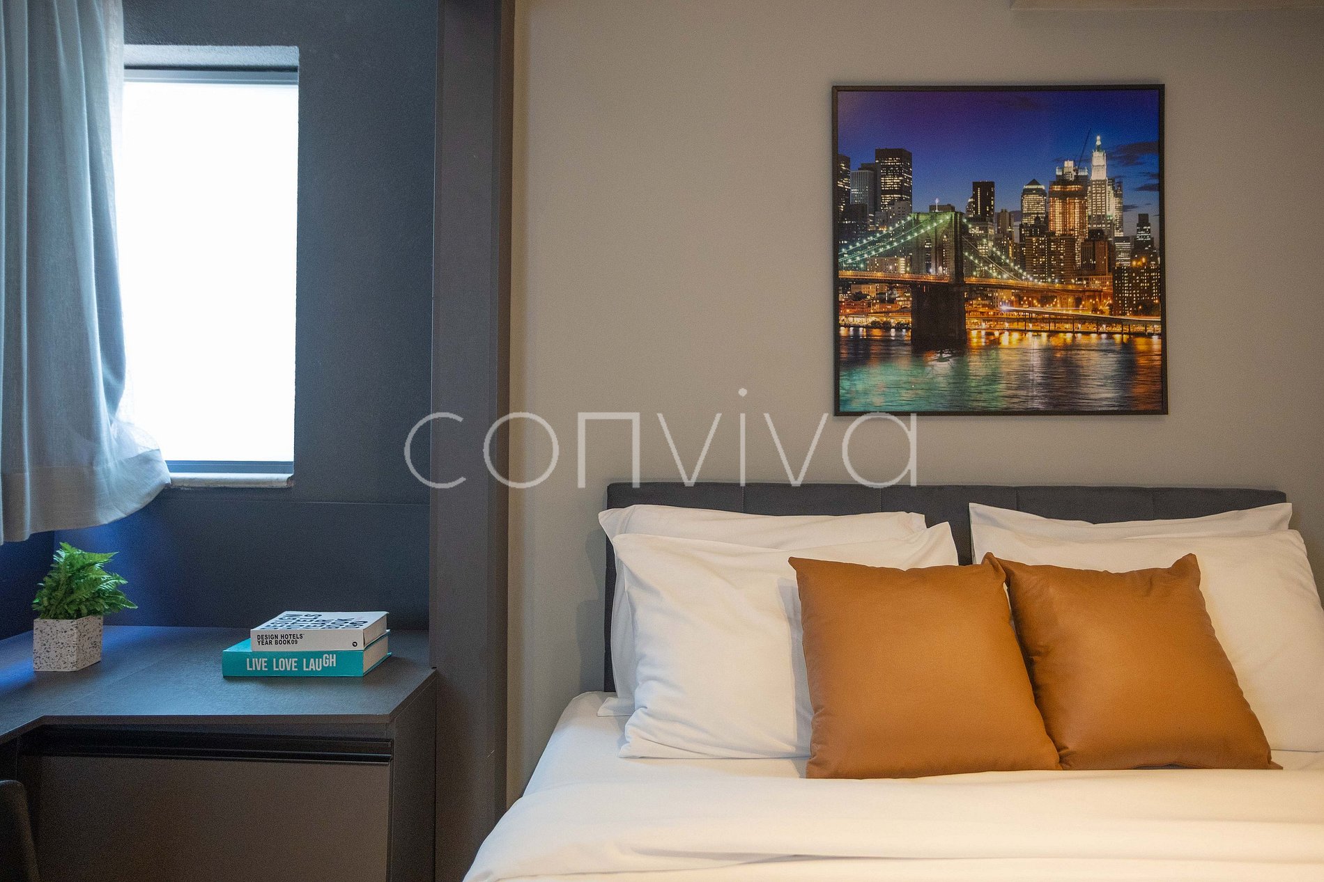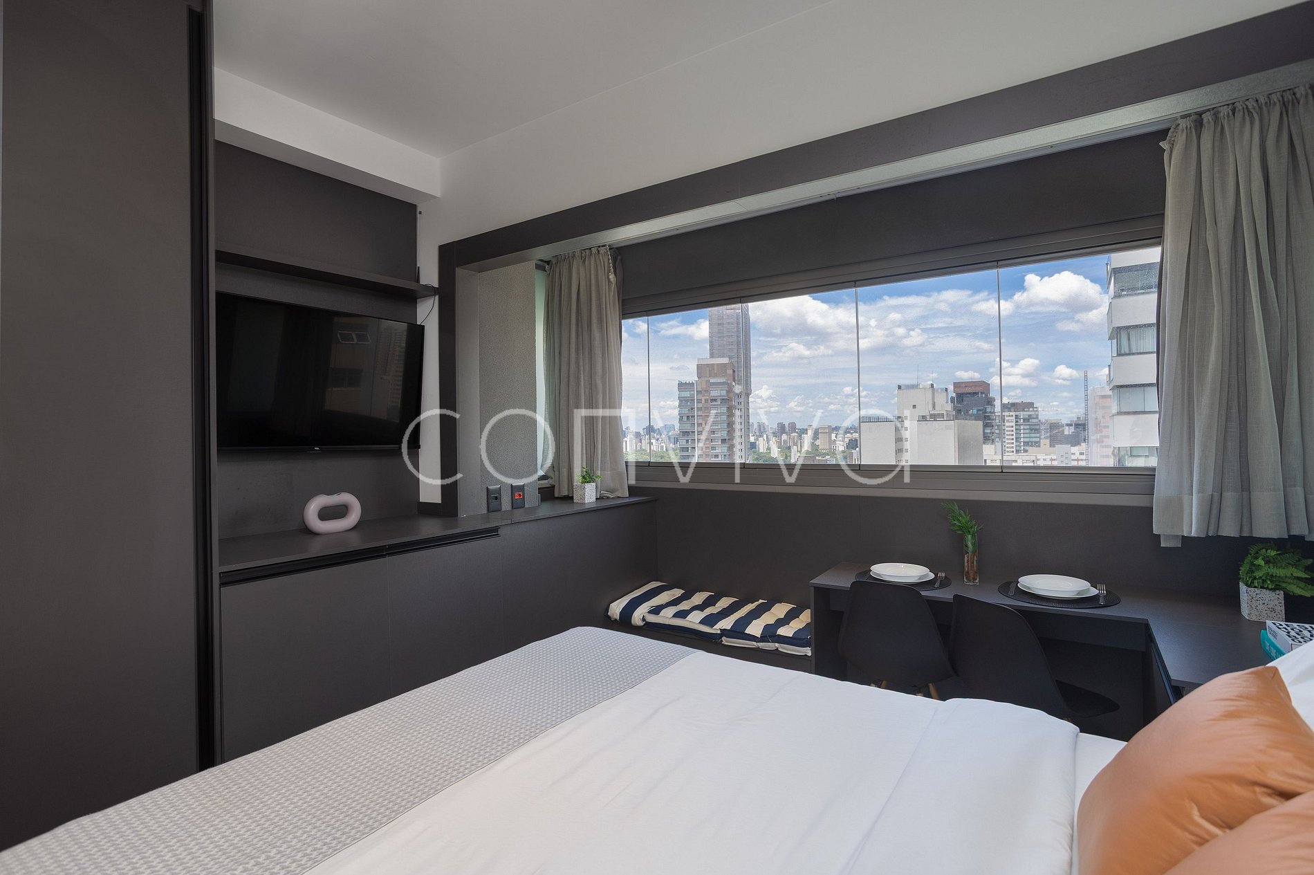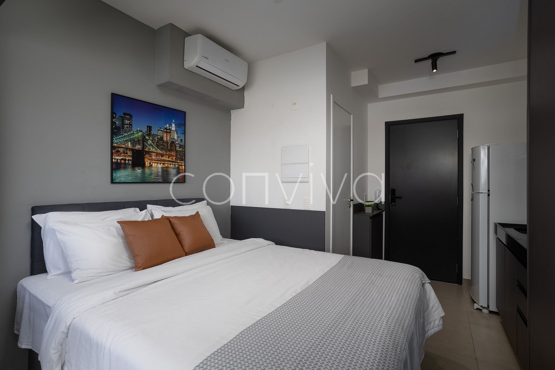 Espaço de 25m² com janela ampla, no 16º andar, composto por uma cama queen size, banheiro espaçoso, cozinha completa espaço para home office e refeições.
