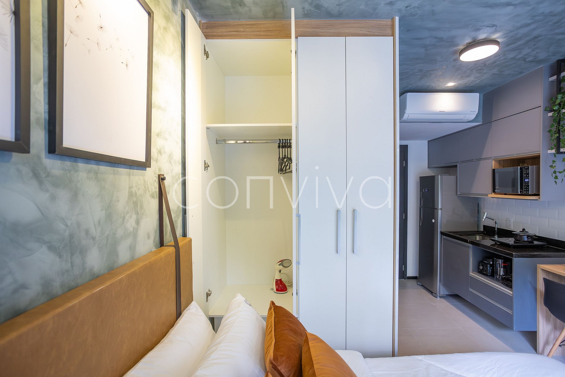 Espaço bem decorado de 23m², no 5º andar, dispõe de uma cama de casal, cozinha compacta e banheiro.
