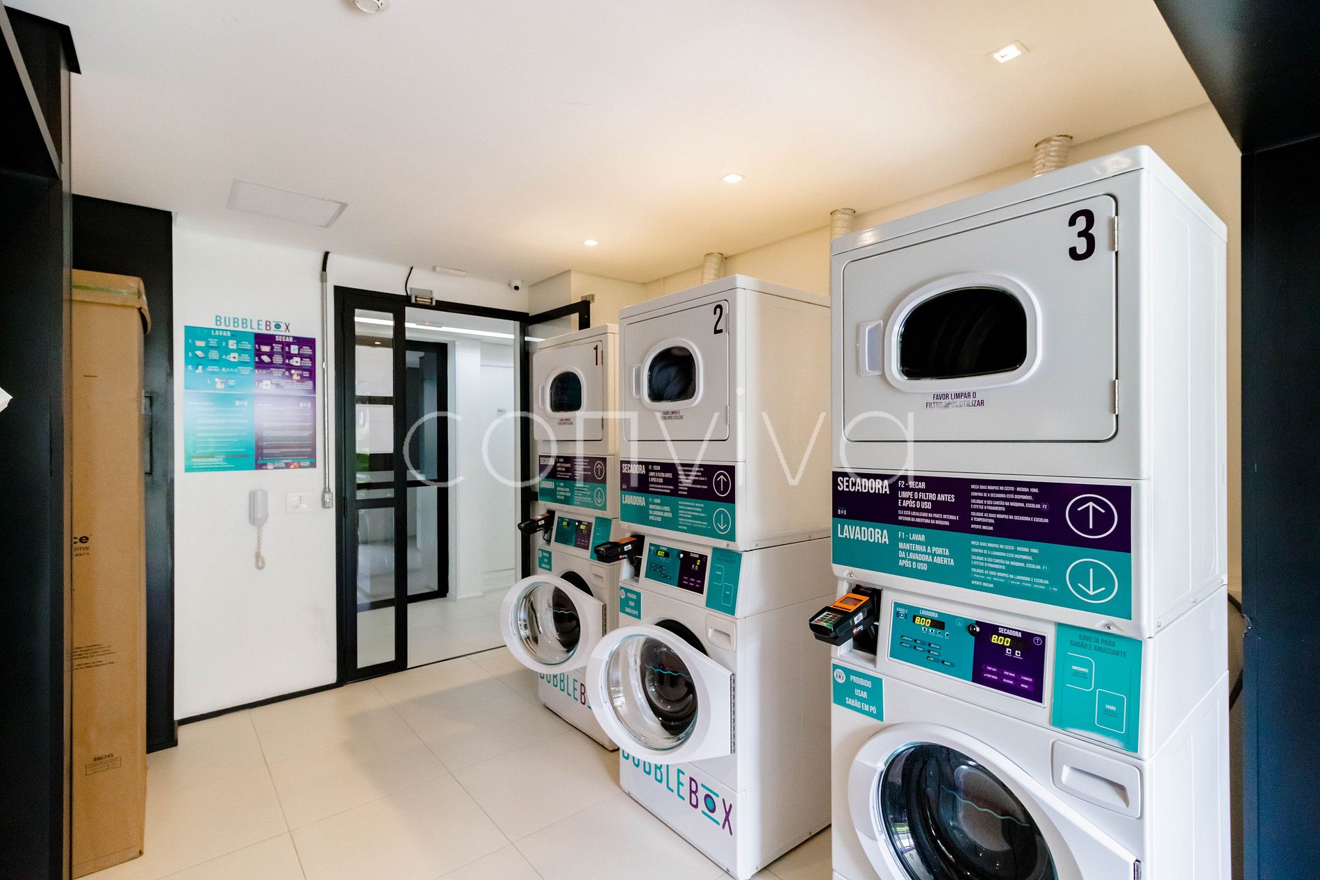 Há uma lavanderia coletiva no prédio que pode ser utilizada mediante pagamento com cartão de crédito/débito na própria máquina.
