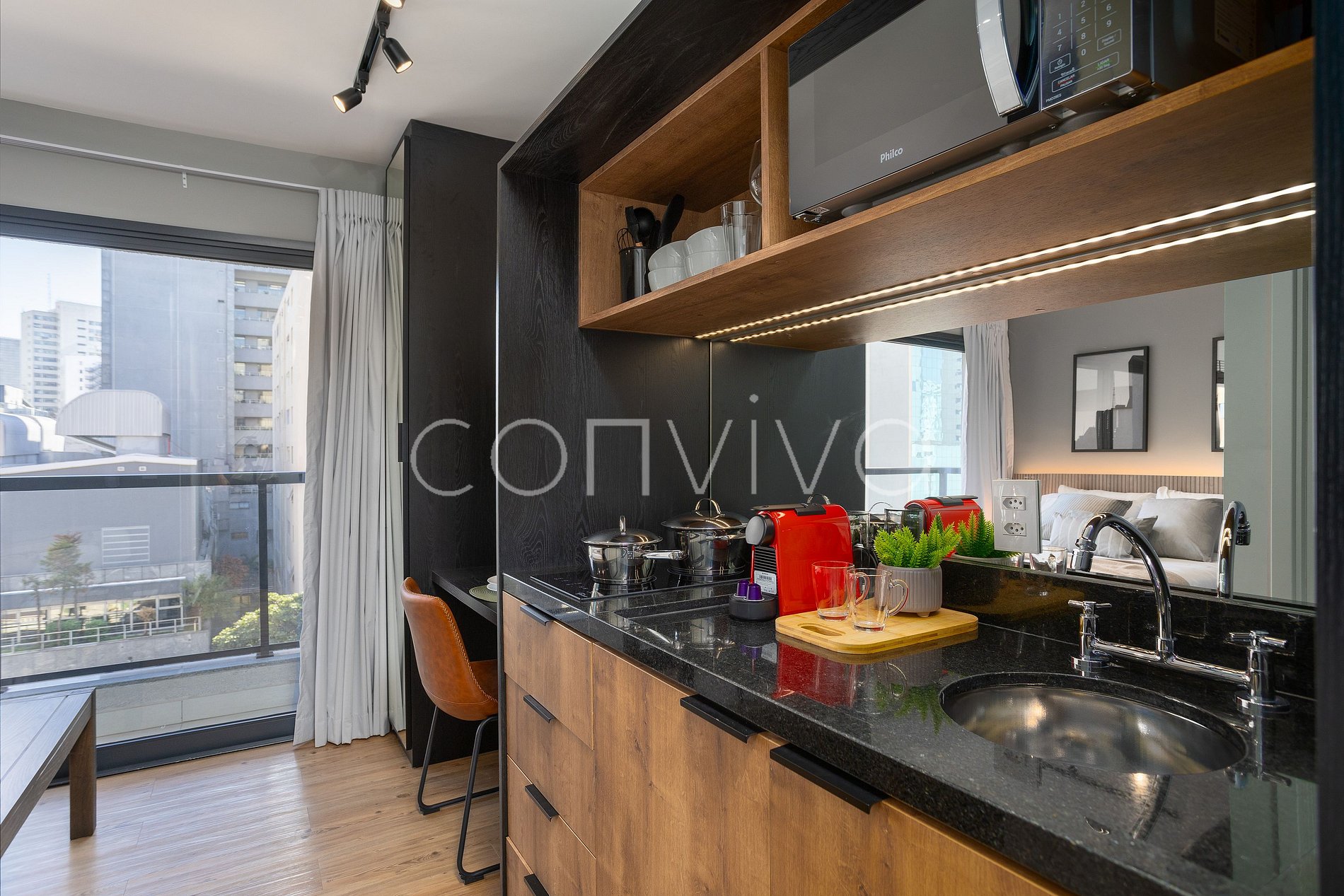 Espaço de 25m², no 7º andar, composto por uma cama casal, banheiro, varanda e cozinha completa.