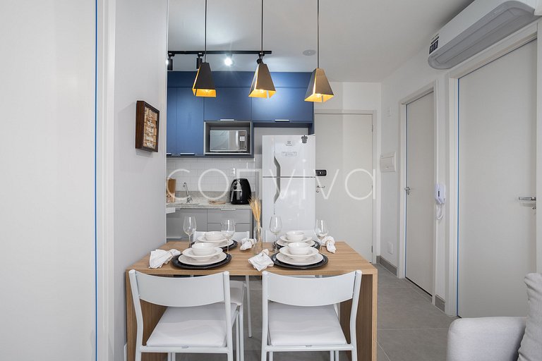 Este apartamento completo conta com dois quartos, um com uma cama de casal e outro com uma bicama de solteiro e espaço para home office, sofá-cama na sala, banheiro espaçoso, cozinha totalmente equipada e uma varanda com vista para o bairro.