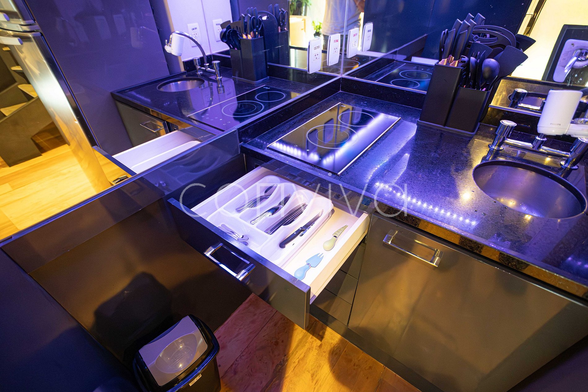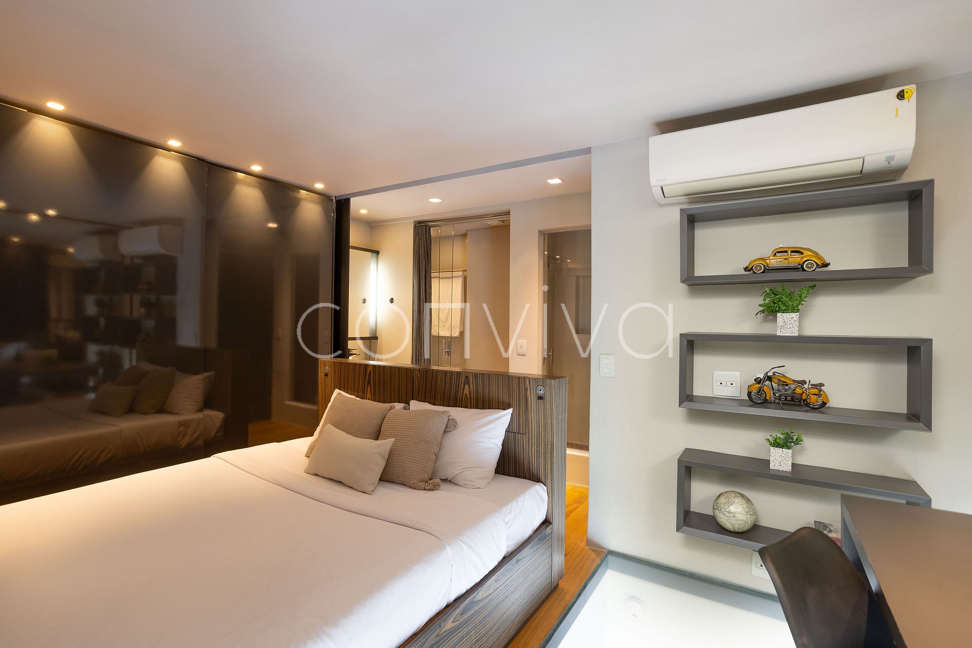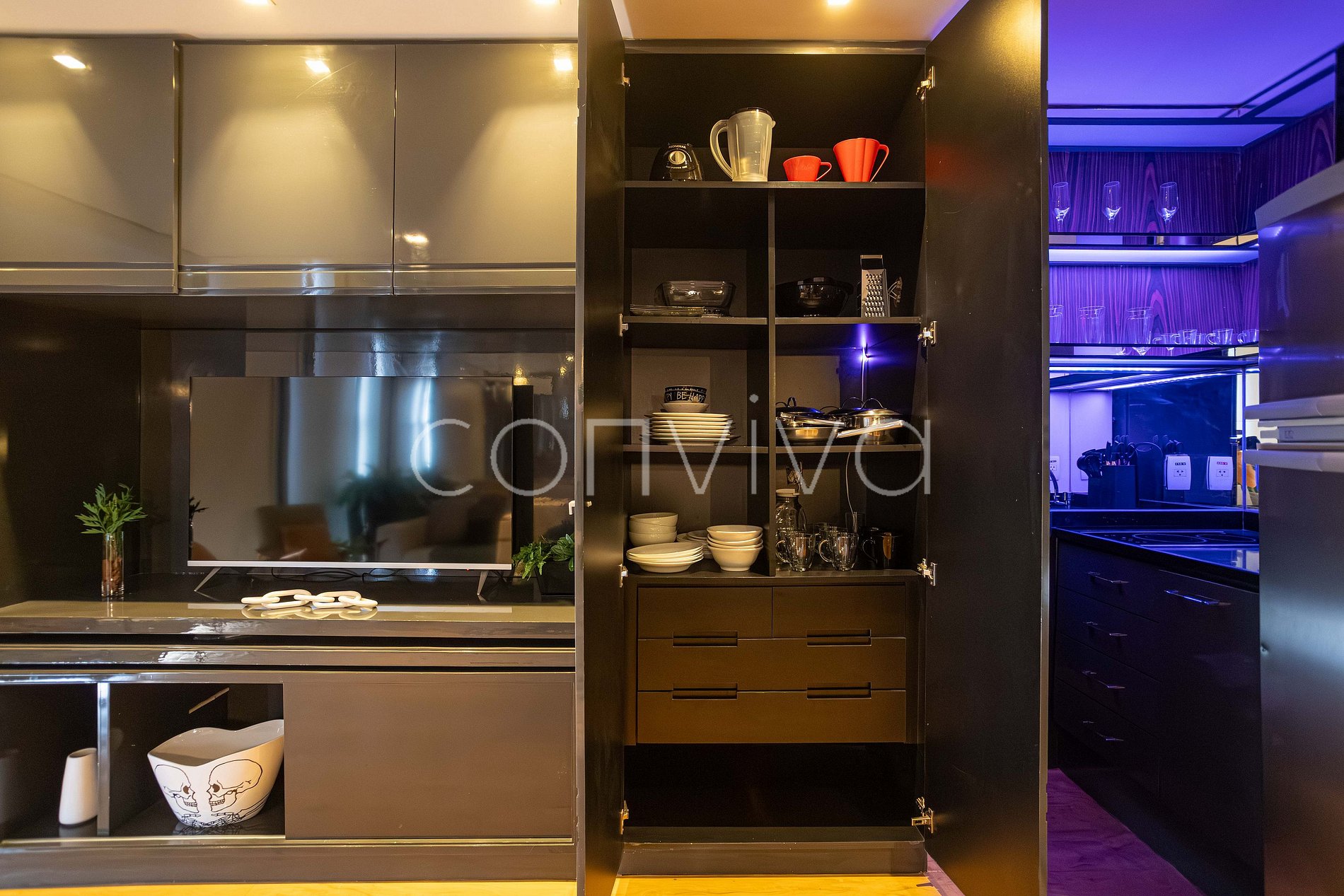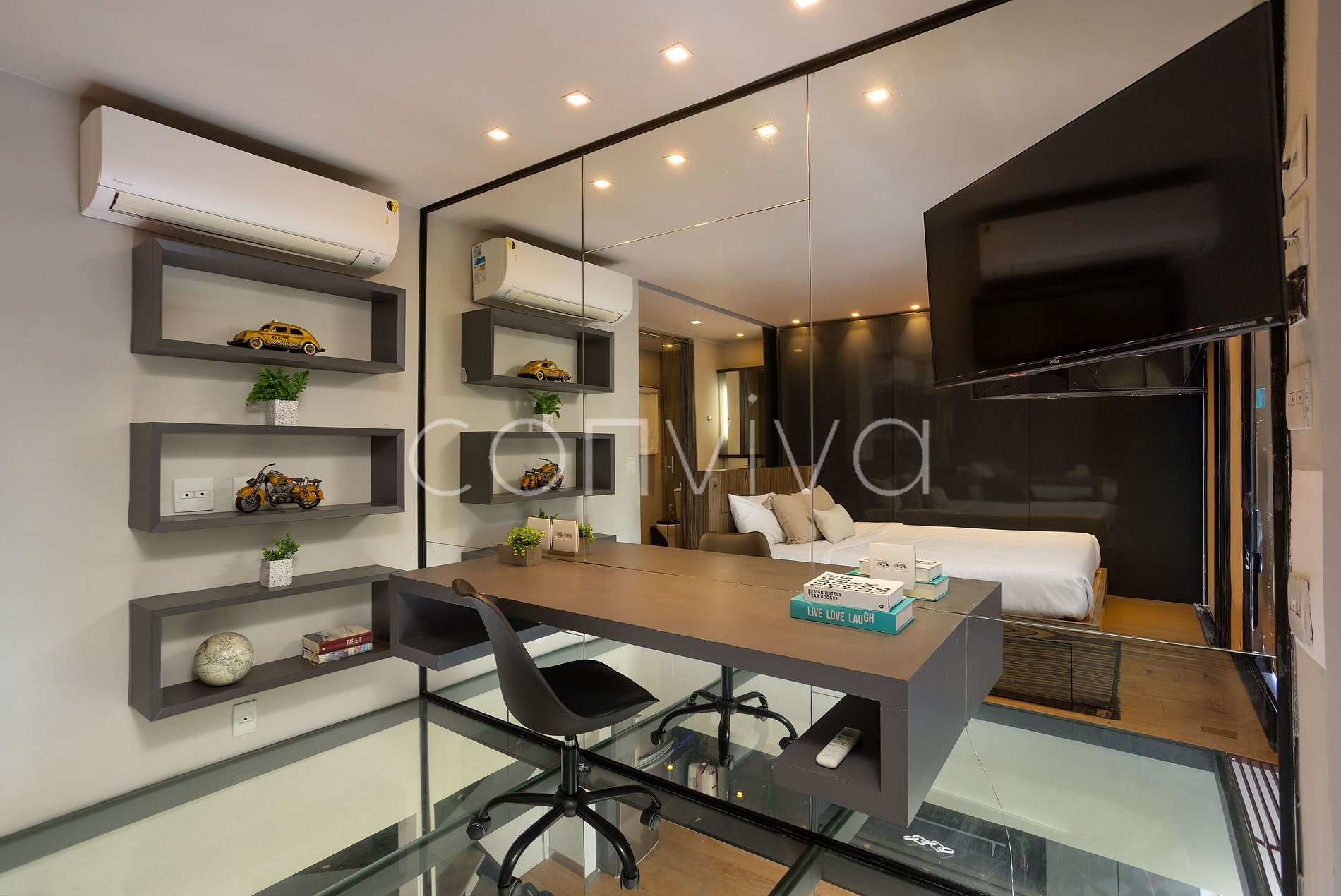 Com 48m², no 14º andar, o duplex dispõe de dois andares, suíte com cama queen e espaço para home office, banheiro espaçoso, sala ampla com sofá, cozinha completa bem equipada, com limpeza básica inclusa de segunda a sexta.