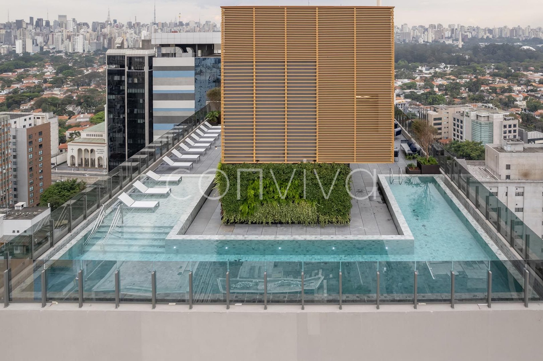 O edifício conta com portaria 24h, piscina na cobertura, academia, espaço coworking no térreo e lavanderia no 25º andar.