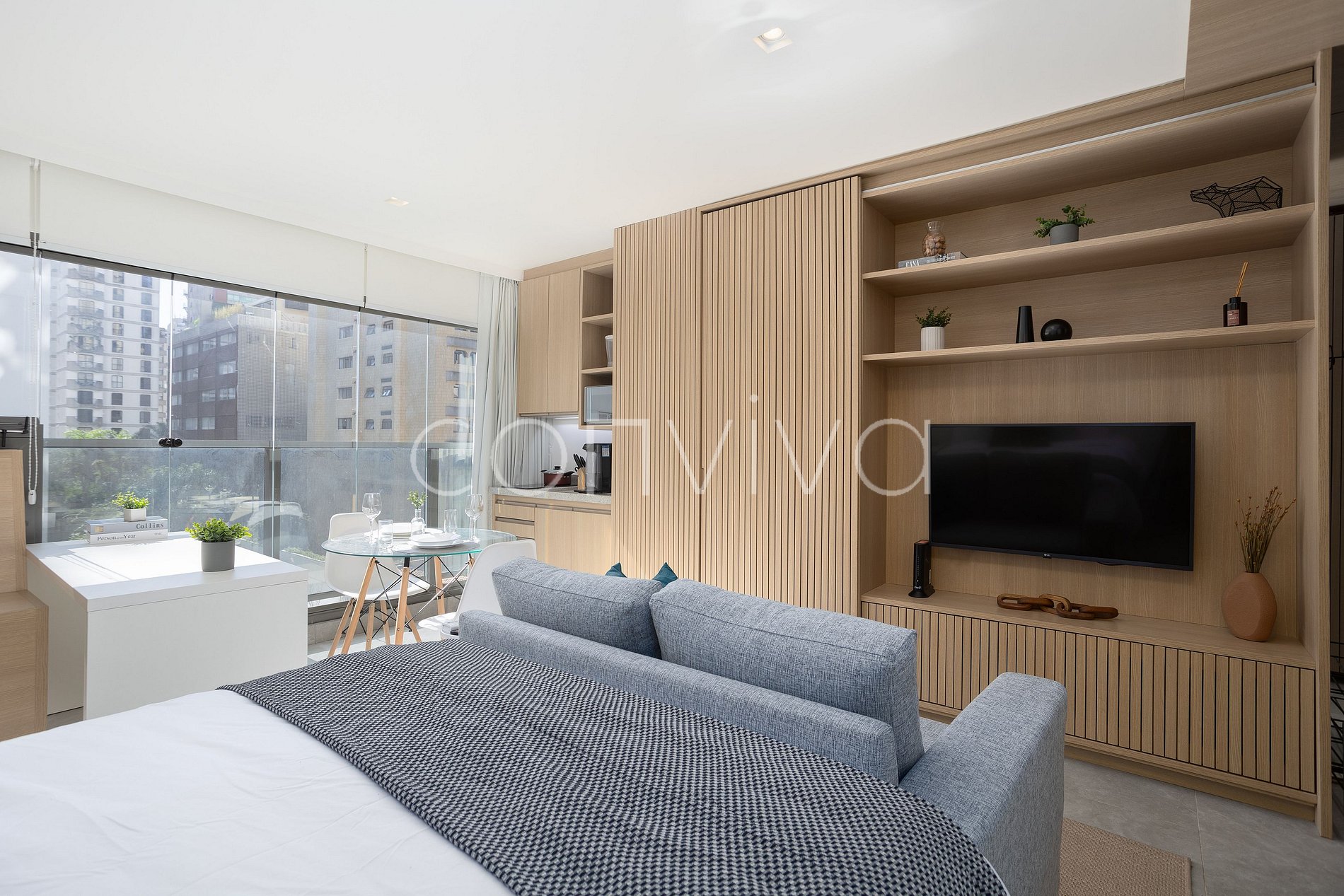Espaço charmoso de 28m², no 5º andar, com uma cama casal, varanda integrada, sofá, espaço para home office, ambiente para refeições, cozinha completa e banheiro espaçoso.